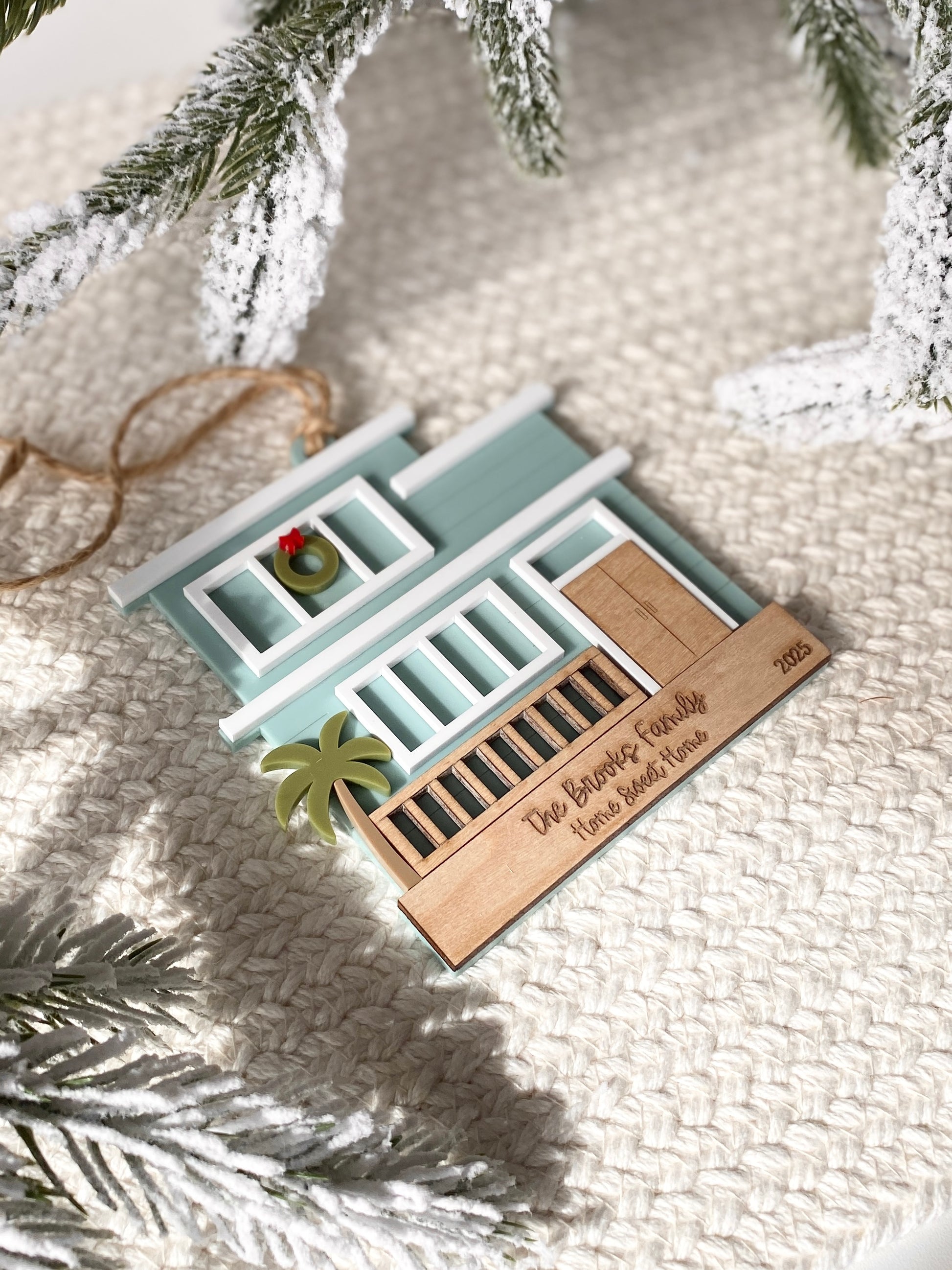 Bring a little coastal charm to your holiday tree with this Personalized Beach House Ornament. Made from a combination of natural wood and acrylic, this keepsake captures the warmth of a seaside Christmas. The ornament features a modern yet cozy beach house accented with a palm tree and a festive wreath on the front door for a perfect holiday touch.