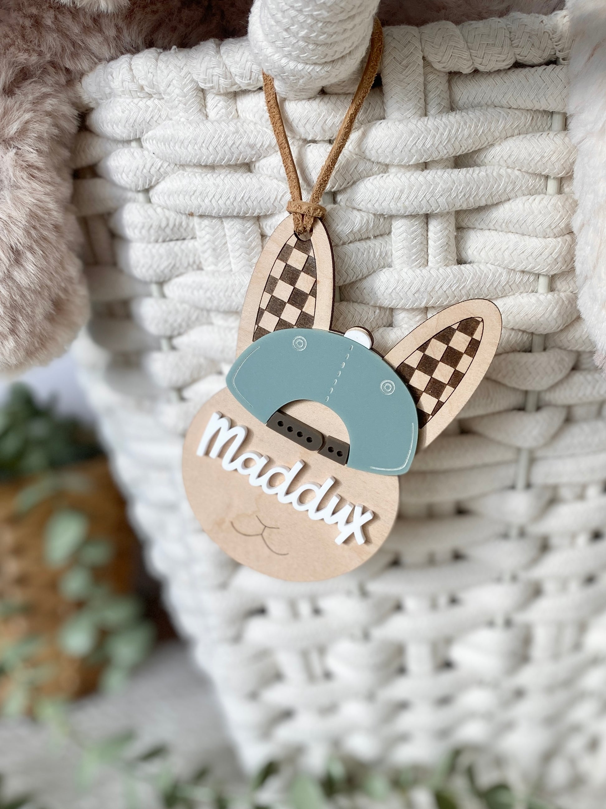 This playful layered bunny features custom wood with acrylic lettering and a charming little hat detail, giving it a modern, storybook feel that stands out on any basket.