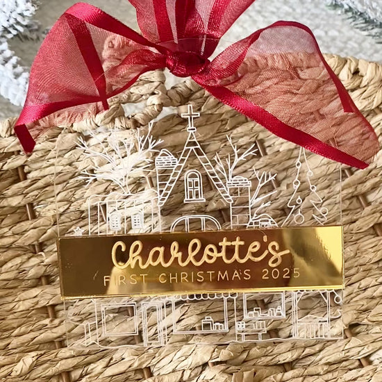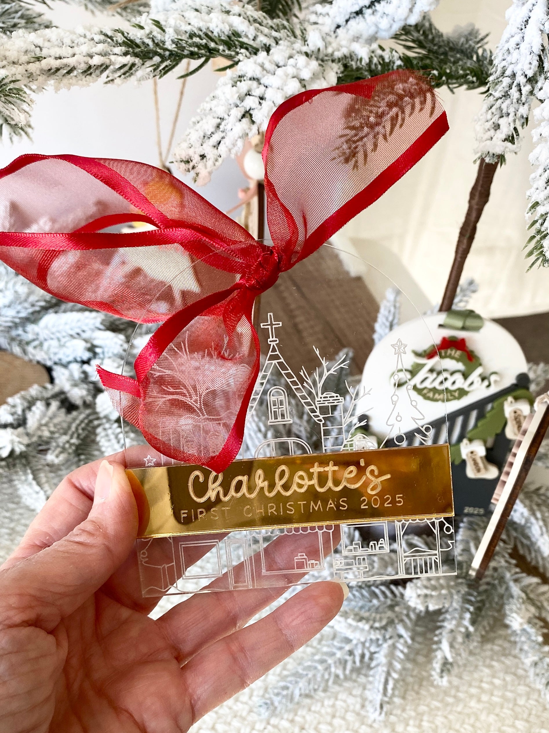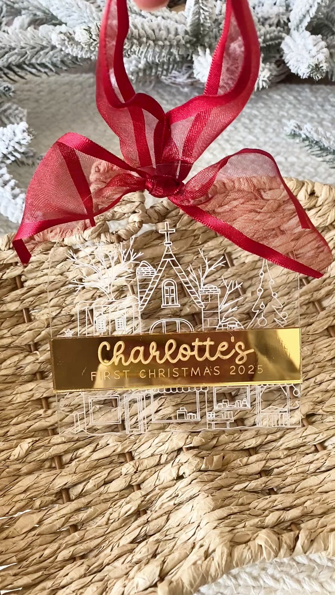 Crafted from clear acrylic, the ornament features a delicately engraved village scene ~ cozy houses, twinkling trees, and a church steeple ~ paired with a mirror gold nameplate engraved with your child’s name and year. Finished with a festive red ribbon, this ornament captures the wonder of the season and the joy of a very first Christmas.