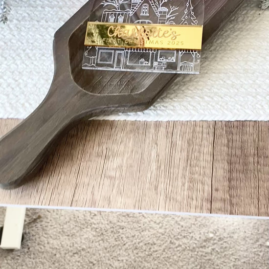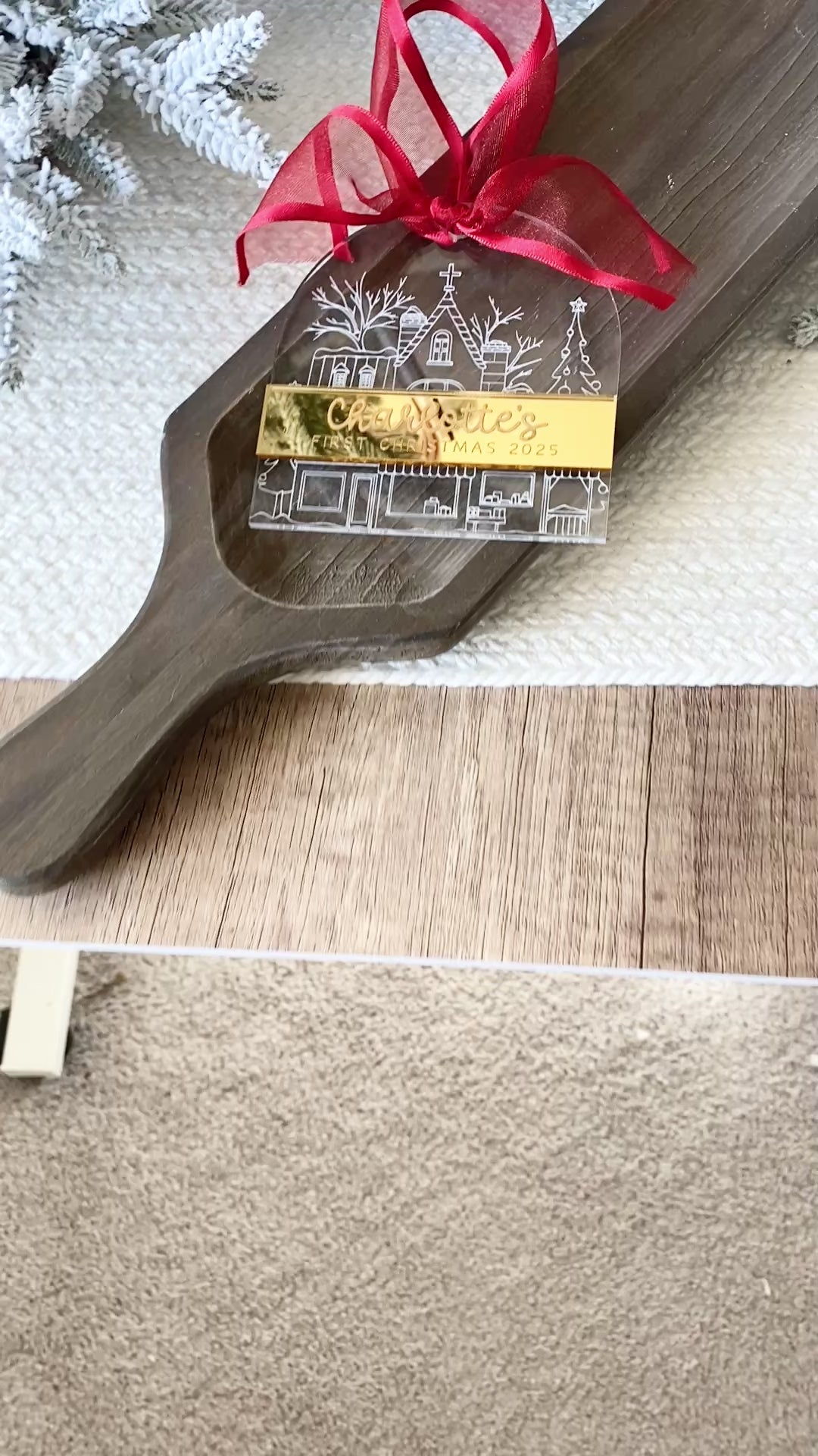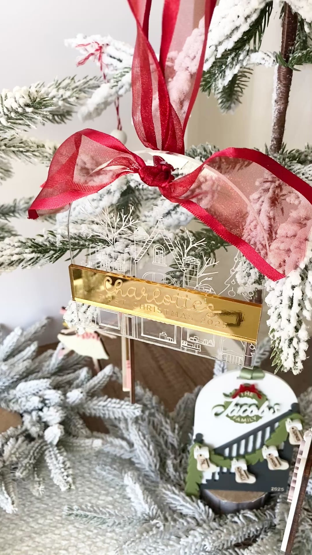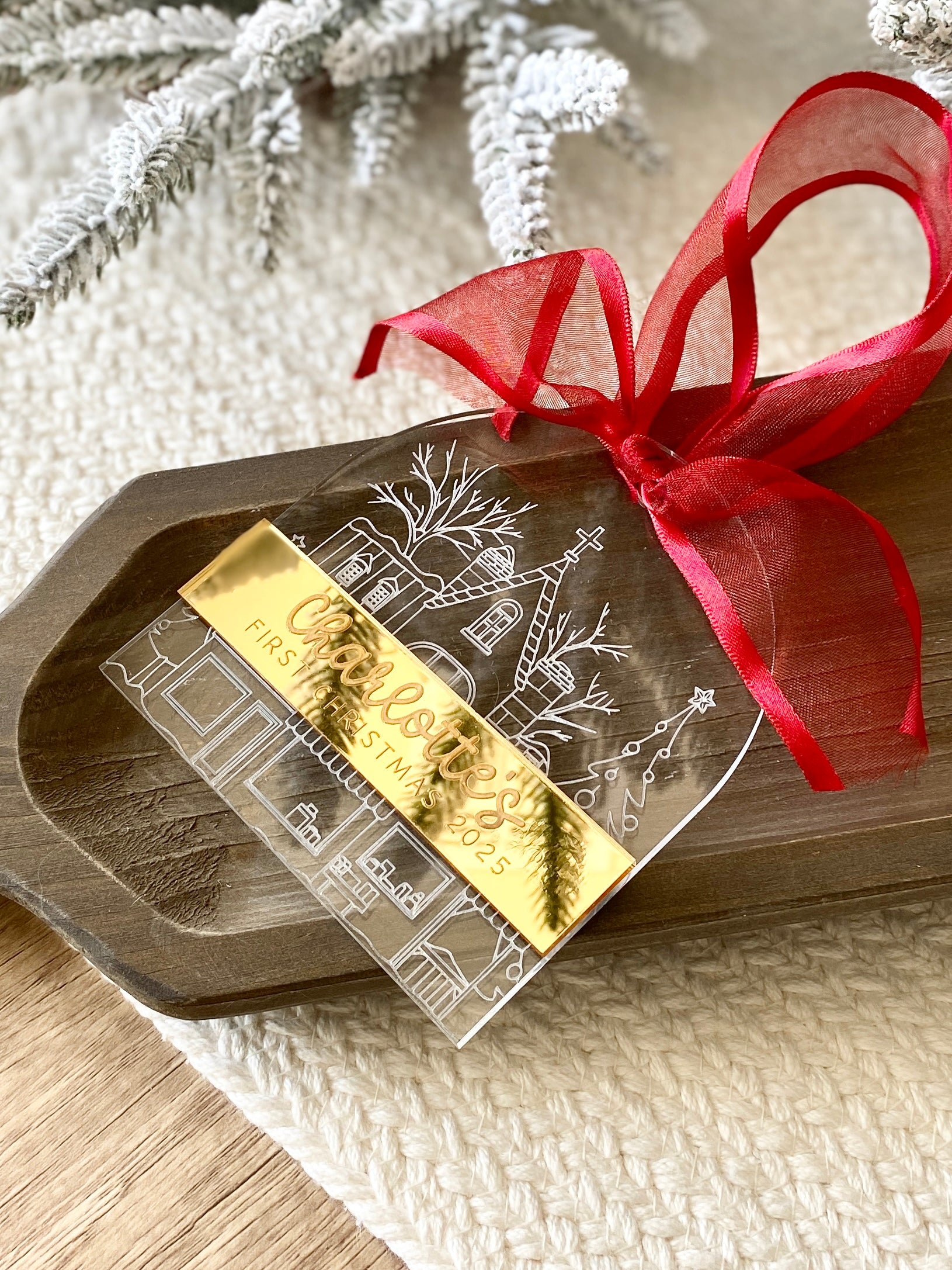 Crafted from clear acrylic, the ornament features a delicately engraved village scene ~ cozy houses, twinkling trees, and a church steeple ~ paired with a mirror gold nameplate engraved with your child’s name and year. Finished with a festive red ribbon, this ornament captures the wonder of the season and the joy of a very first Christmas.