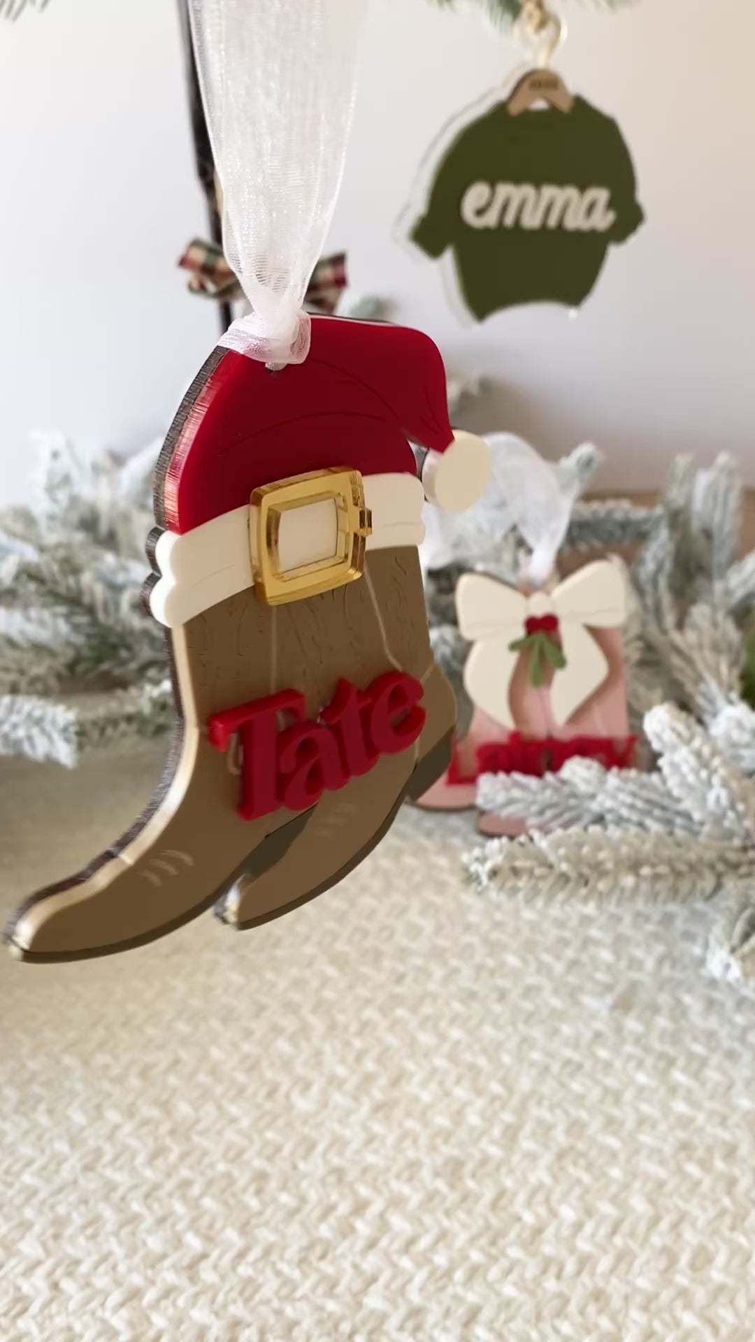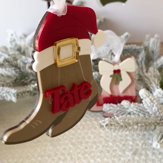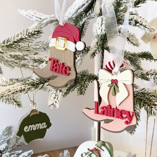 Handcrafted from layered wood and acrylic, each boot is full of festive charm ~ personalized with a 3D name and your choice of Santa Boot (complete with a hat and gold buckle) or Holiday Bow Boot (tied with a sweet bow and holly). Finished with soft white ribbon for hanging, these ornaments are the perfect mix of country charm and Christmas sparkle.