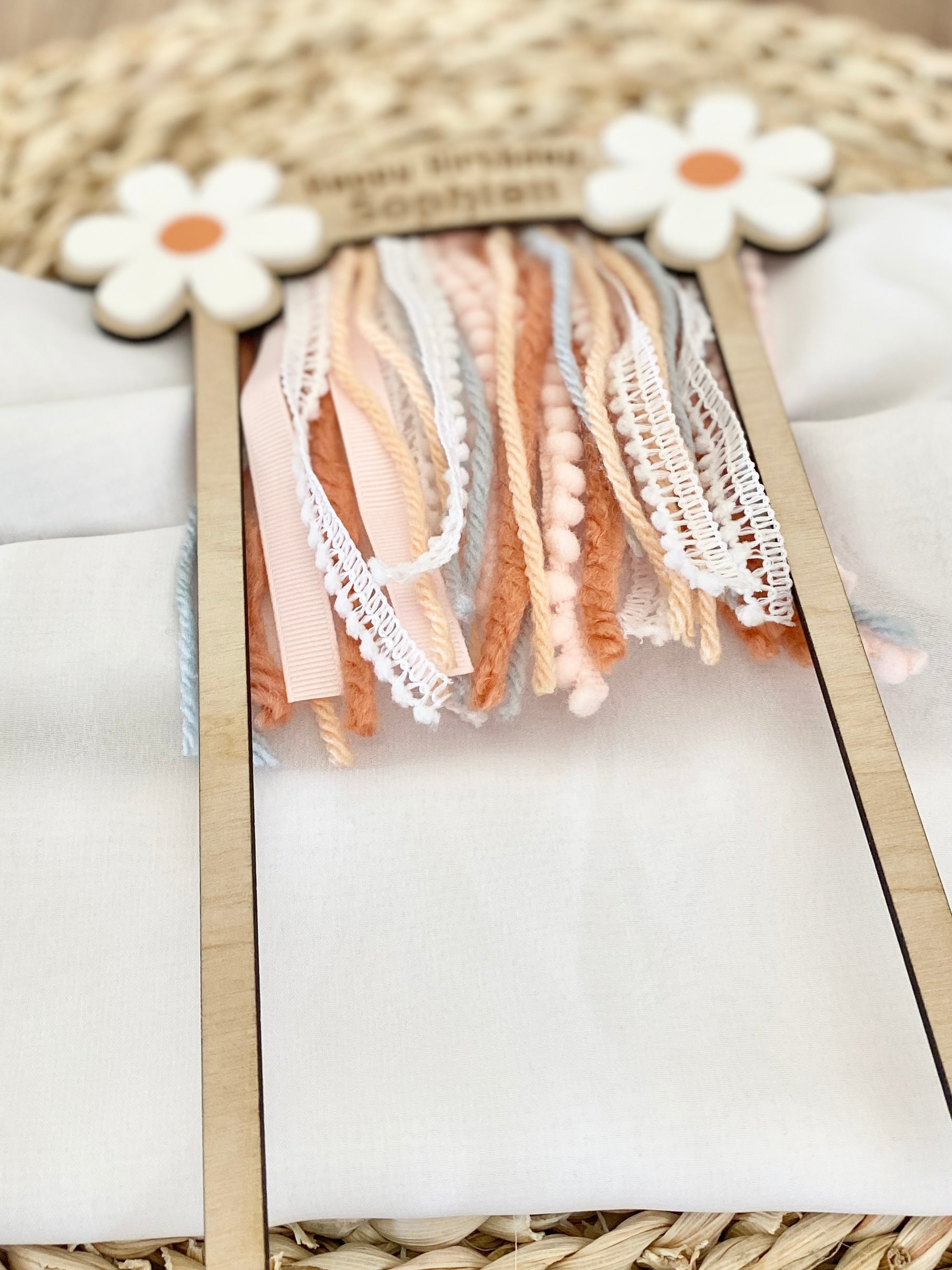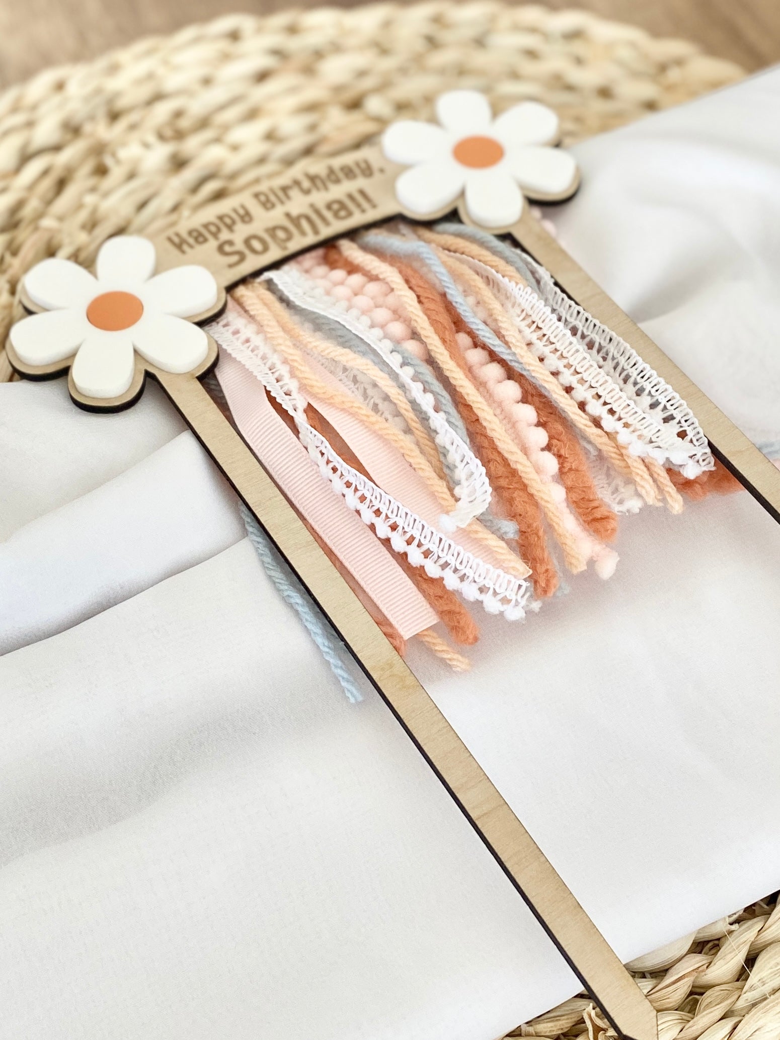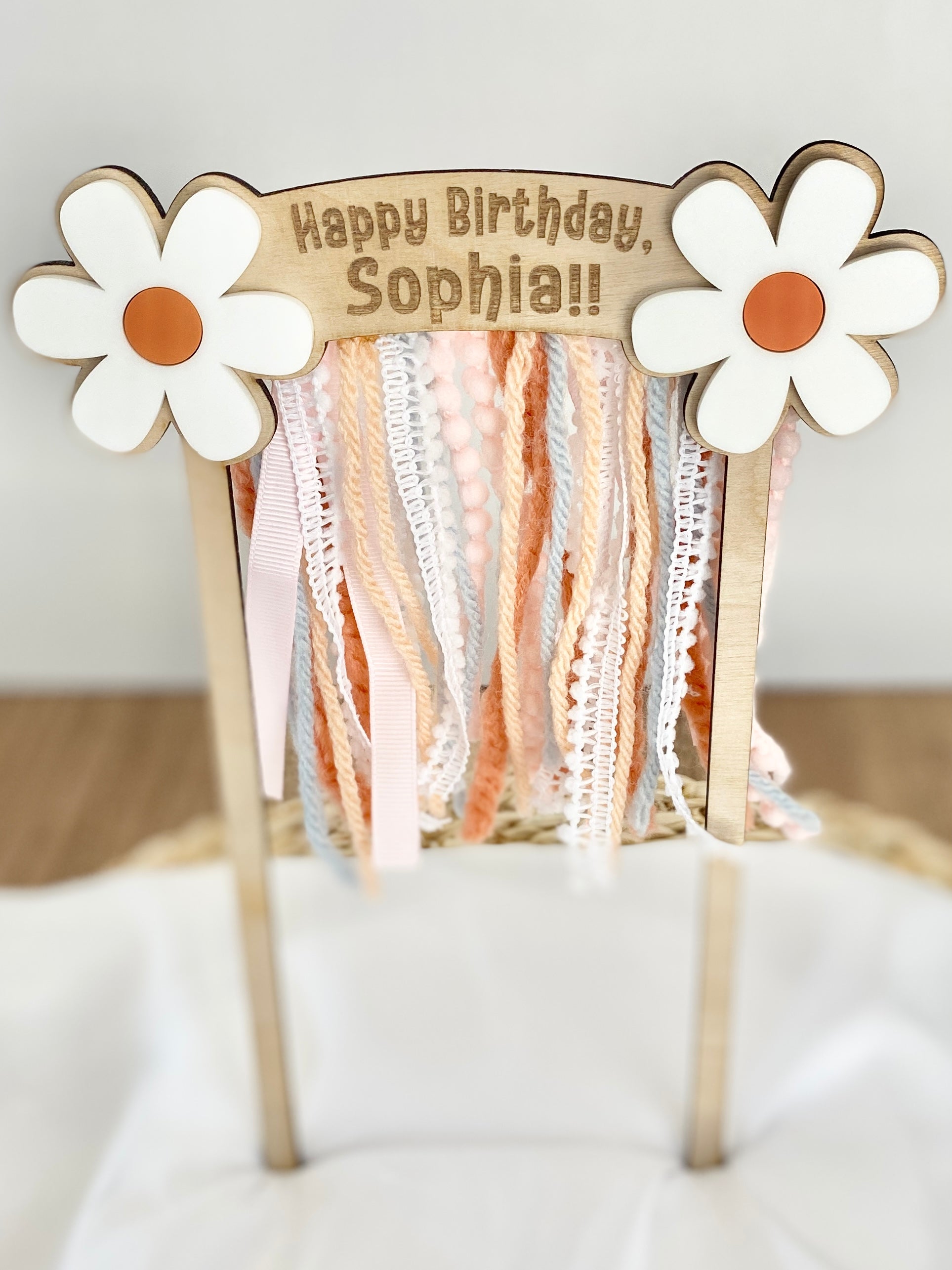 Say hello to the happiest cake topper! This sweet Daisy Fringe Cake Topper adds texture, color, and a little retro charm to any celebration. Each topper features layered daisy accents and a sweet rag-style fringe made from a mix of ribbon, yarn, and fabric. Your topper is personalized with your custom wording (child’s name, “Happy Birthday,” “Baby Shower,” etc.) and crafted by hand, so every piece is one-of-a-kind.