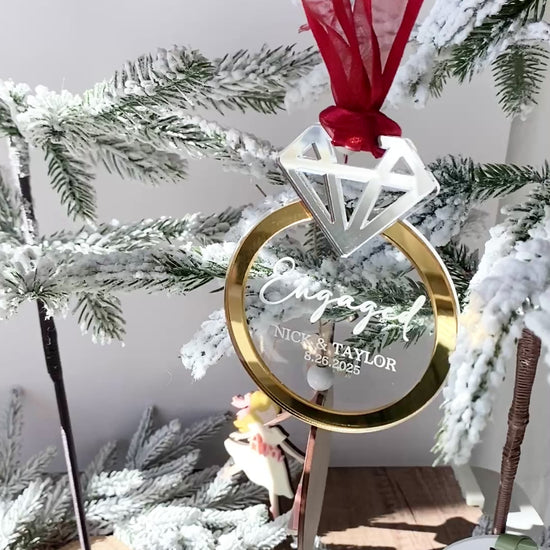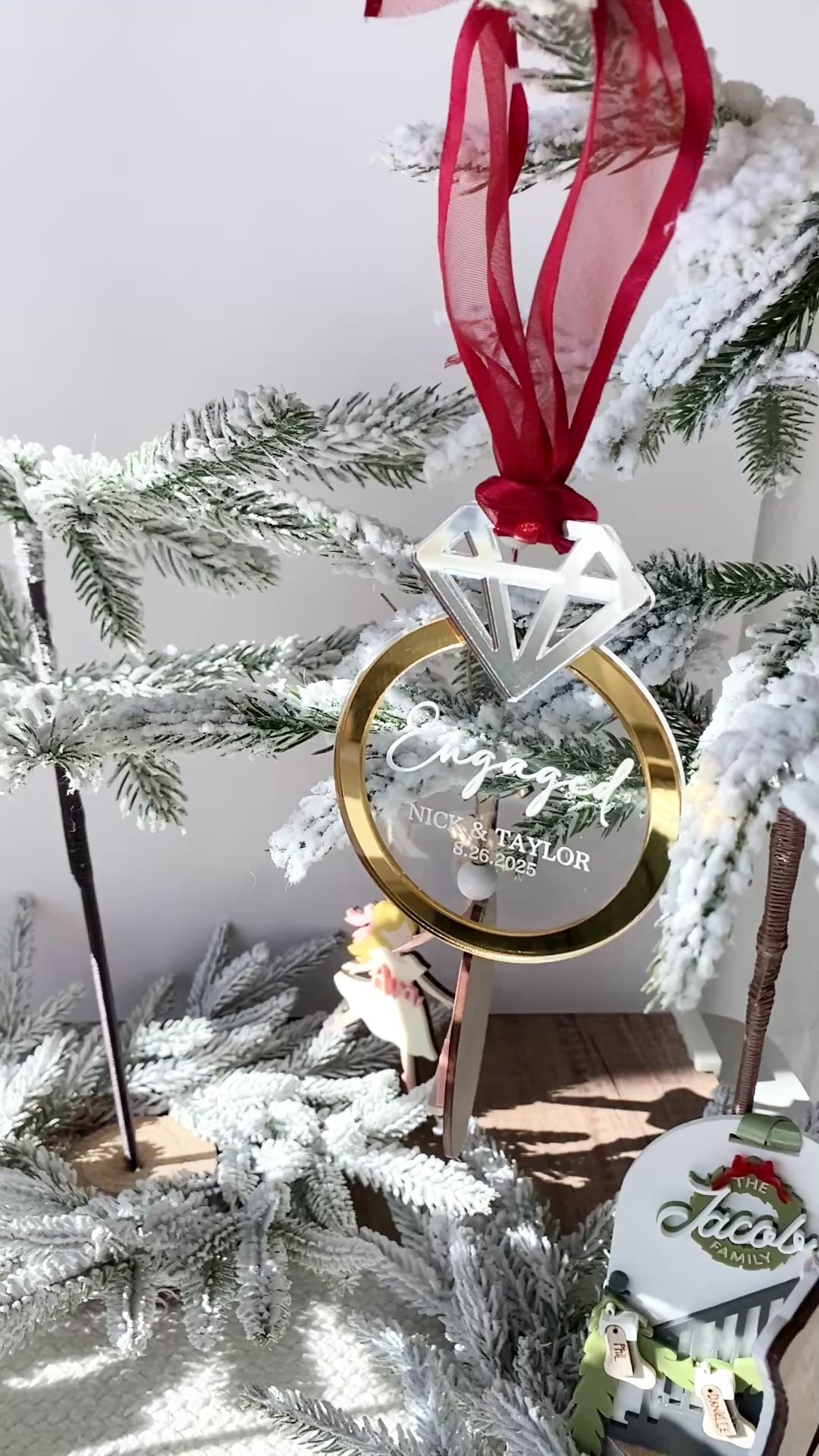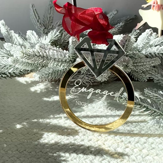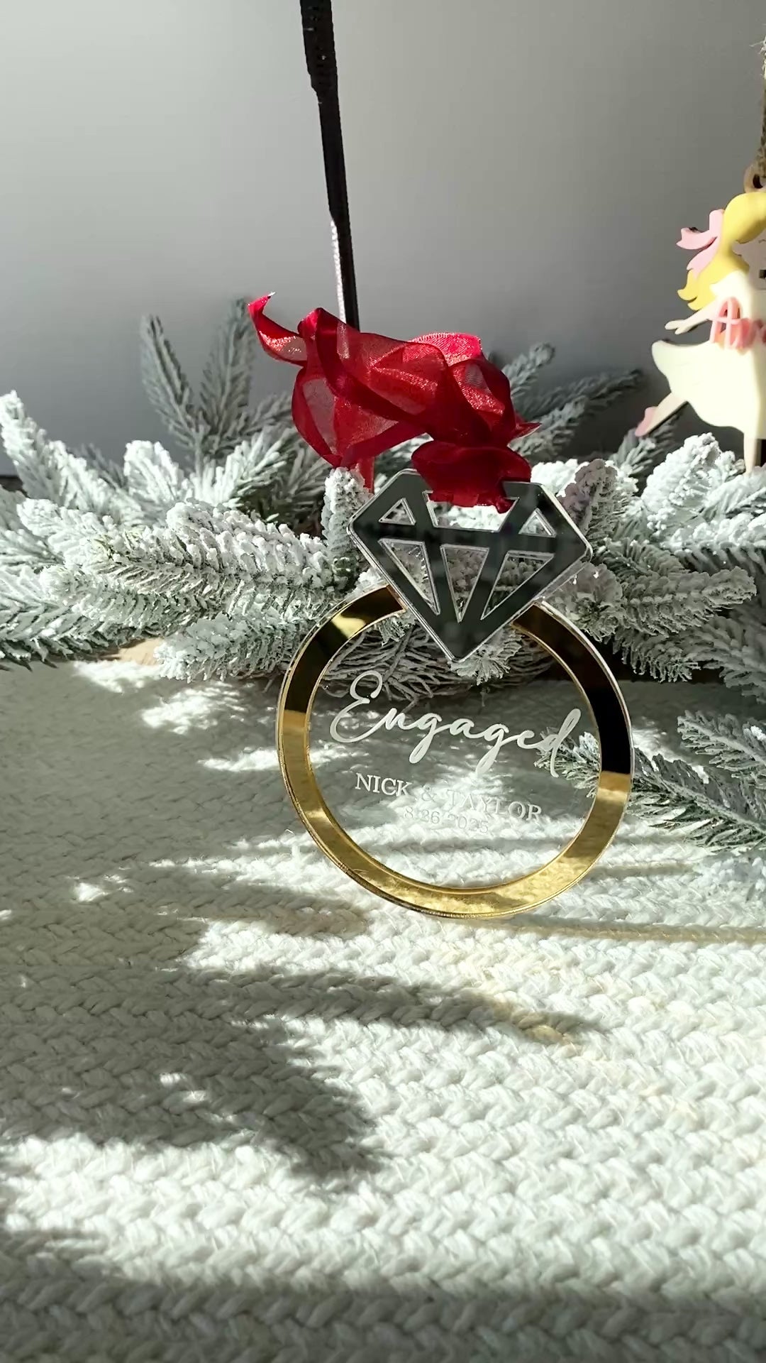 Shaped like a diamond ring, this ornament is crafted from mirror gold and silver acrylic with engraved details that can be personalized with the couple’s names and engagement date. The clear acrylic center gives it a modern, elegant look, while the rich red ribbon adds a festive touch for the tree or display year-round.