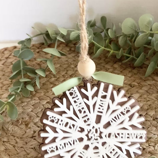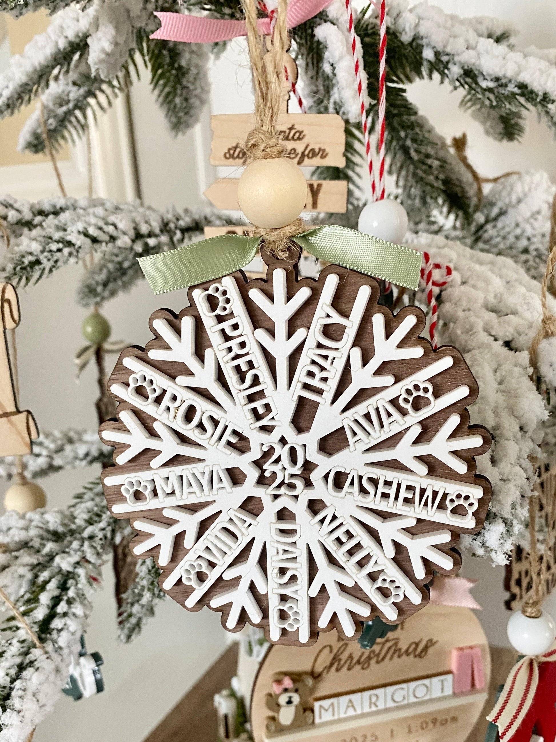This evolving design grows with your family, holding up to 12 names while still keeping its snowflake shape. You can even add paw prints or angel wings to honor beloved pets or family members who’ve passed.