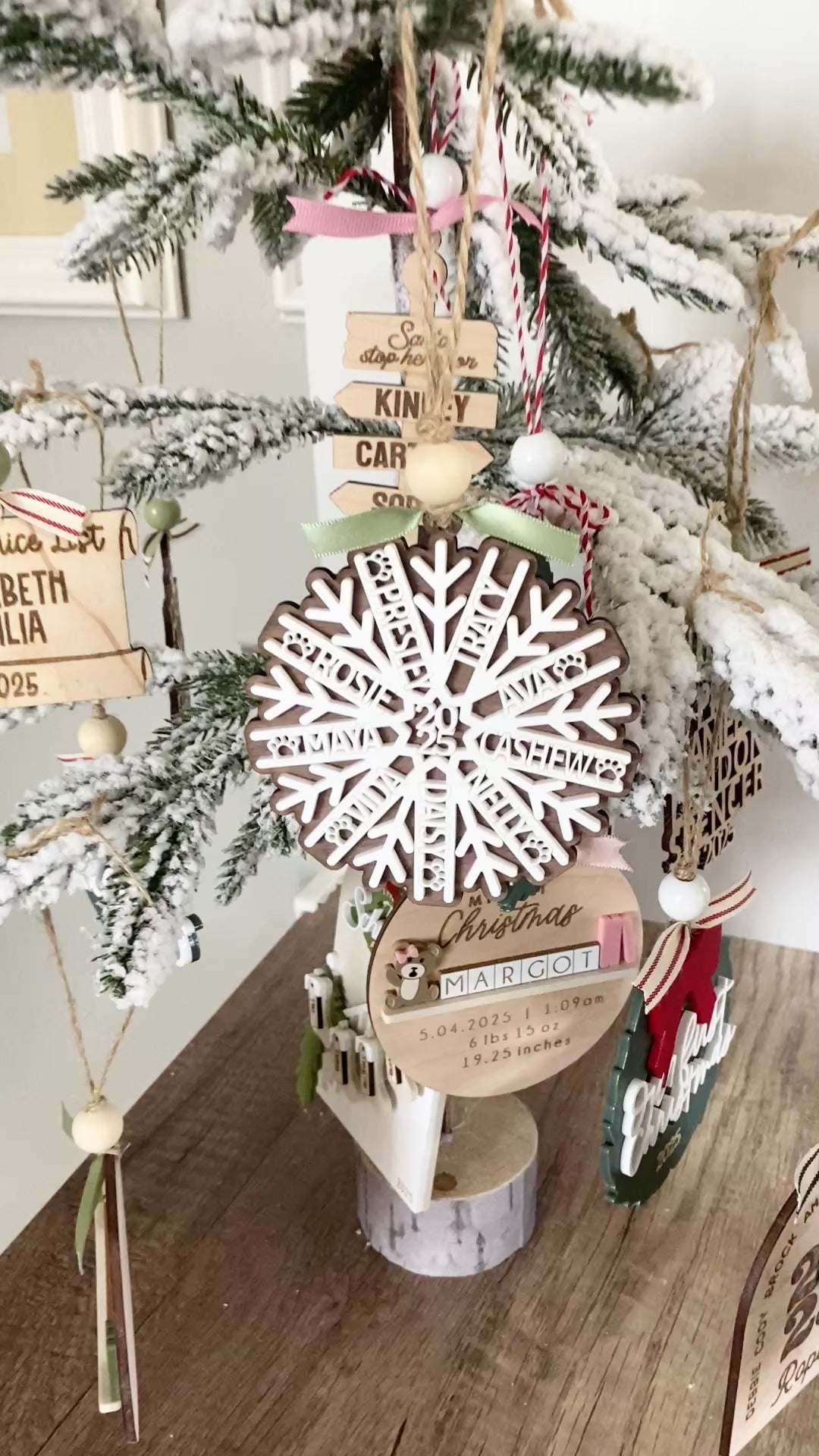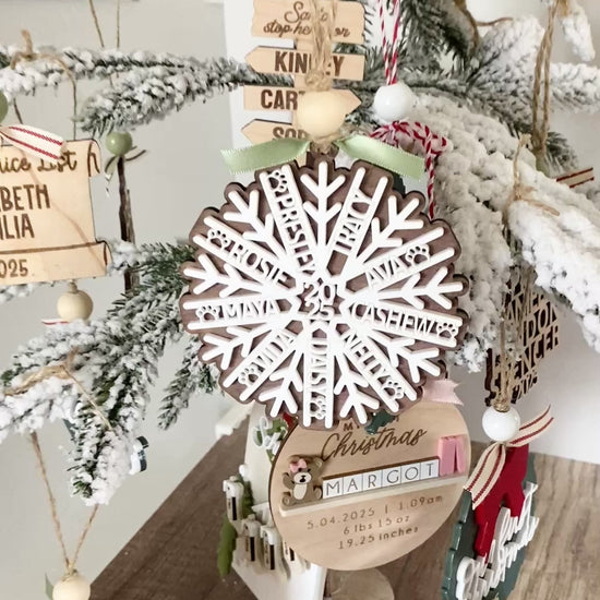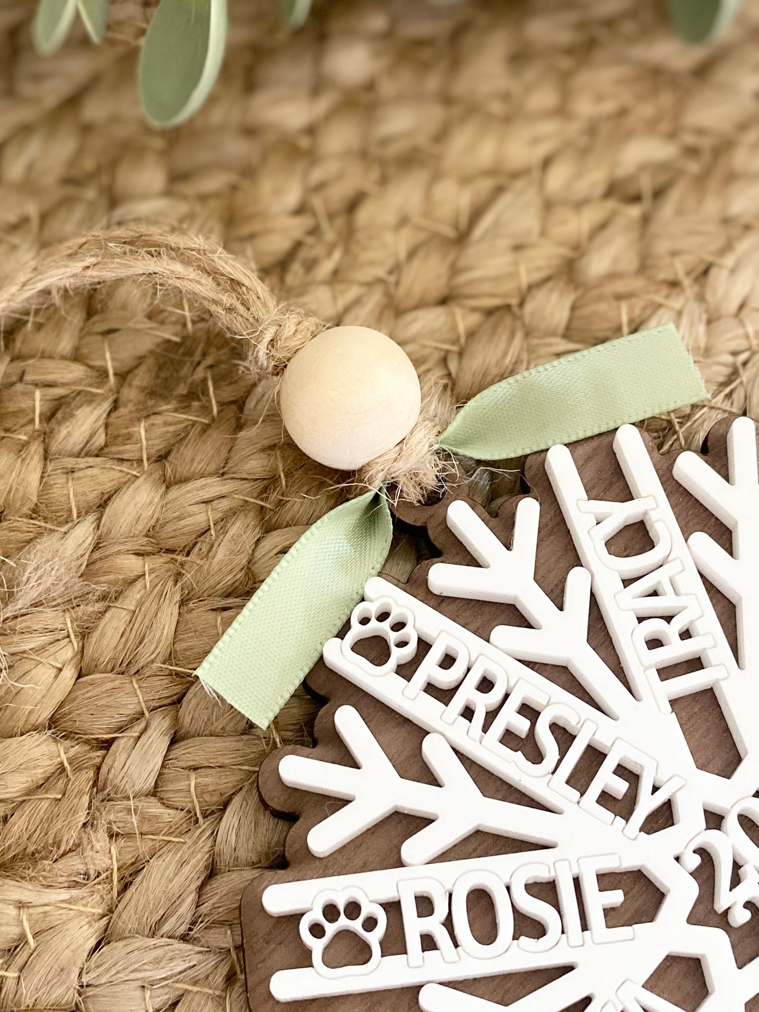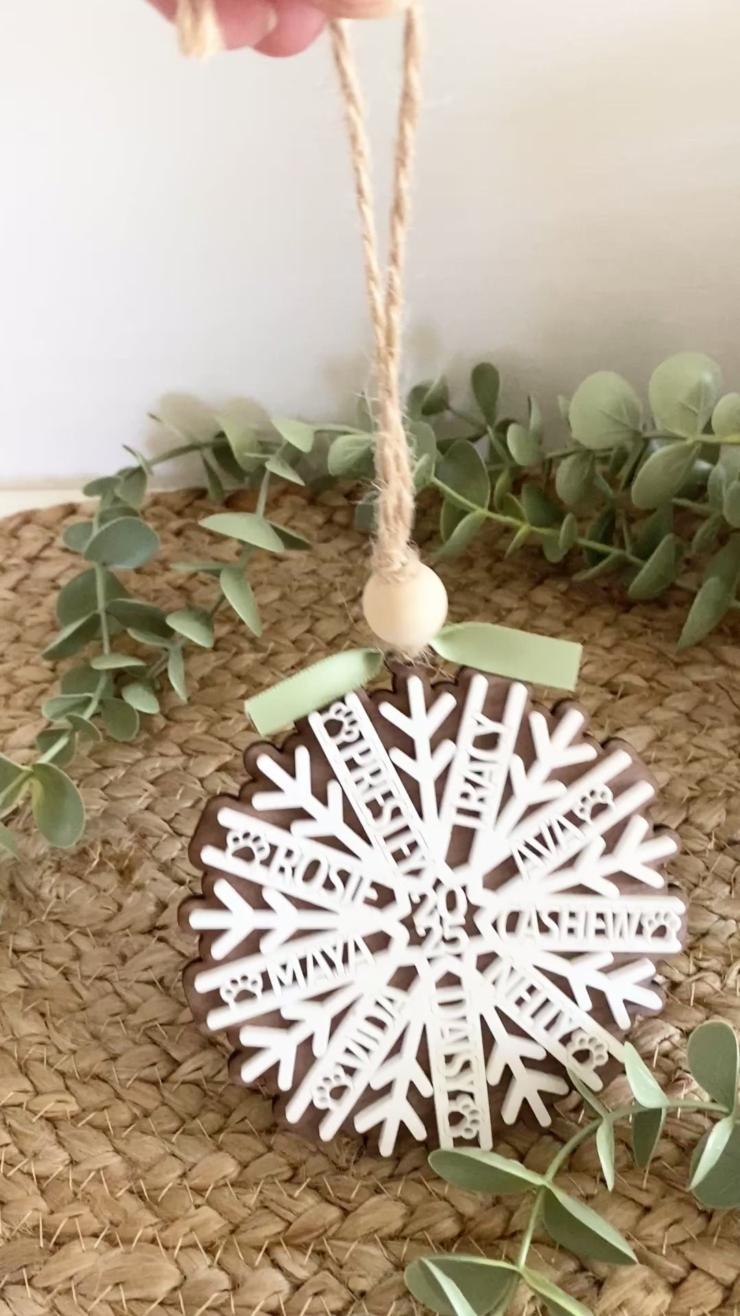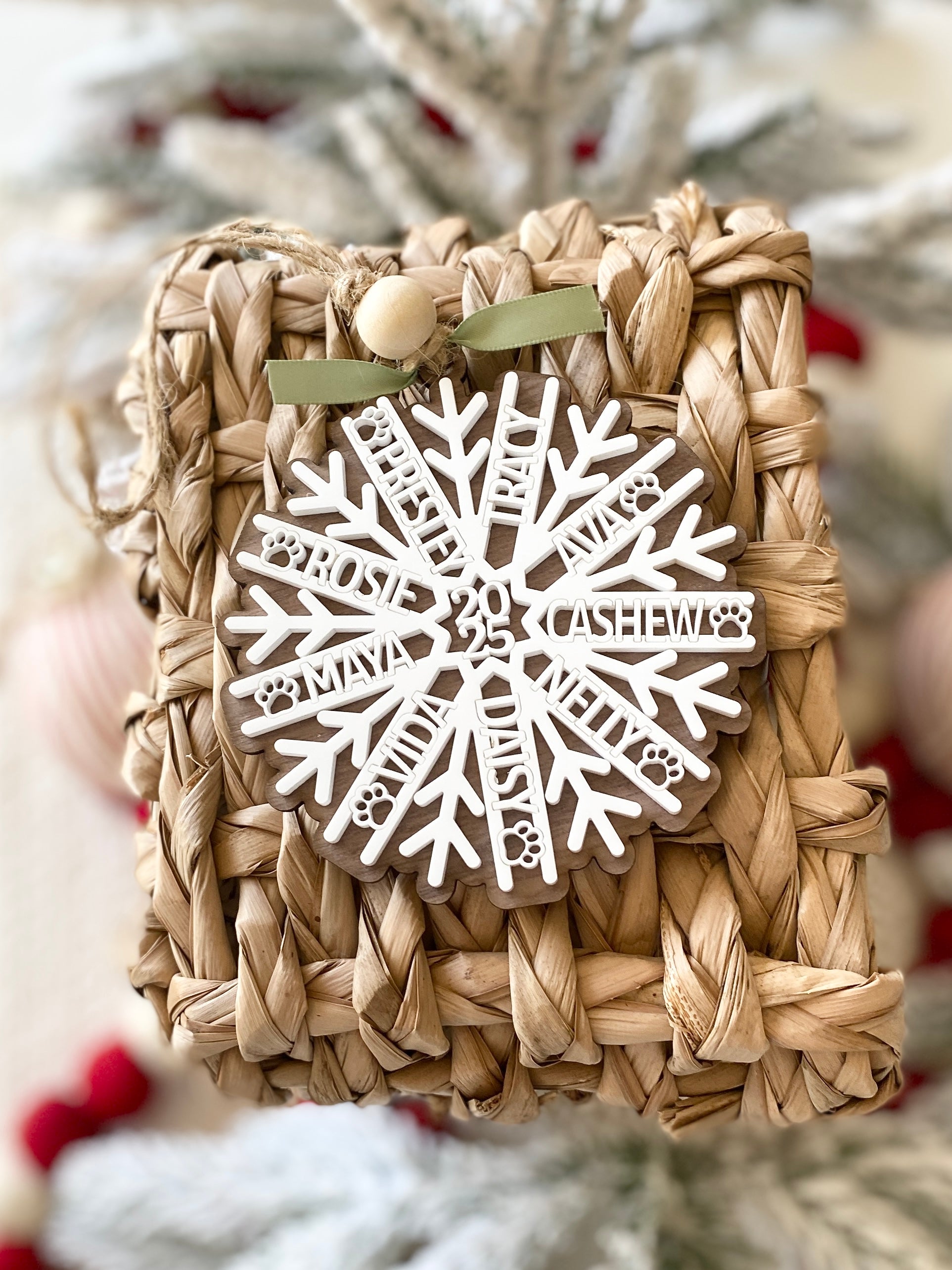 Celebrate the magic of family this holiday season with our Snowflake Family Ornament, a timeless keepsake designed to capture the ones you love most. Crafted from rich dark walnut wood and accented with crisp white acrylic lettering, the snowflake is cut out with your family members’ names — beautifully arranged around the year in the center.