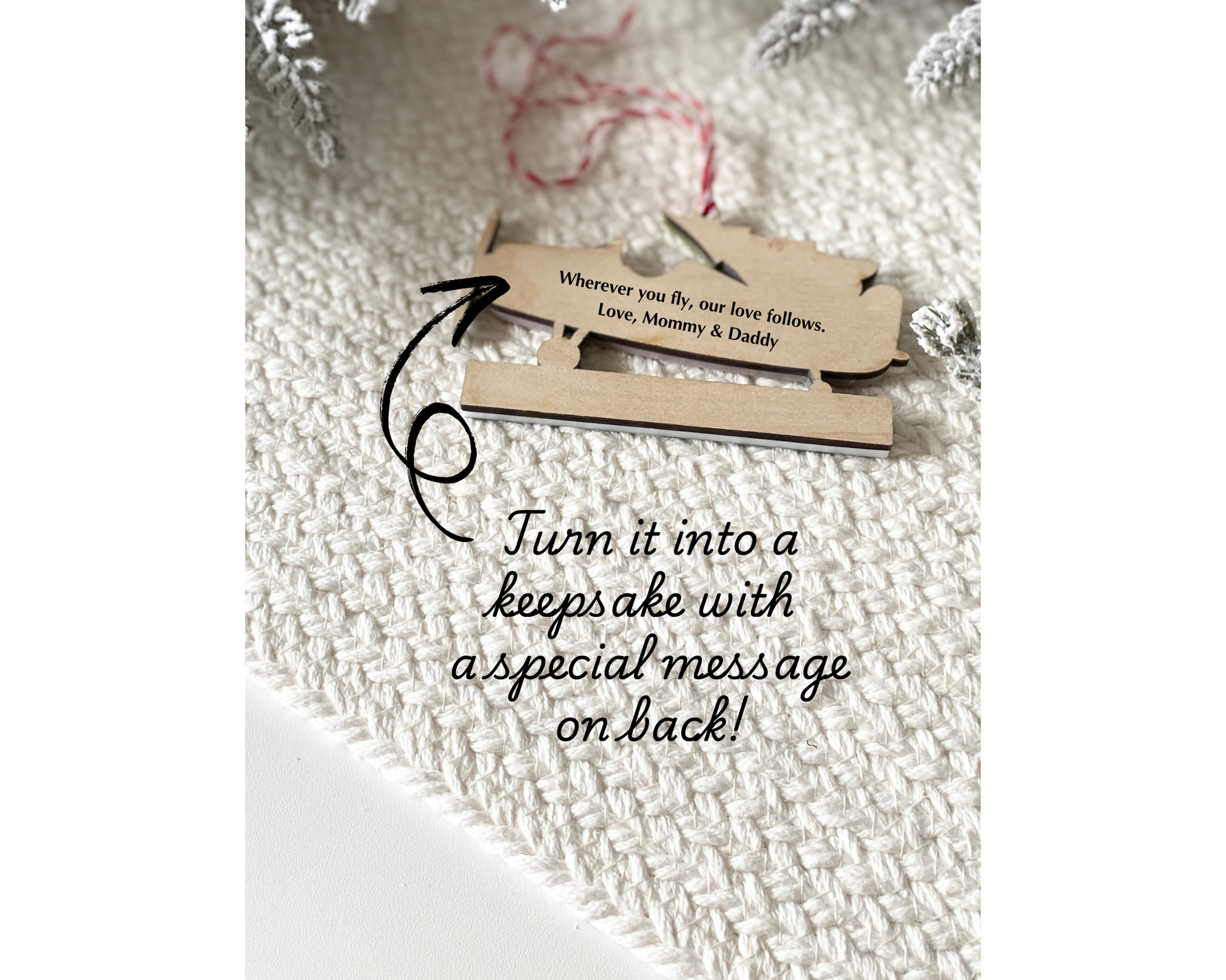 Can be personalized and engraved with your child’s or family name and year on the front. Add a special engraved message on the back to commemorate your child's “first flight”, a long-awaited reunion, homecoming, or a Christmas spent across the miles.