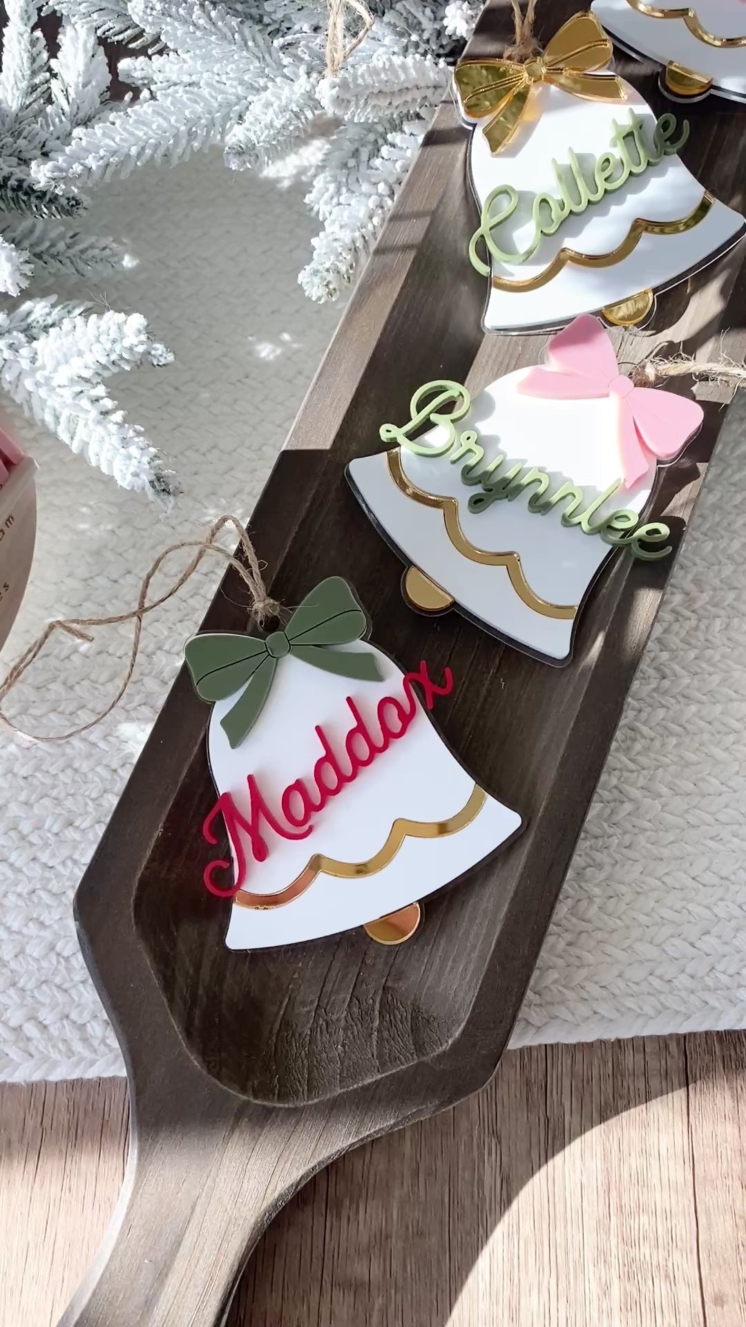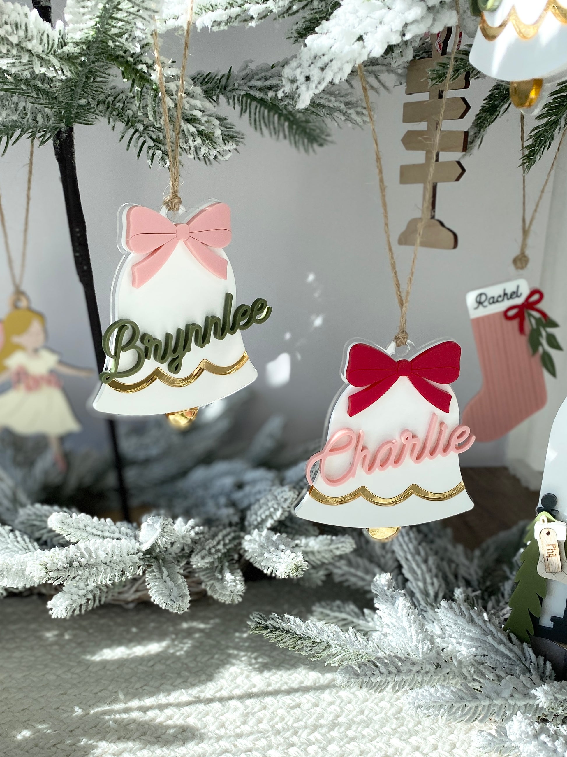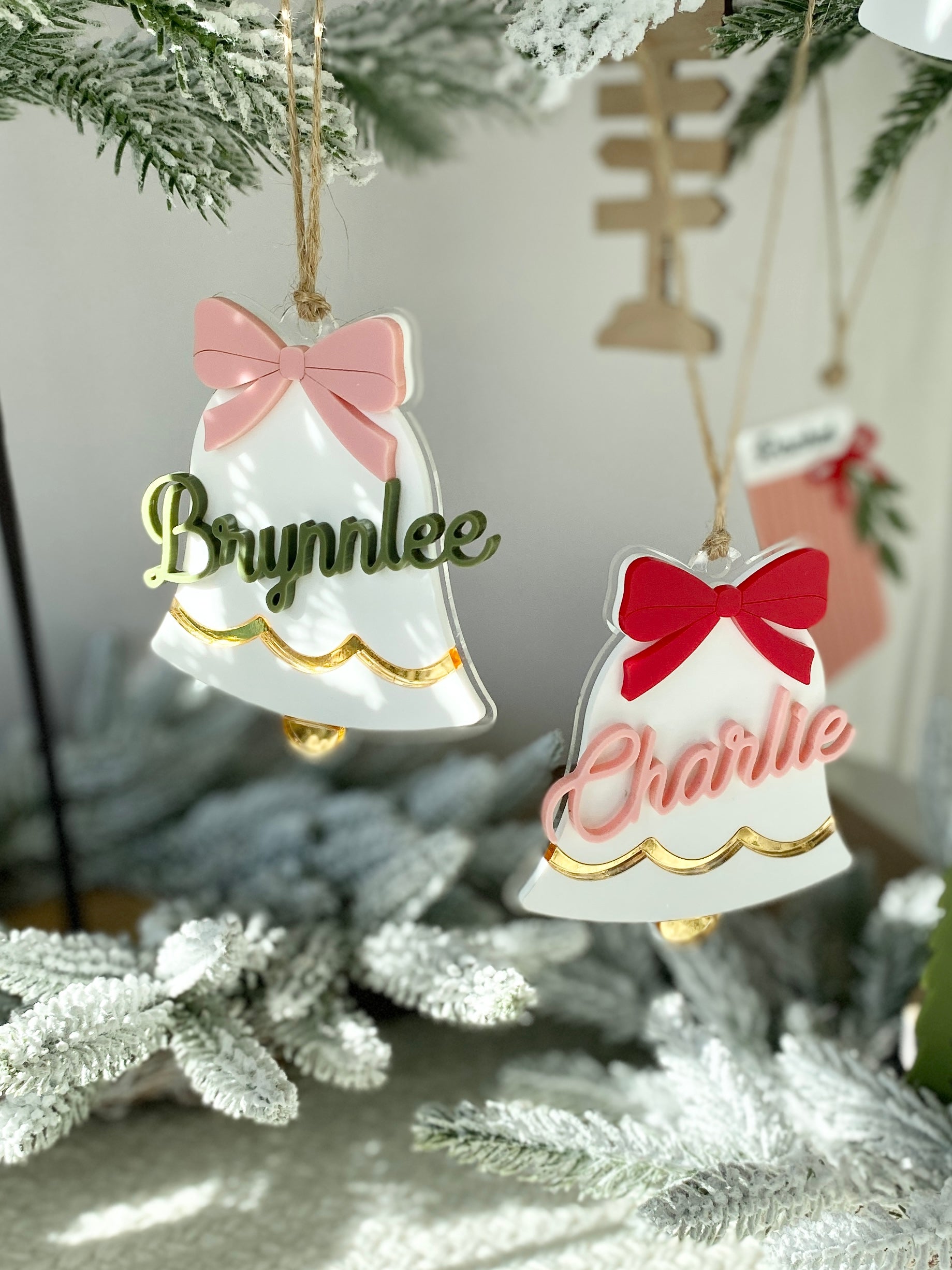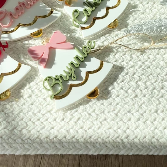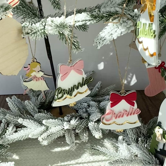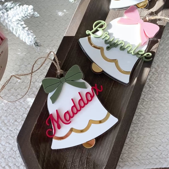 Each bell is handcrafted from layered acrylic, featuring a mirror gold scalloped trim, a 3D personalized name, and a colorful bow in your choice of red, pink, green, or gold. Finished with natural twine, these versatile pieces can be used as ornaments, stocking tags, or gift toppers ~ adding a personalized touch that shines year after year.