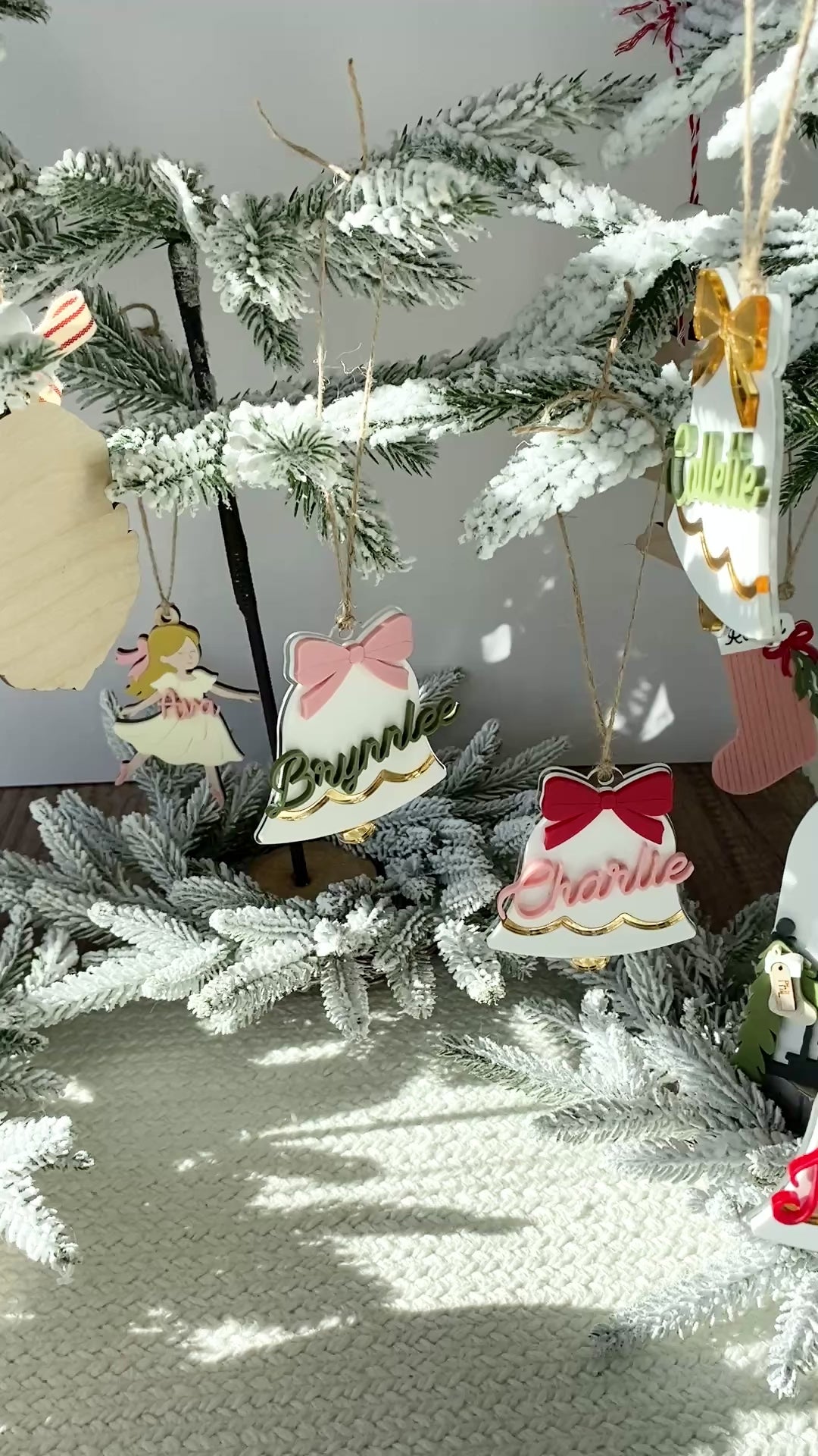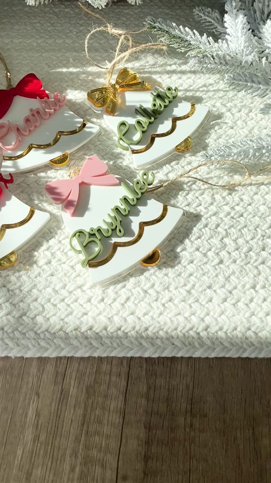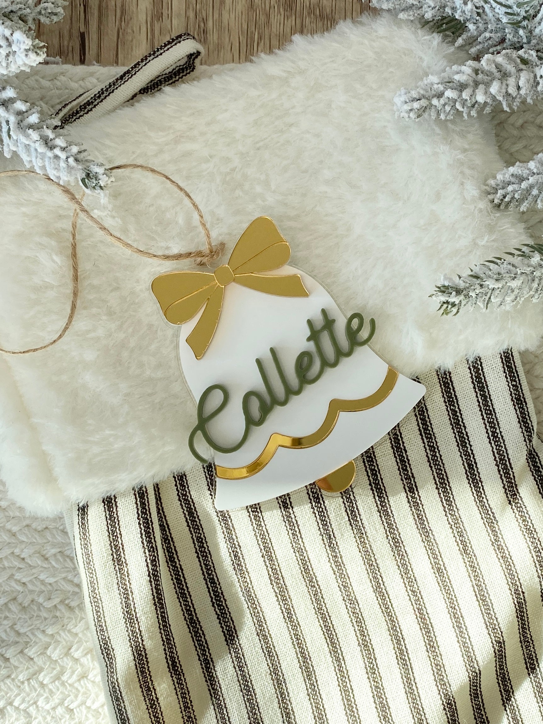 Each bell is handcrafted from layered acrylic, featuring a mirror gold scalloped trim, a 3D personalized name, and a colorful bow in your choice of red, pink, green, or gold. Finished with natural twine, these versatile pieces can be used as ornaments, stocking tags, or gift toppers ~ adding a personalized touch that shines year after year.