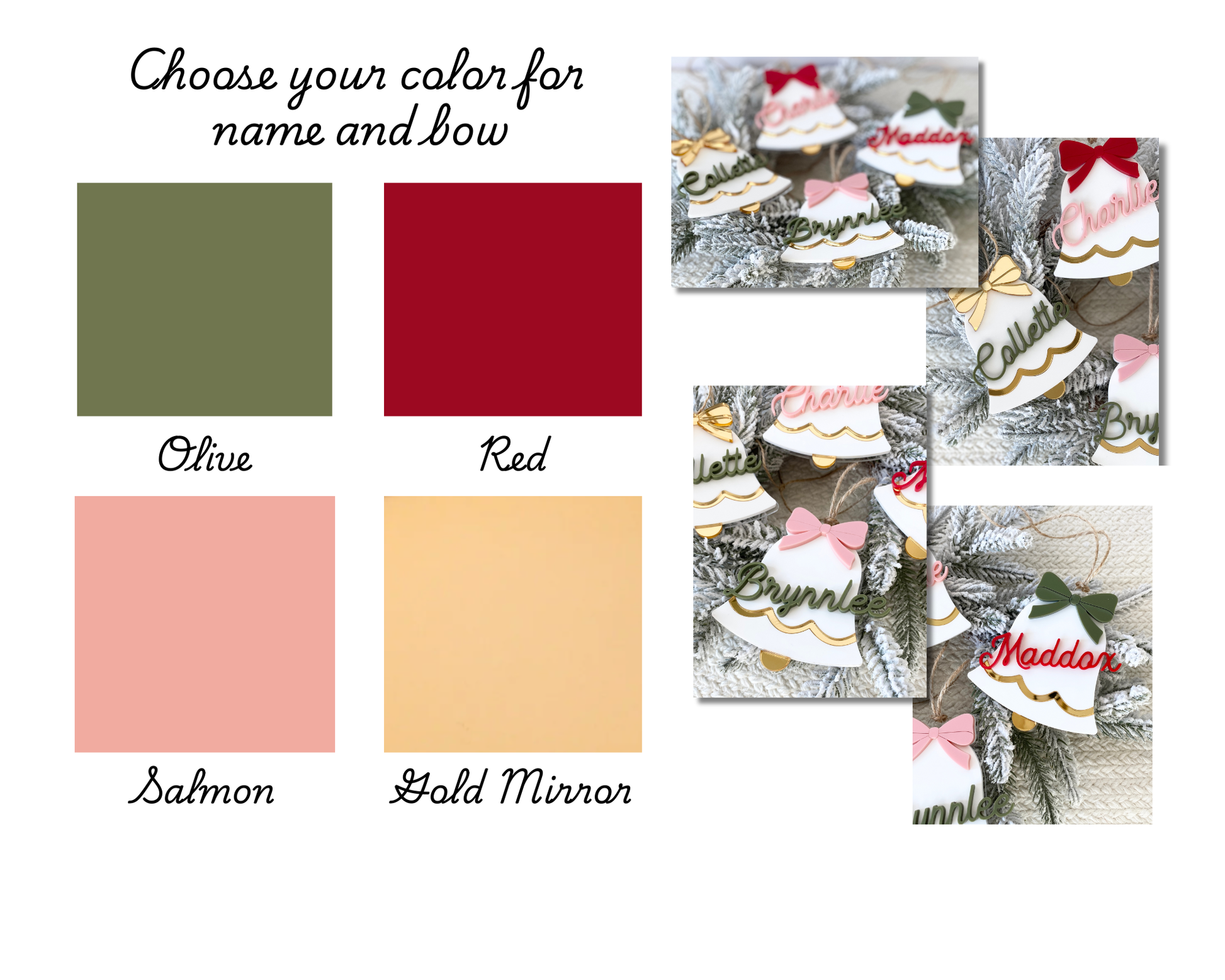 - Enter name color and bow color (olive, red, salmon, gold mirror)