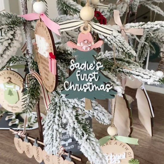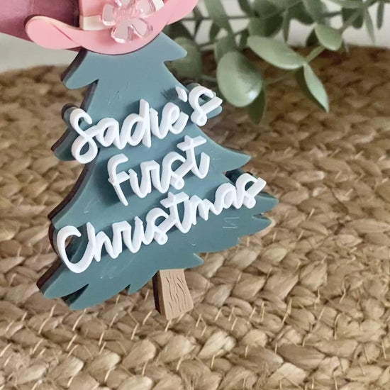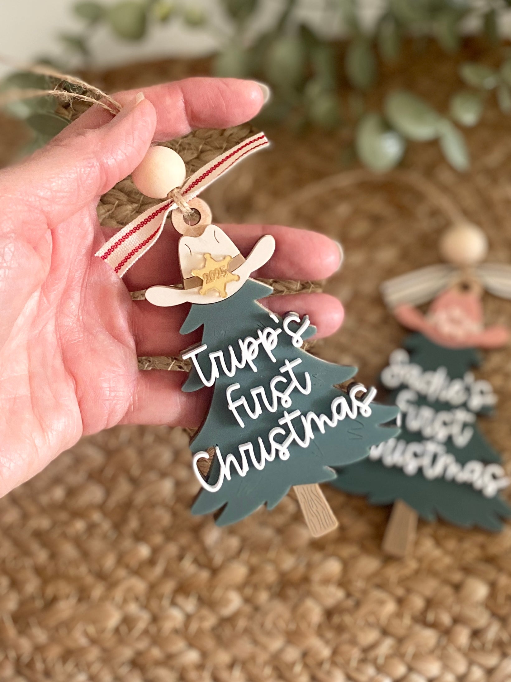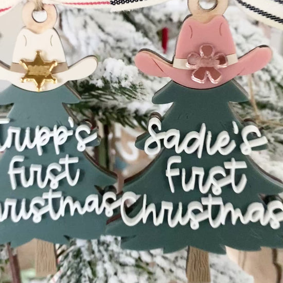 Shaped like a festive Christmas tree, this ornament is crafted from matte green acrylic and topped with a playful cowboy or cowgirl hat. Your child’s name and First Christmas are cut out of white acrylic and placed on the tree. For an extra personal touch, boys get a sheriff's badge and gold mirror star engraved with the year inside, and girls get a flower accent and rose gold mirror flower engraved with the year.