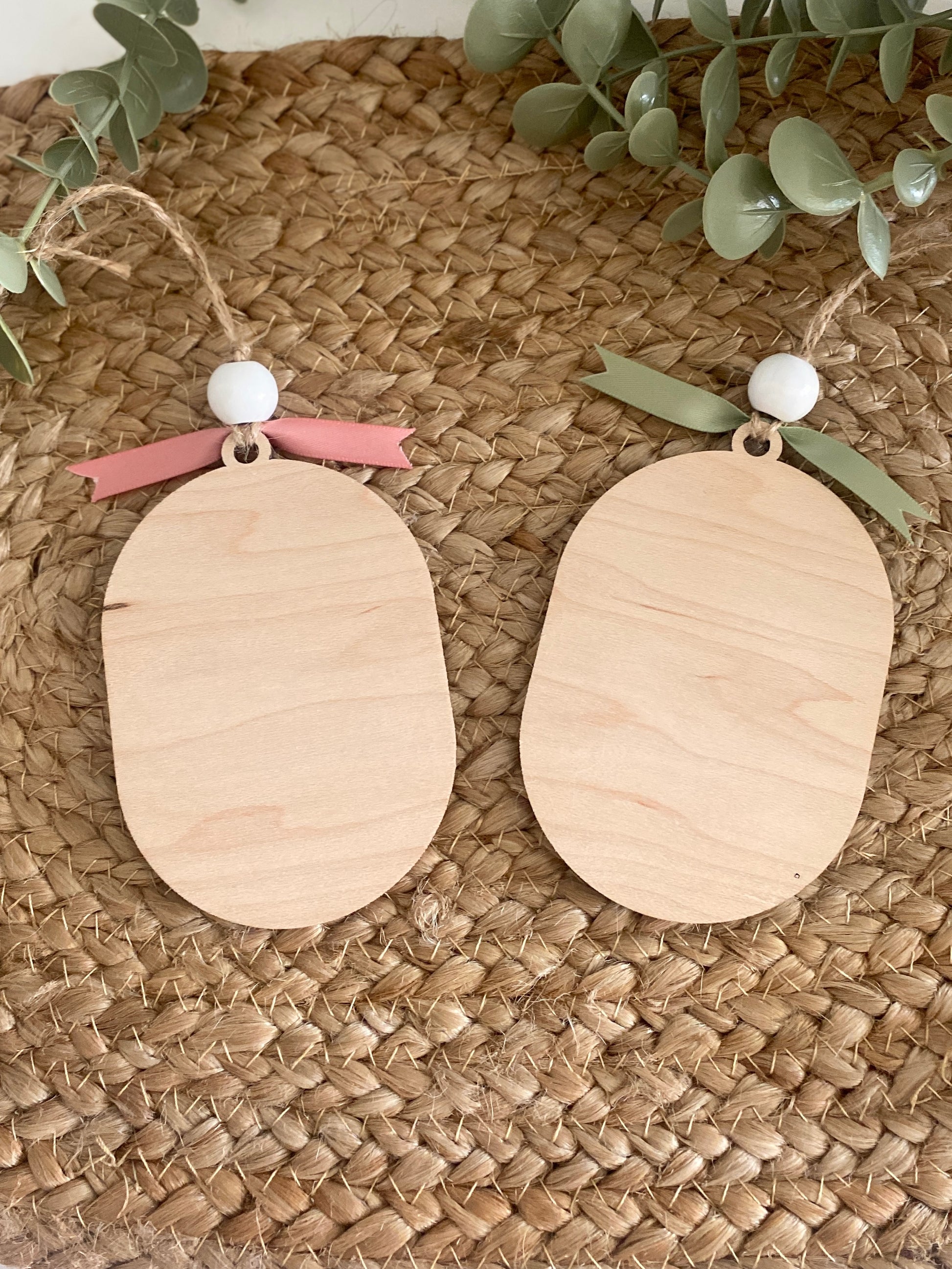 The ornament is finished with twine, a matching pink or green satin bow, and a white wooden bead — ready to hang on your tree. Measuring approximately 3" x 4 1/2", it’s lightweight yet detailed, making it a treasured piece for years to come.