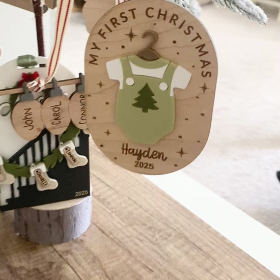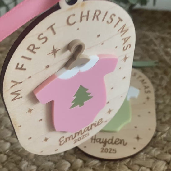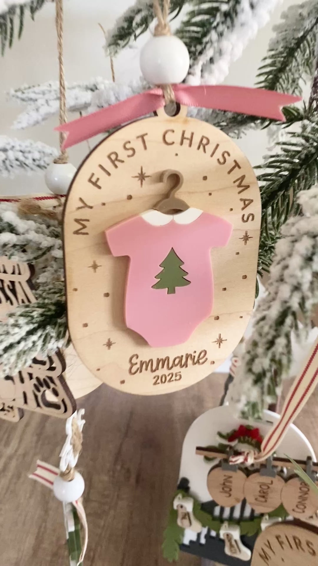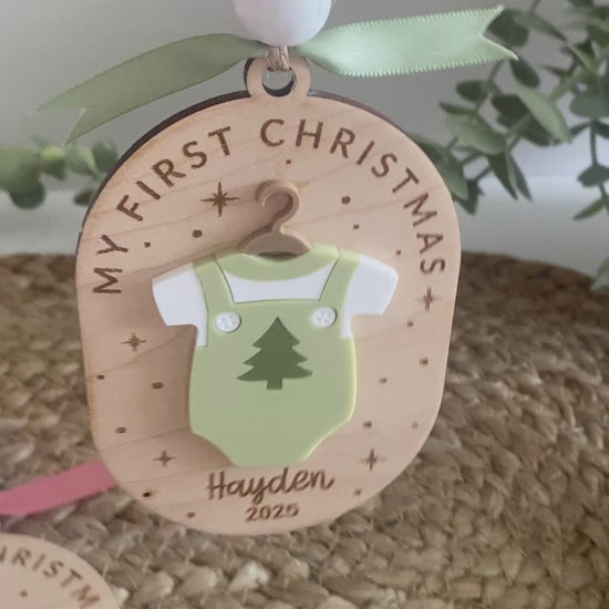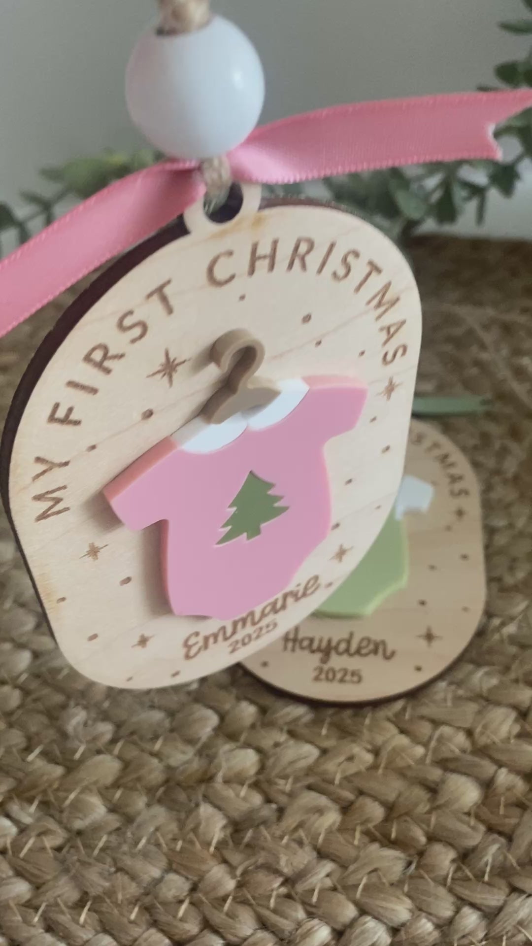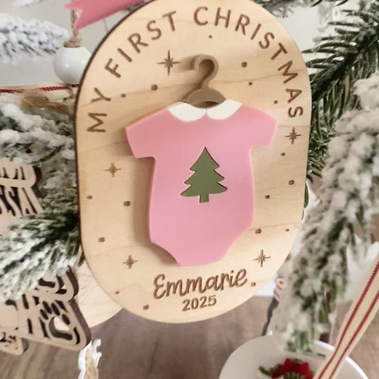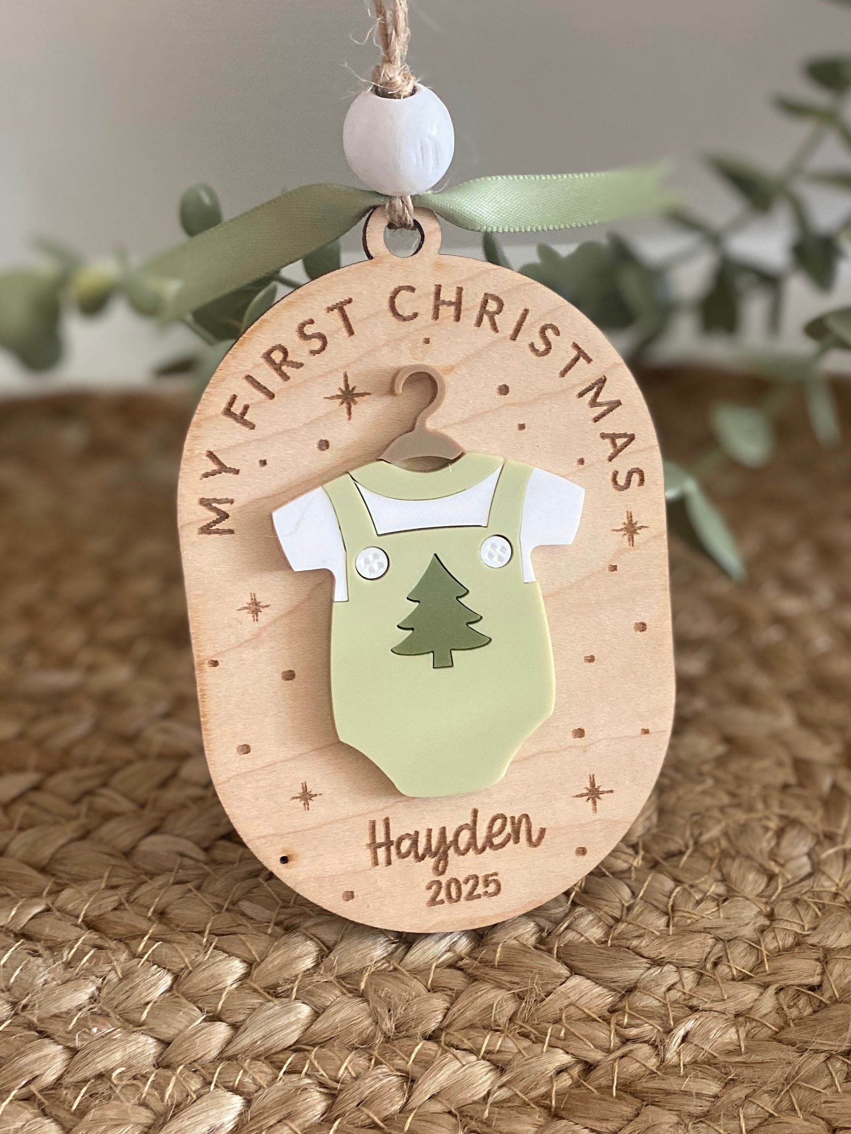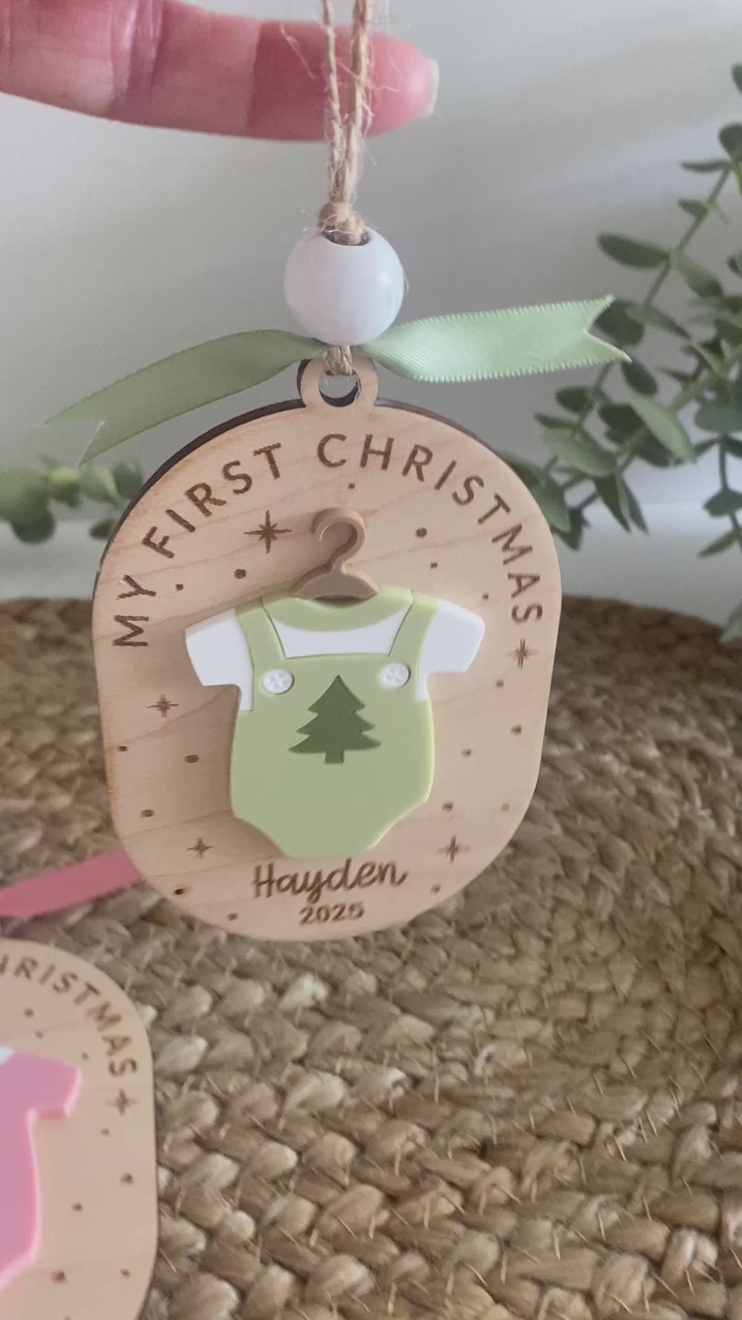 Crafted from natural wood in a classic oval shape, this ornament features “My First Christmas” engraved along with your baby’s name and year. A charming acrylic onesie in your choice of pink or green hangs from a delicate brown acrylic hanger. In the center of the onesie is a tiny Christmas tree, with this sweet outfit surrounded by engraved stars that twinkle with holiday cheer.