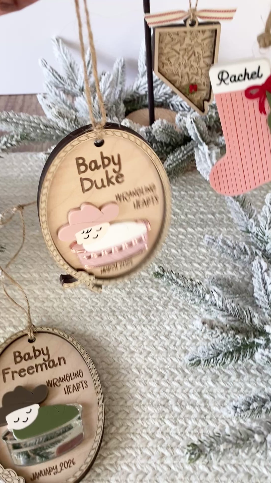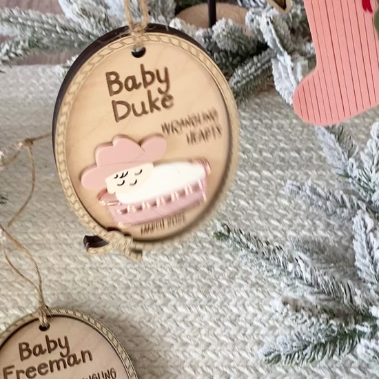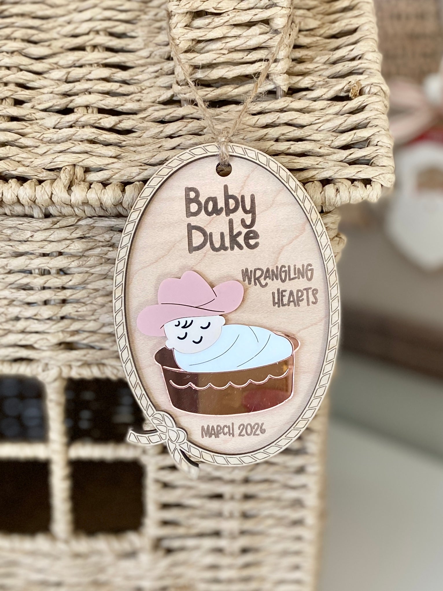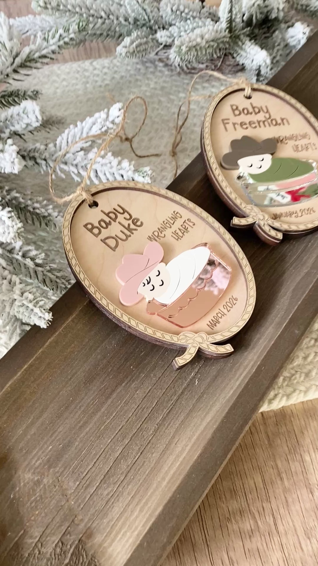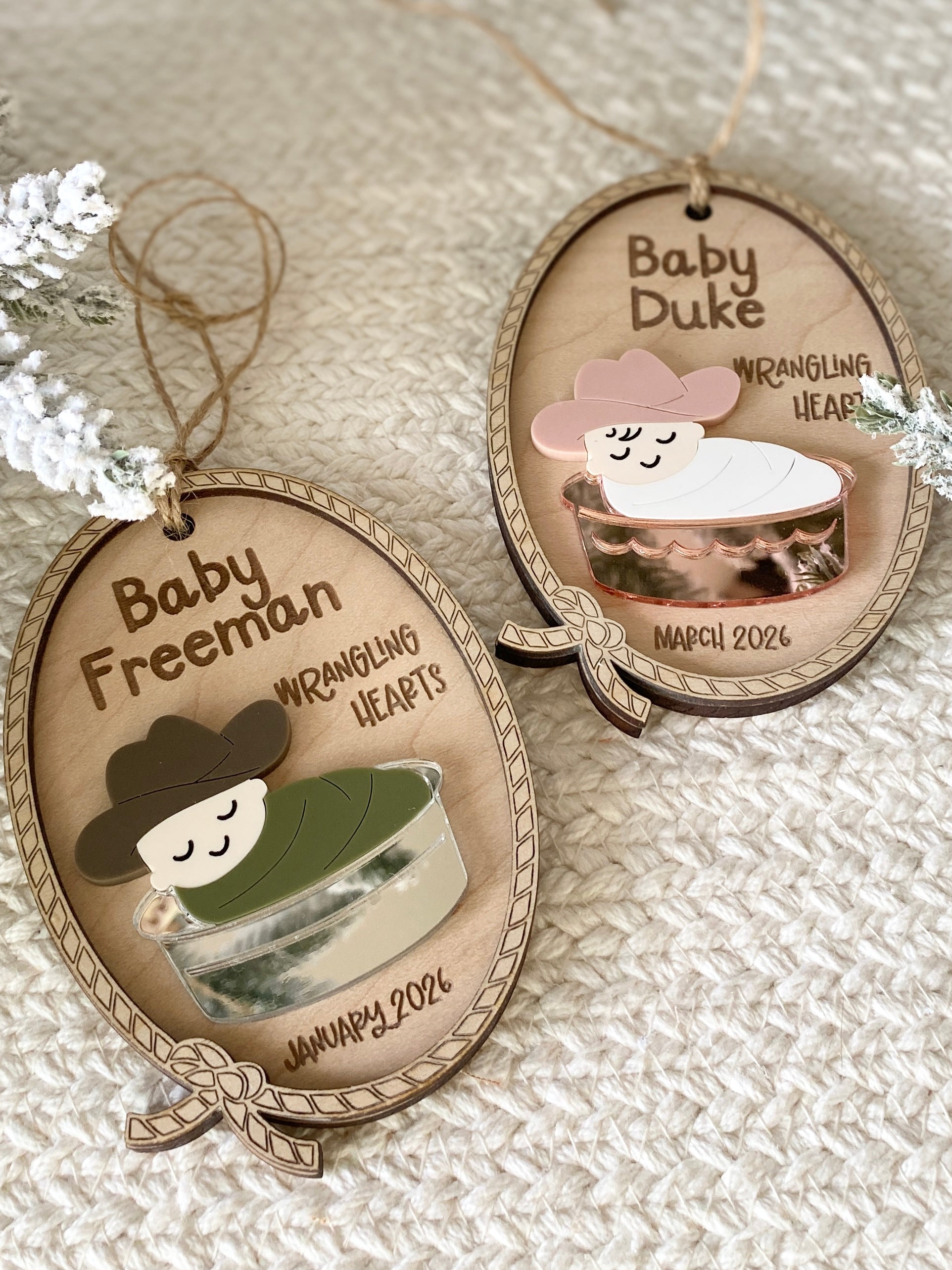 Each ornament is handcrafted from layered wood and acrylic, featuring an adorable baby “wrangler” in a cowboy hat nestled in a tiny tub. The border is detailed with a lasso-inspired rope frame, and each piece is personalized with baby’s name and birth month/year.