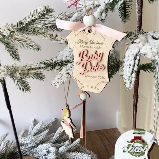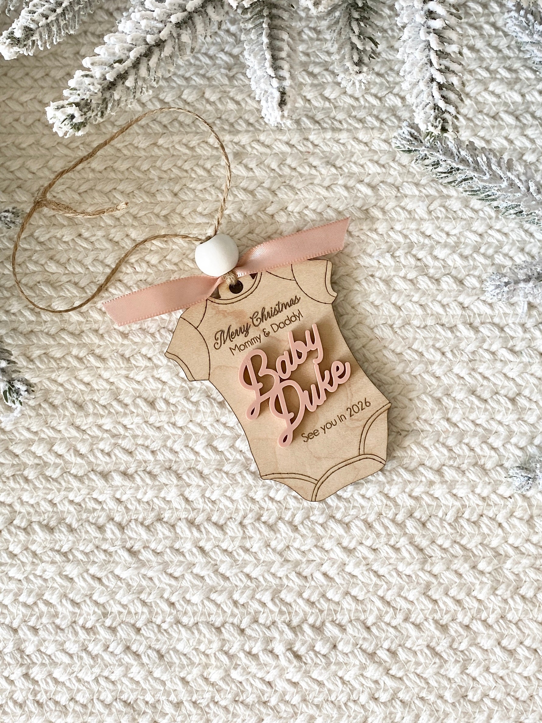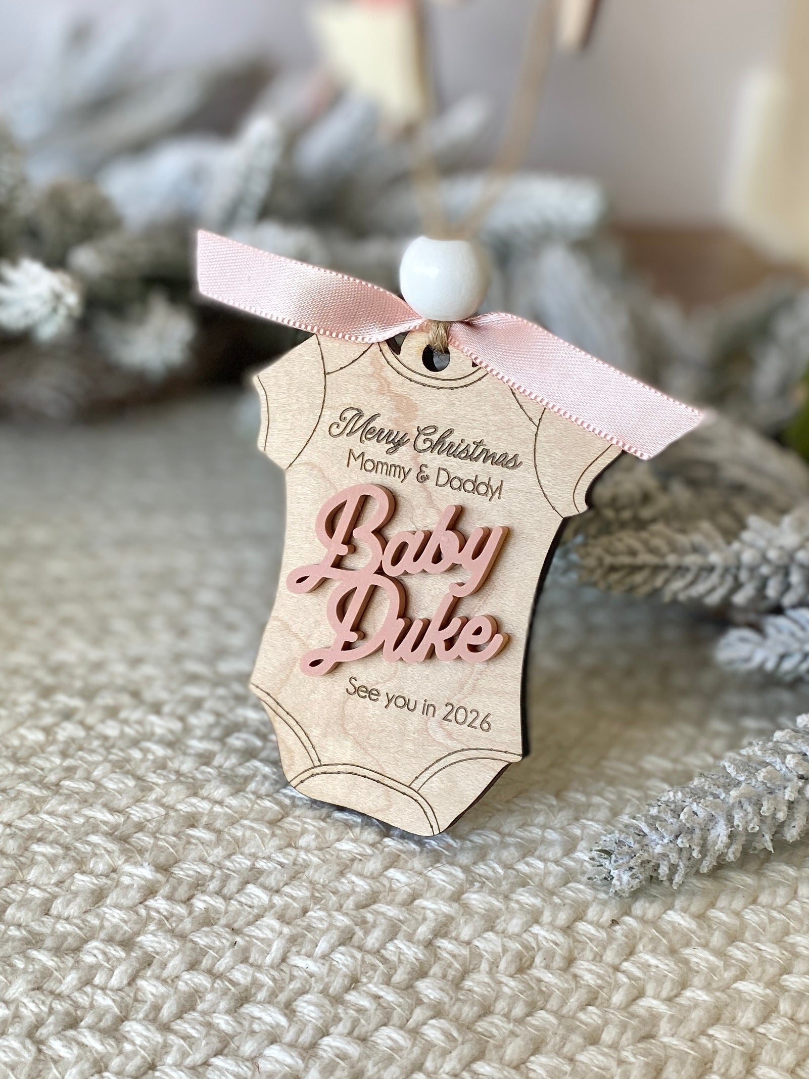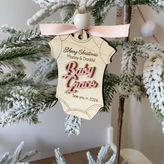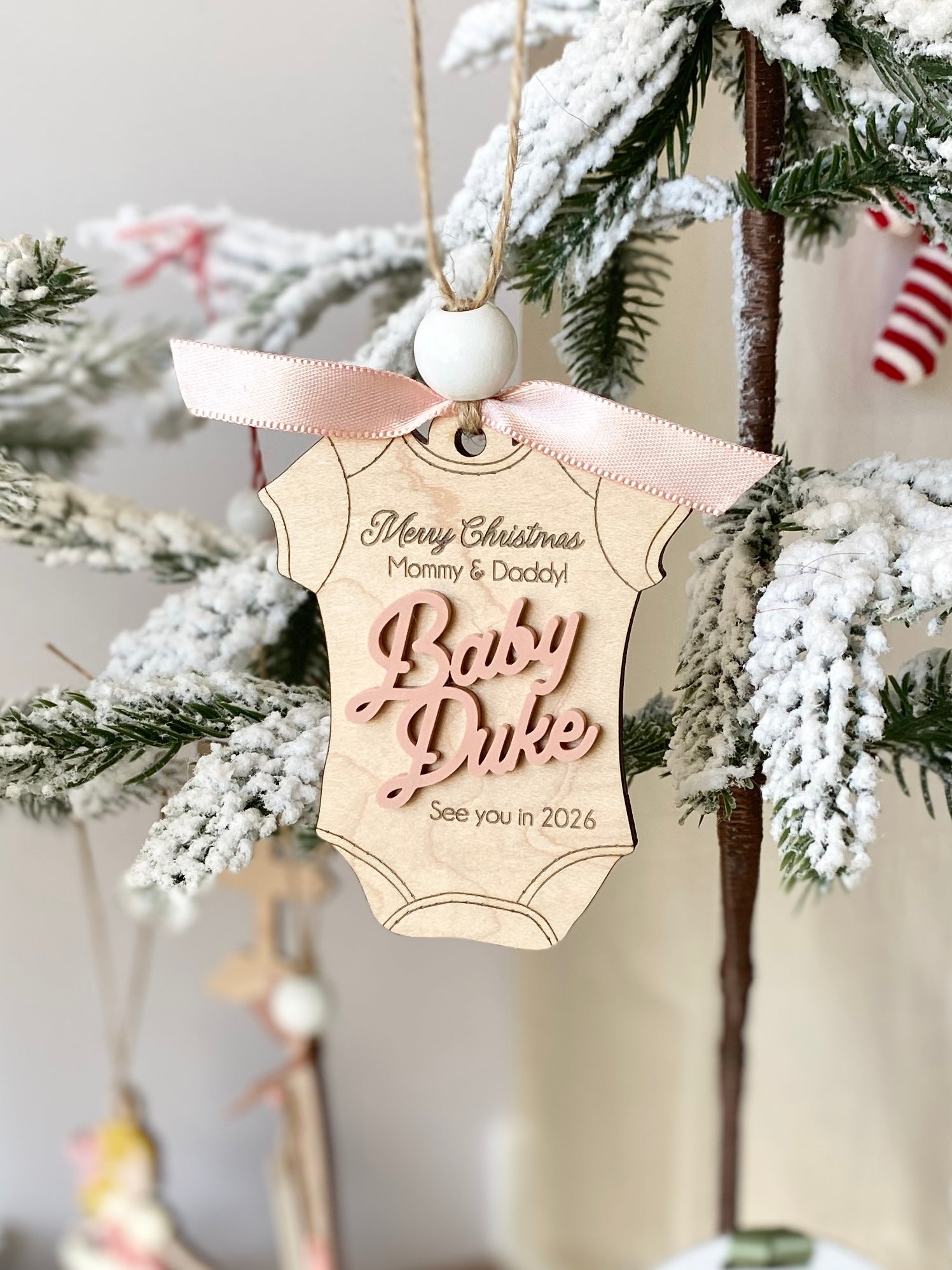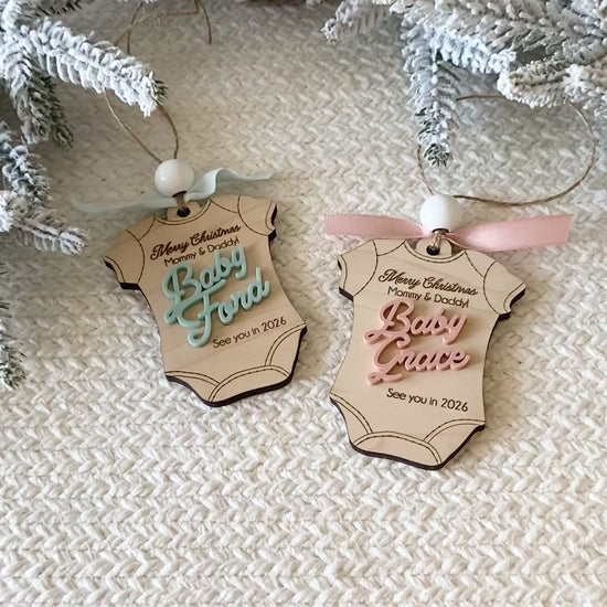 Handcrafted from layered wood and acrylic, this ornament is shaped like a cozy baby onesie and engraved with the phrase “Merry Christmas Mommy & Daddy, see you in 2026!” The baby’s name is featured in acrylic lettering — choose from pink, blue, or green for a perfectly personalized touch.