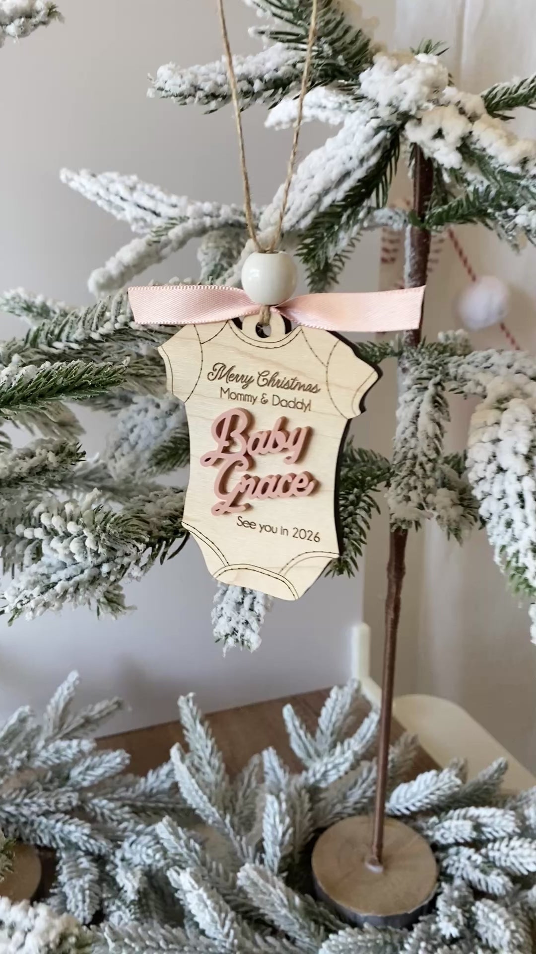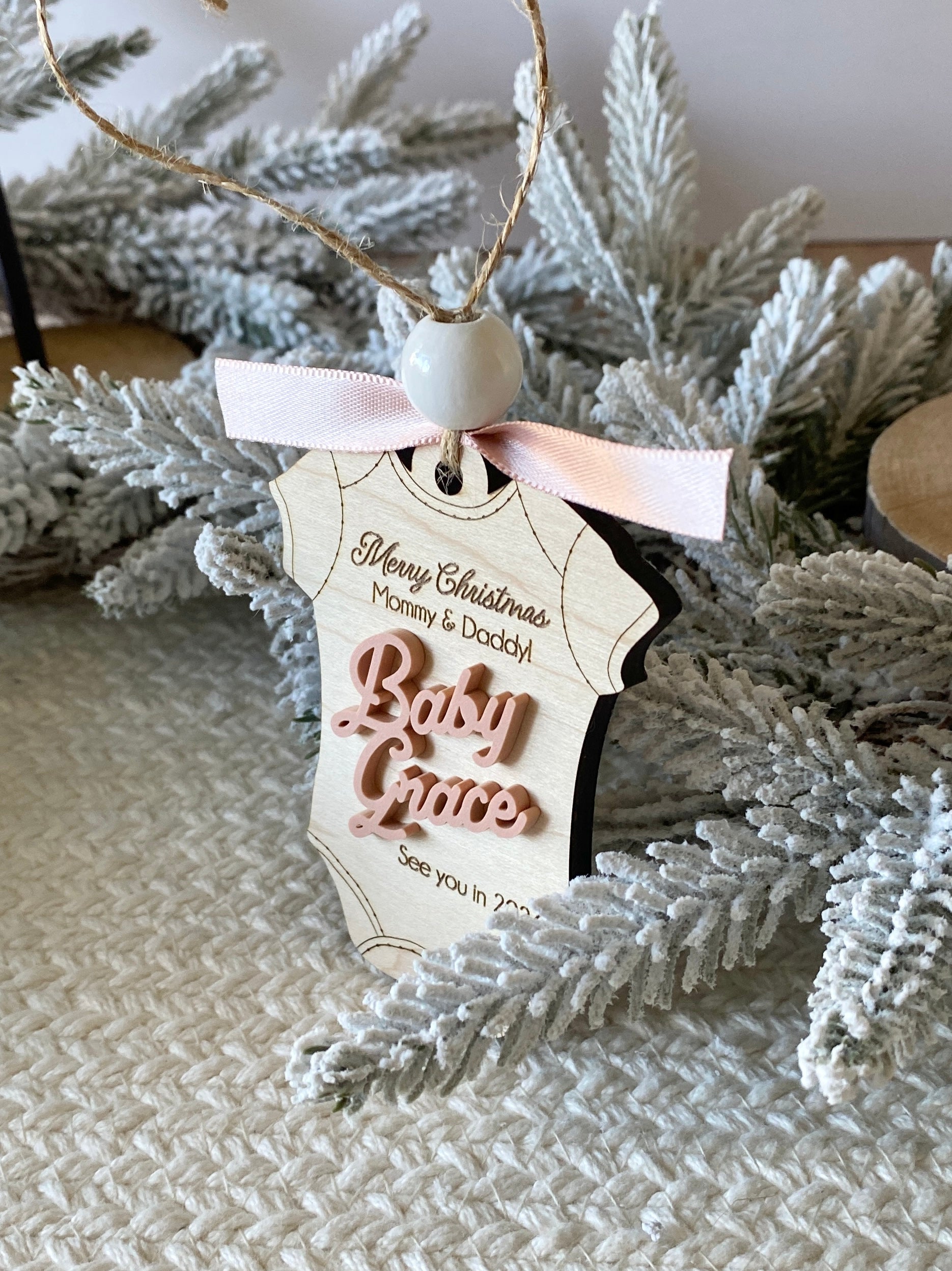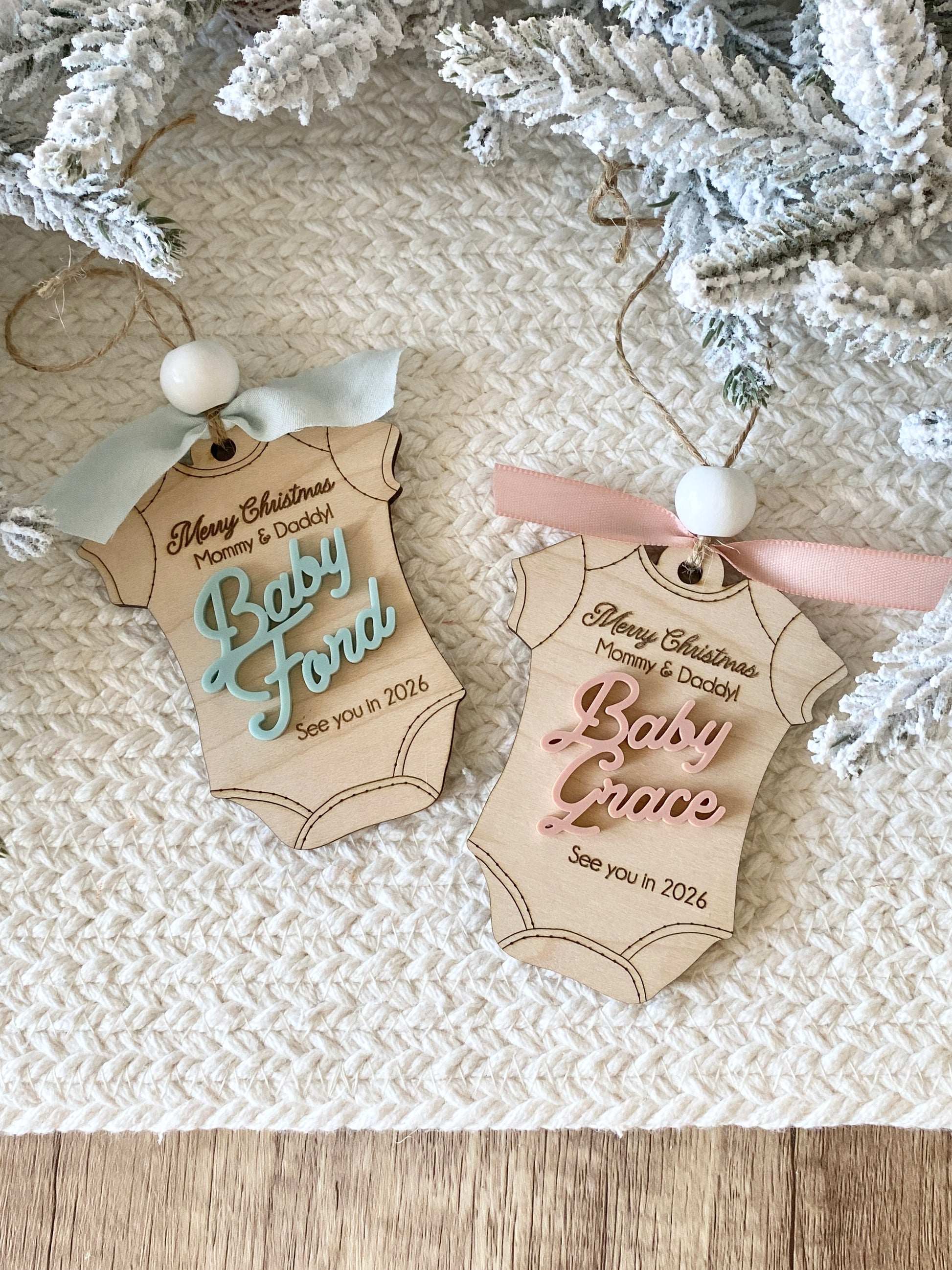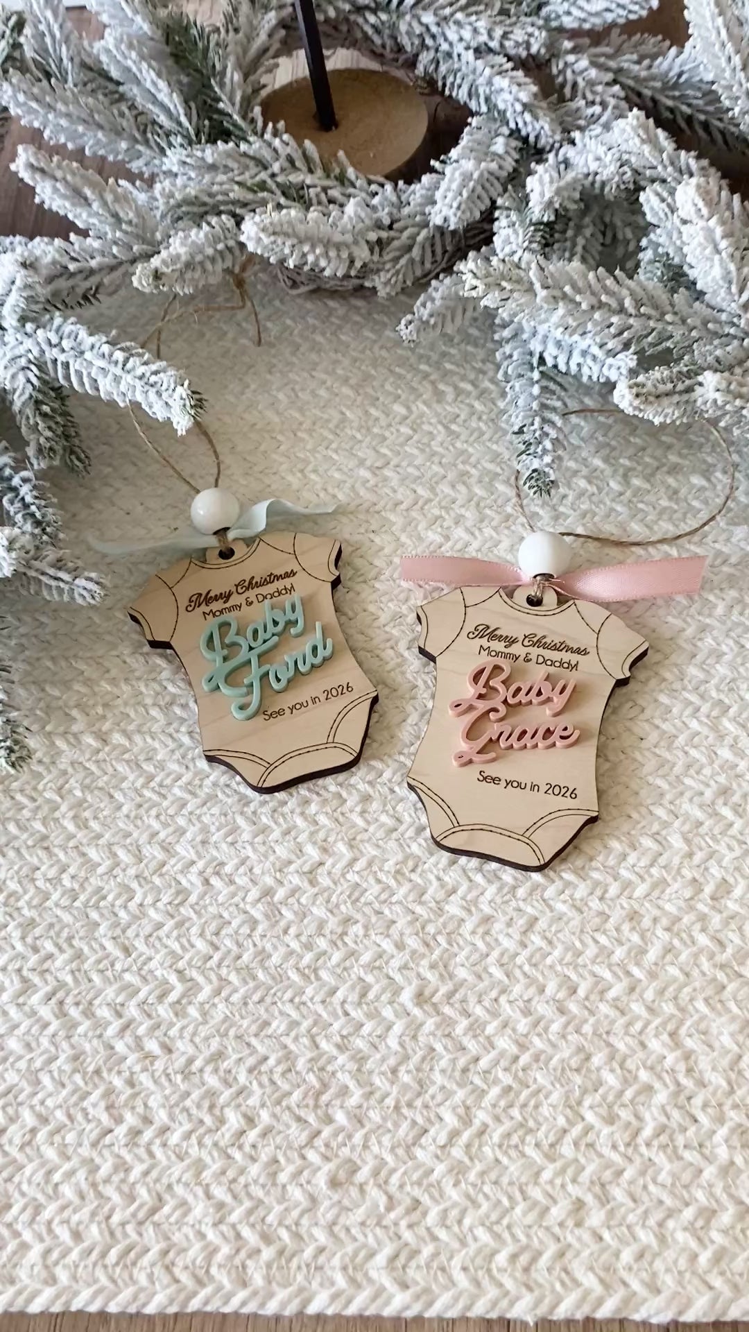 Handcrafted from layered wood and acrylic, this ornament is shaped like a cozy baby onesie and engraved with the phrase “Merry Christmas Mommy & Daddy, see you in 2026!” The baby’s name is featured in acrylic lettering — choose from pink, blue, or green for a perfectly personalized touch.