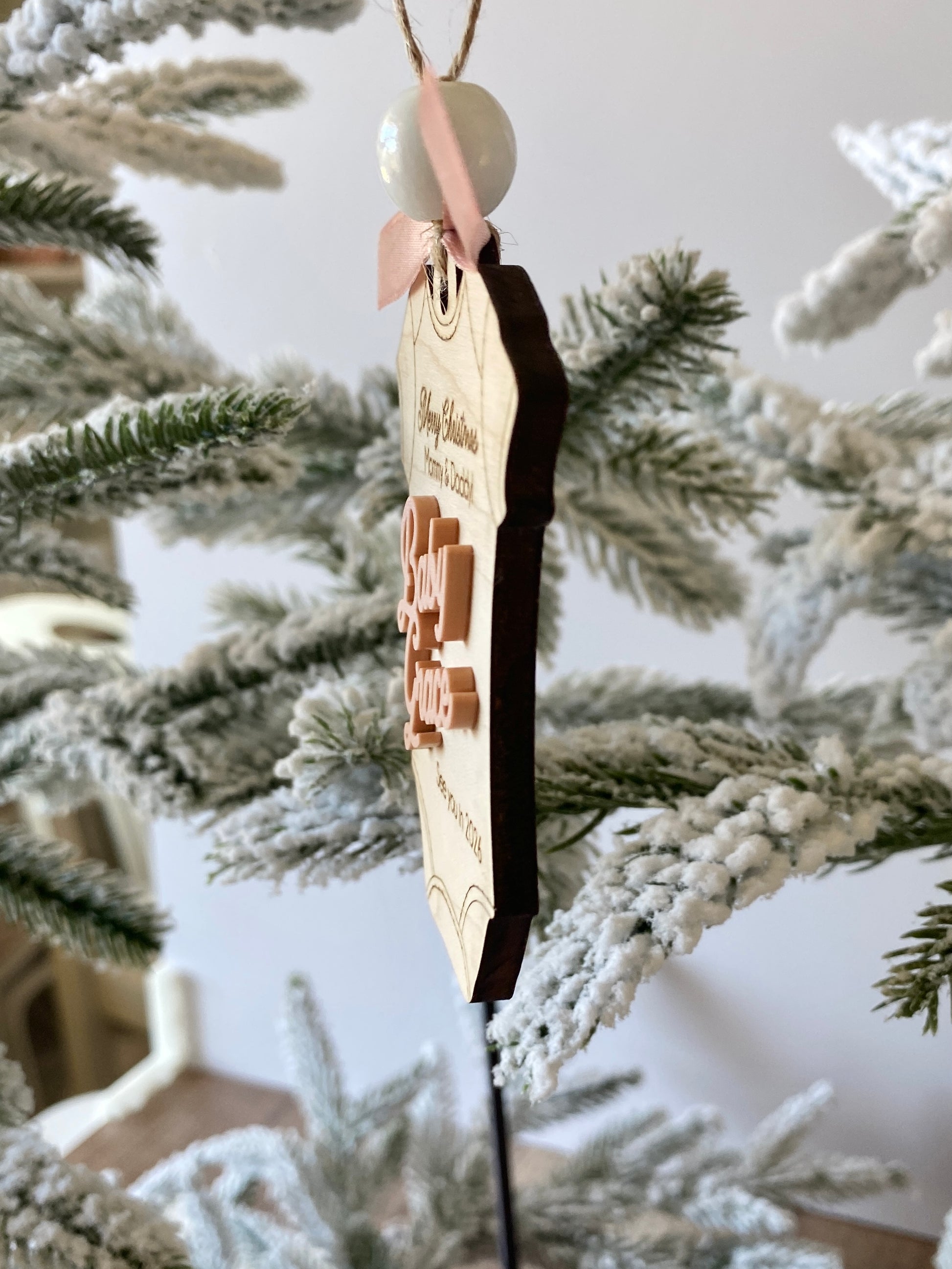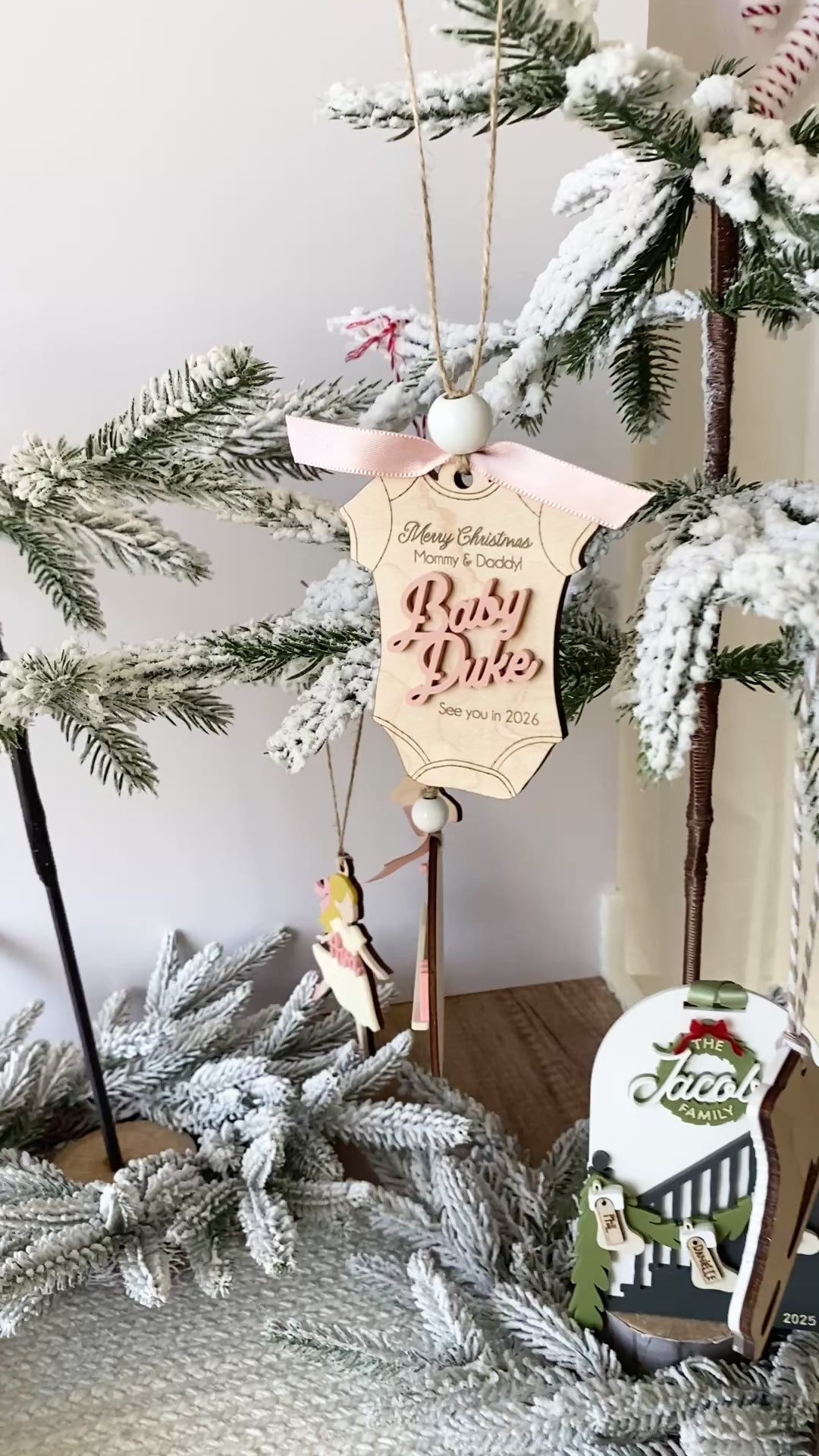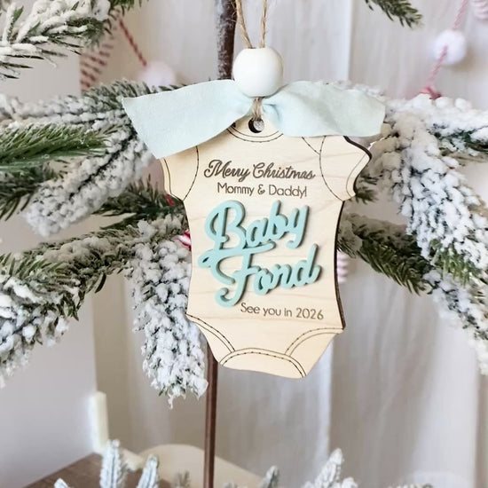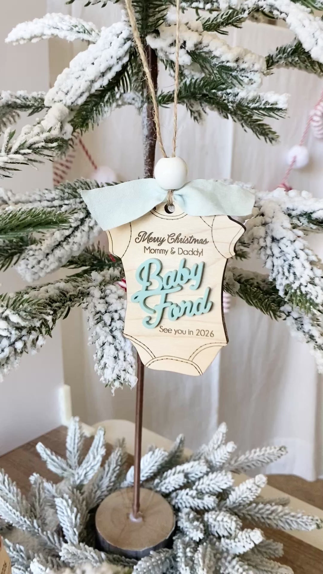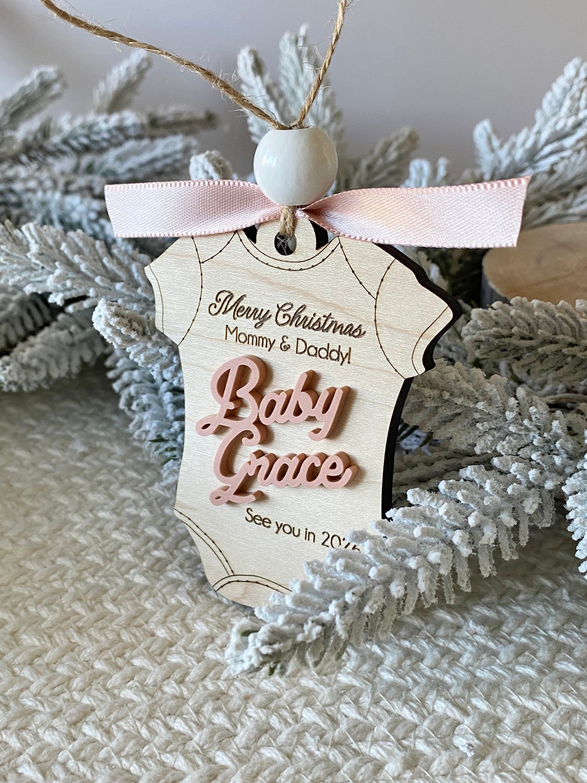 Handcrafted from layered wood and acrylic, this ornament is shaped like a cozy baby onesie and engraved with the phrase “Merry Christmas Mommy & Daddy, see you in 2026!” The baby’s name is featured in acrylic lettering — choose from pink, blue, or green for a perfectly personalized touch.