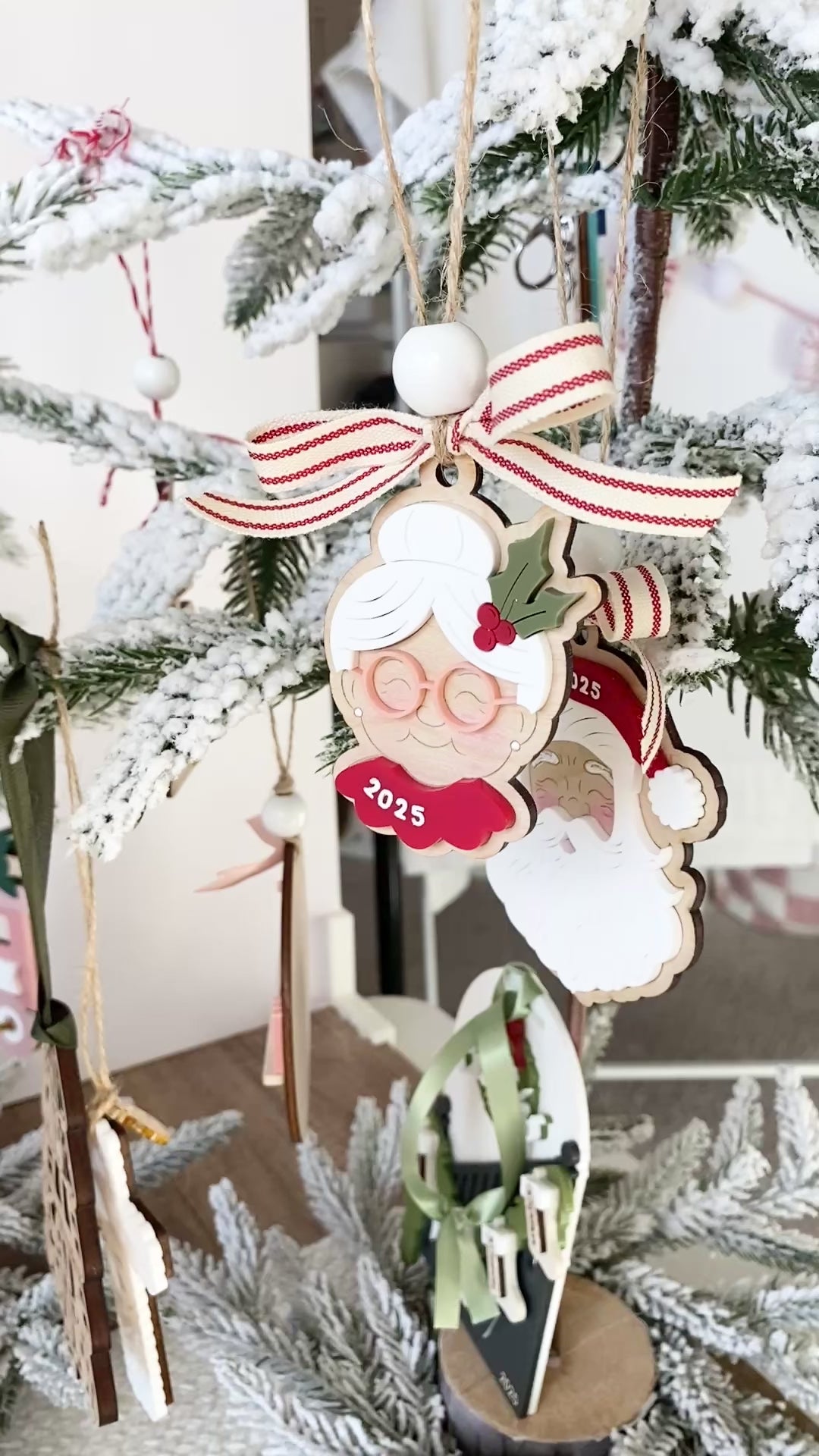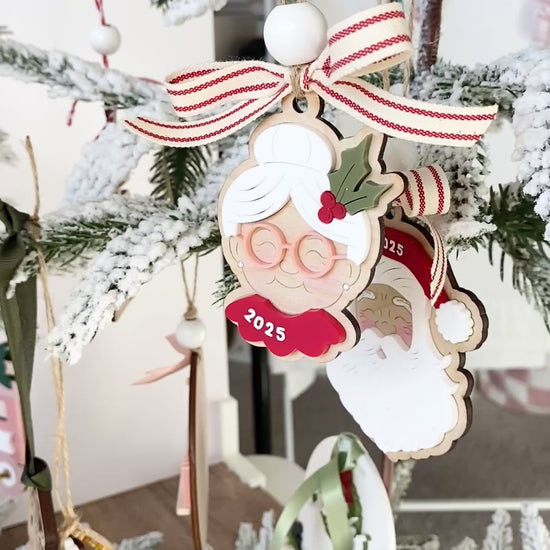 Celebrate the magic of Christmas and the joy of togetherness with this adorable Mr. & Mrs. Claus ornament set. Each piece is handcrafted from layered wood and acrylic, featuring all the festive details you’d expect from the North Pole’s favorite couple.