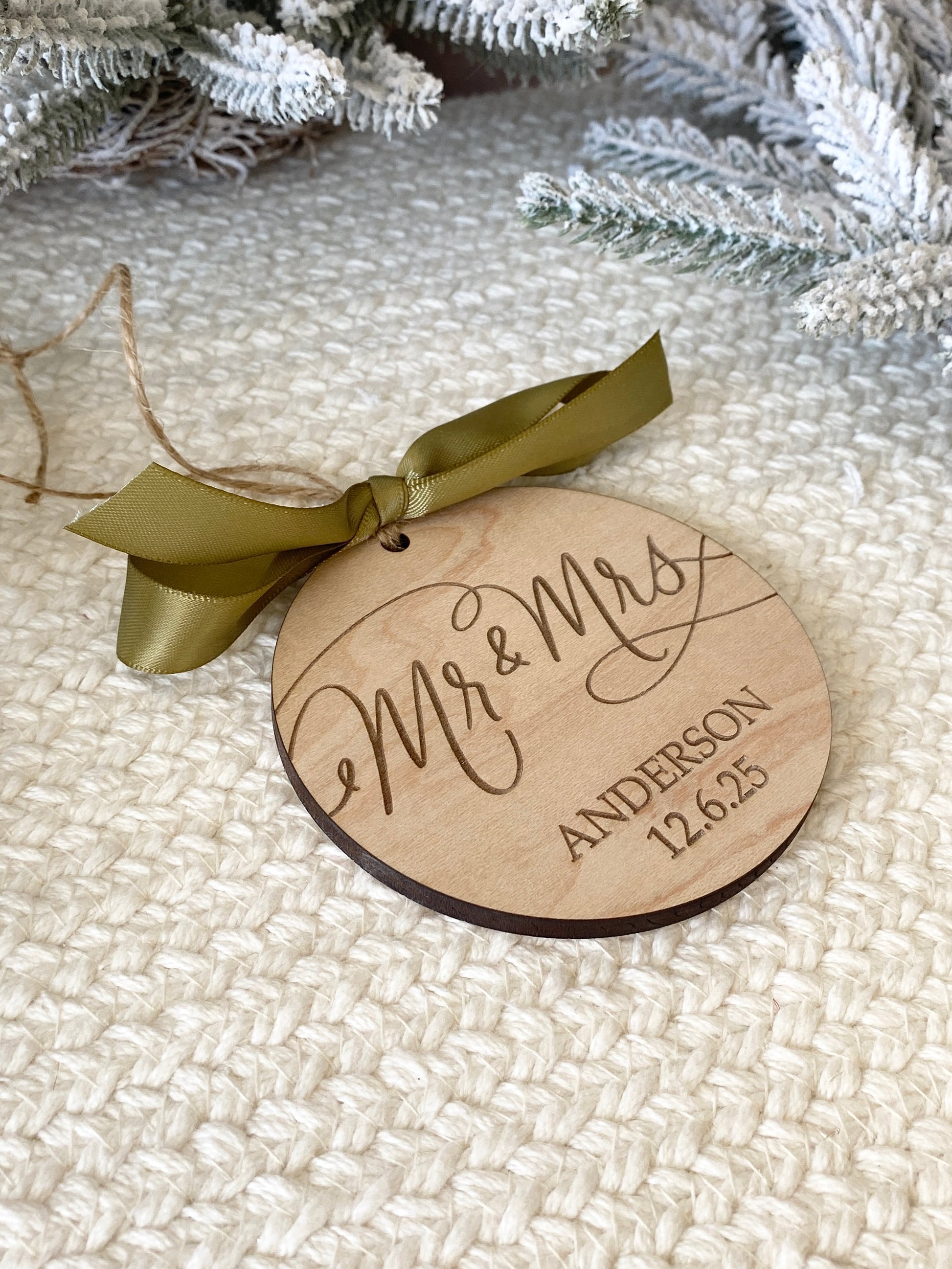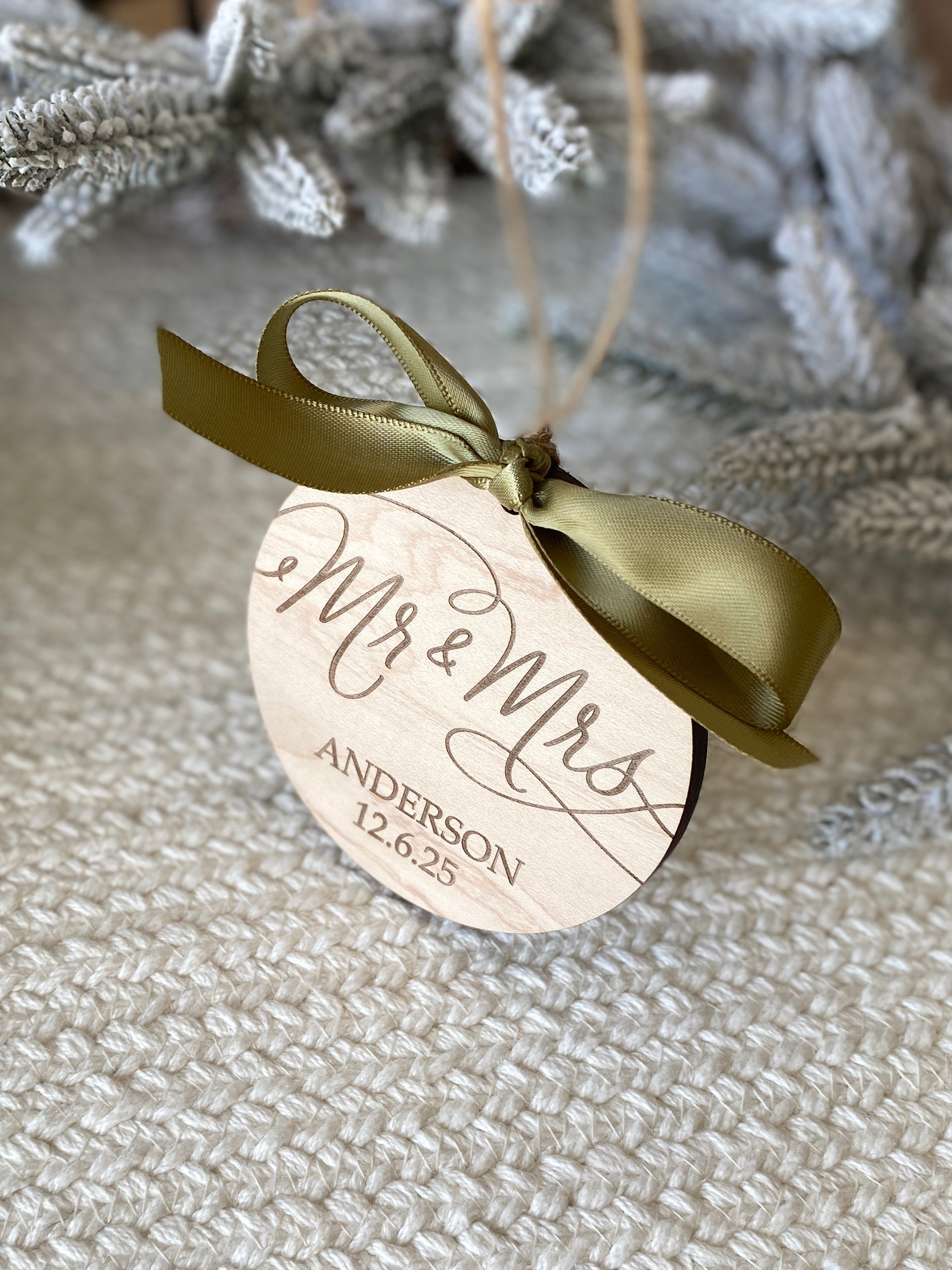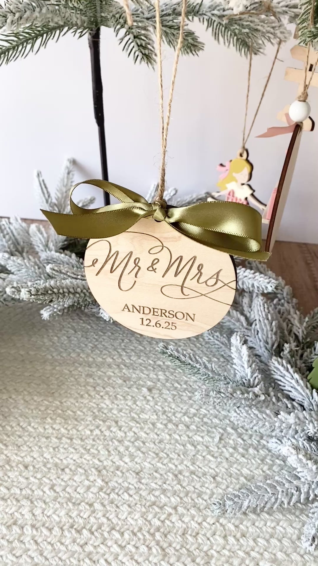 Crafted from natural 1/4" wood and finished with an elegant olive-green satin ribbon, each ornament is engraved with “Mr. & Mrs.”, the family name, and wedding date ~ creating a heartfelt reminder of the day “forever” began.