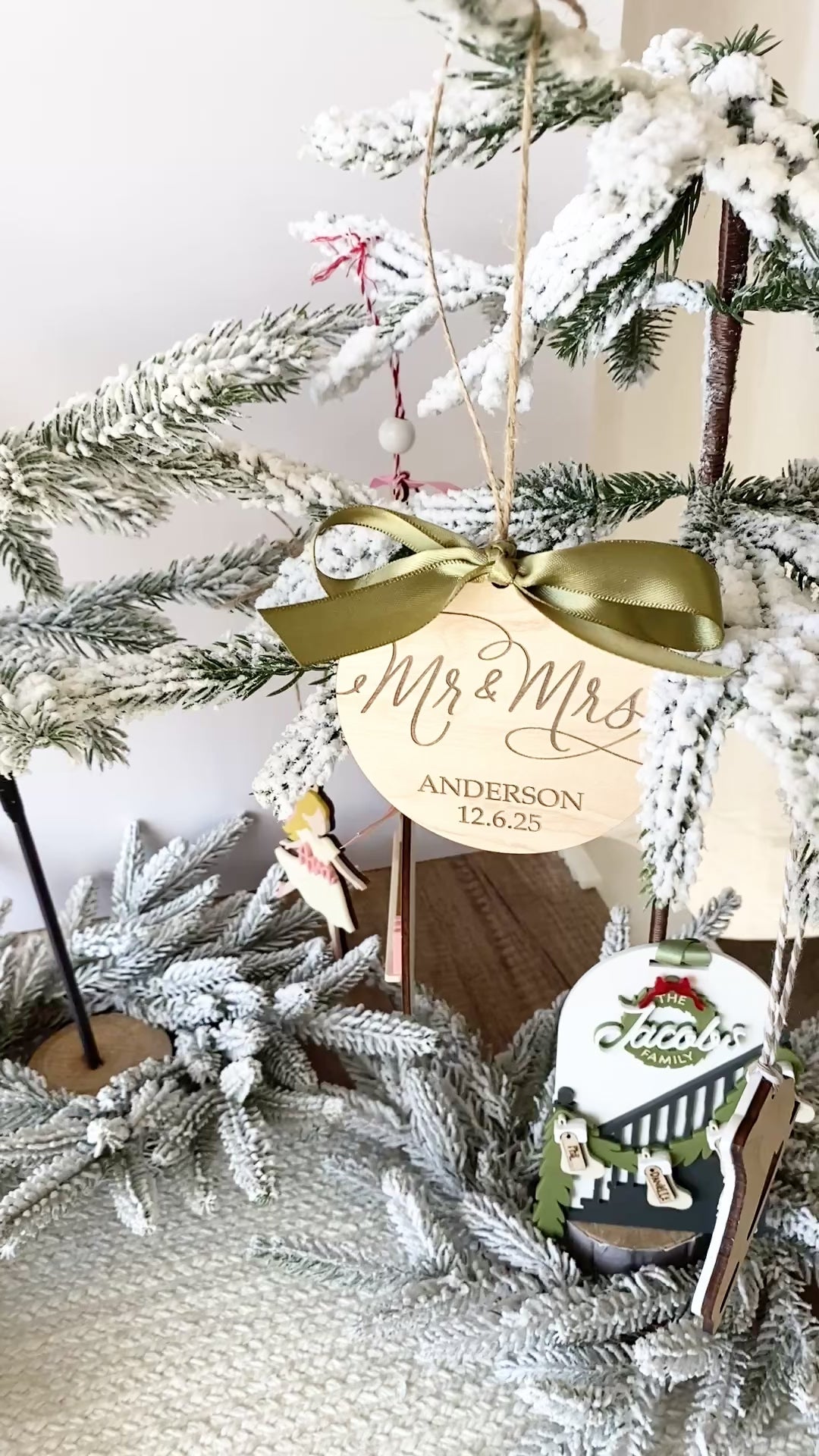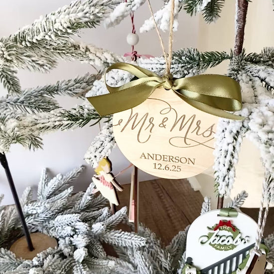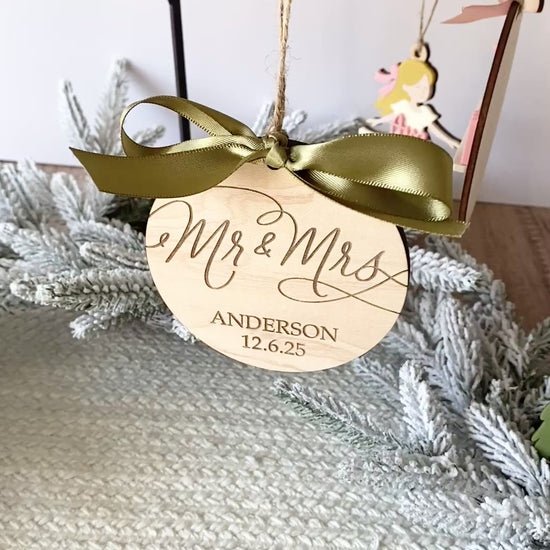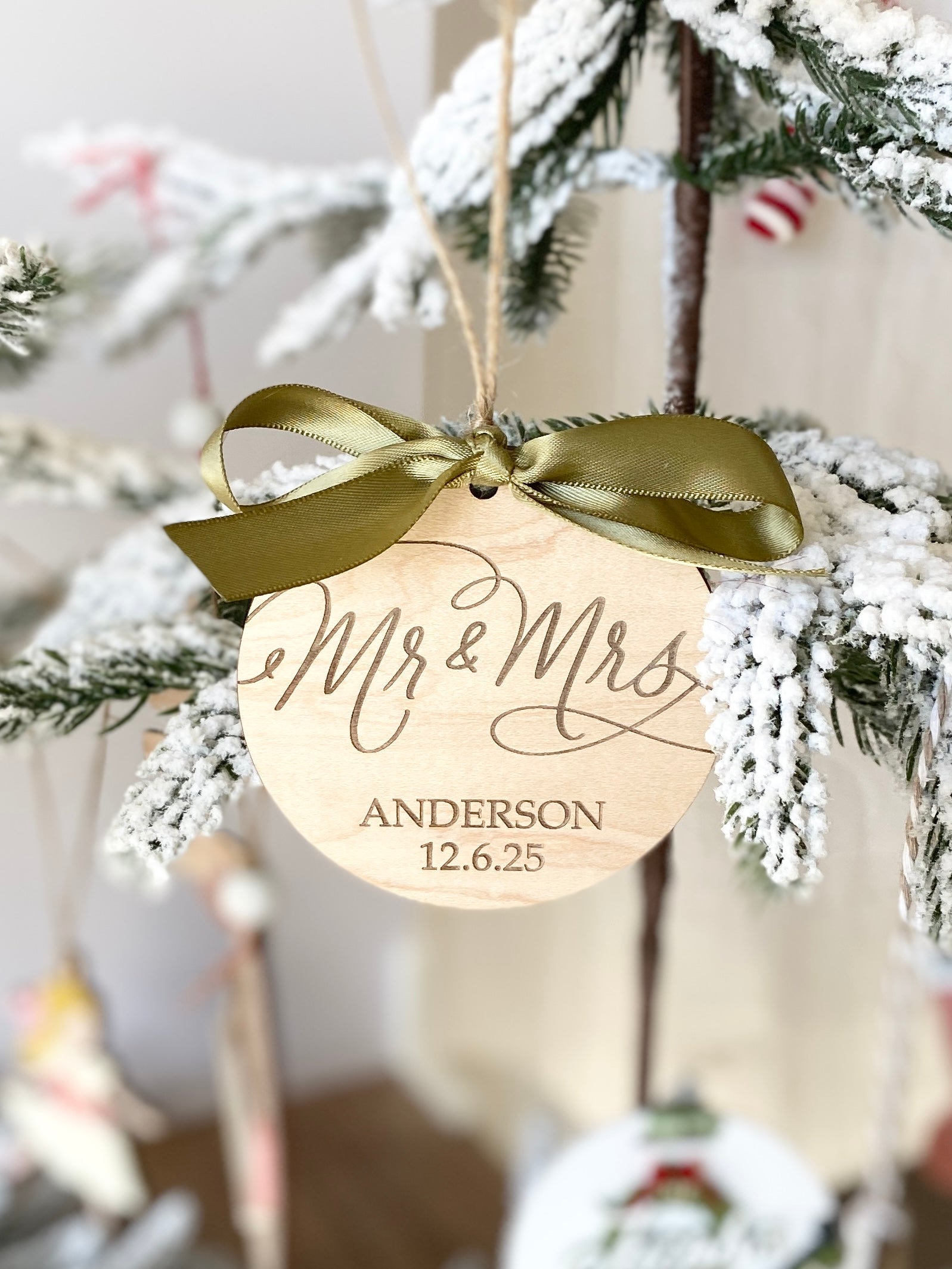 Crafted from natural 1/4" wood and finished with an elegant olive-green satin ribbon, each ornament is engraved with “Mr. & Mrs.”, the family name, and wedding date ~ creating a heartfelt reminder of the day “forever” began.