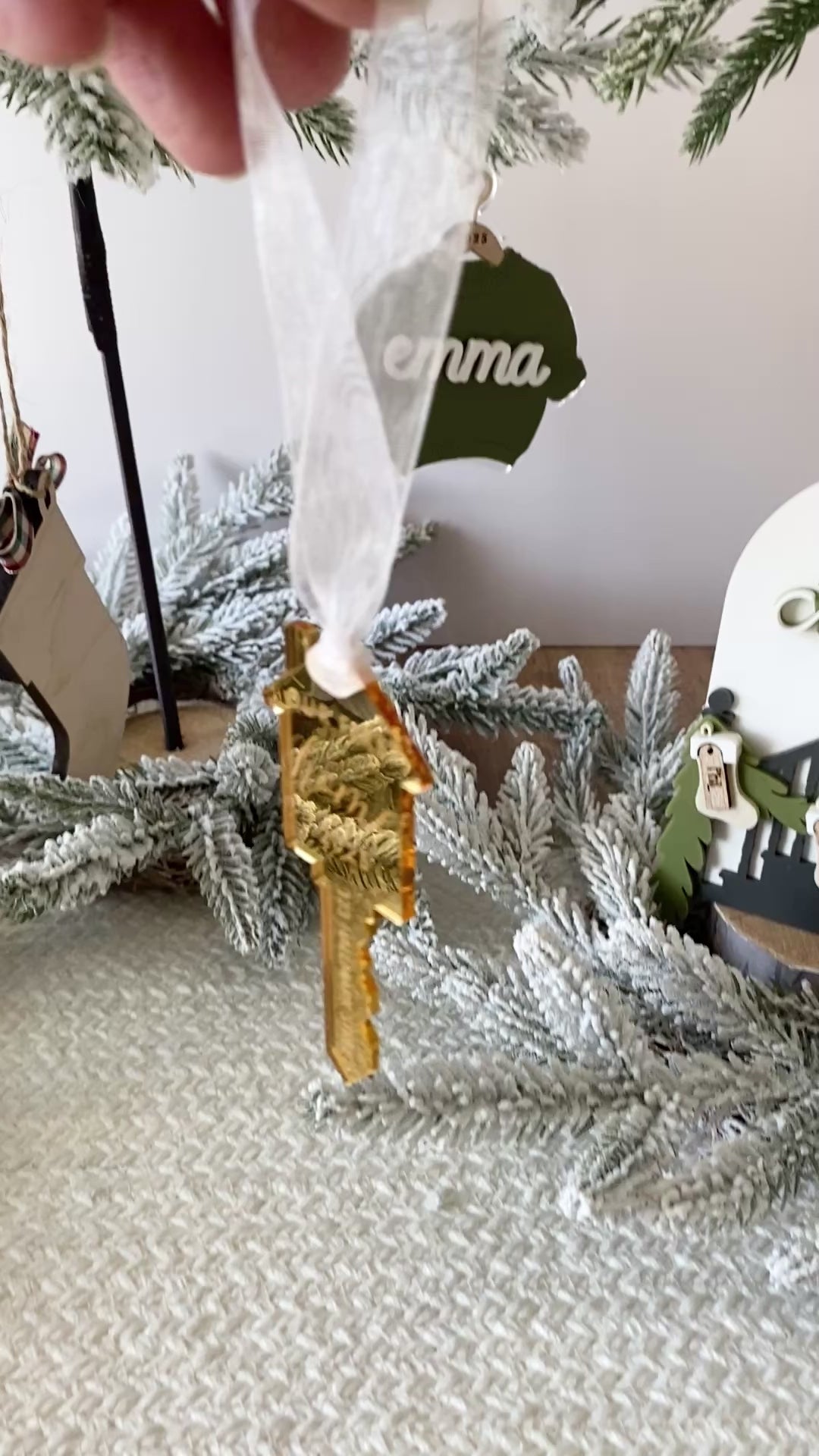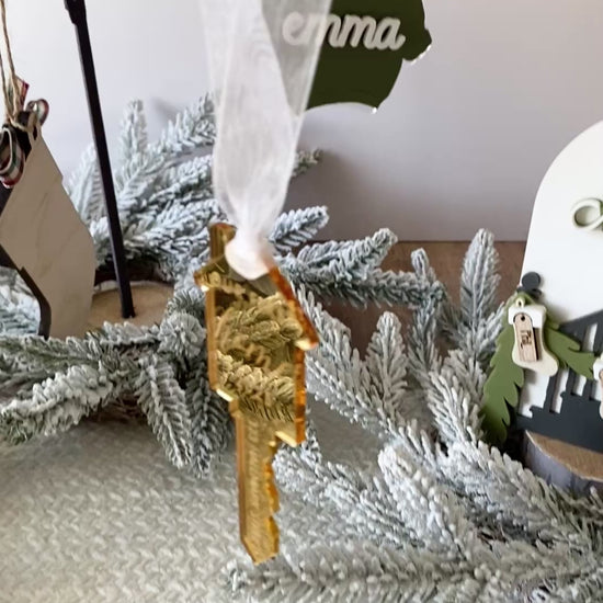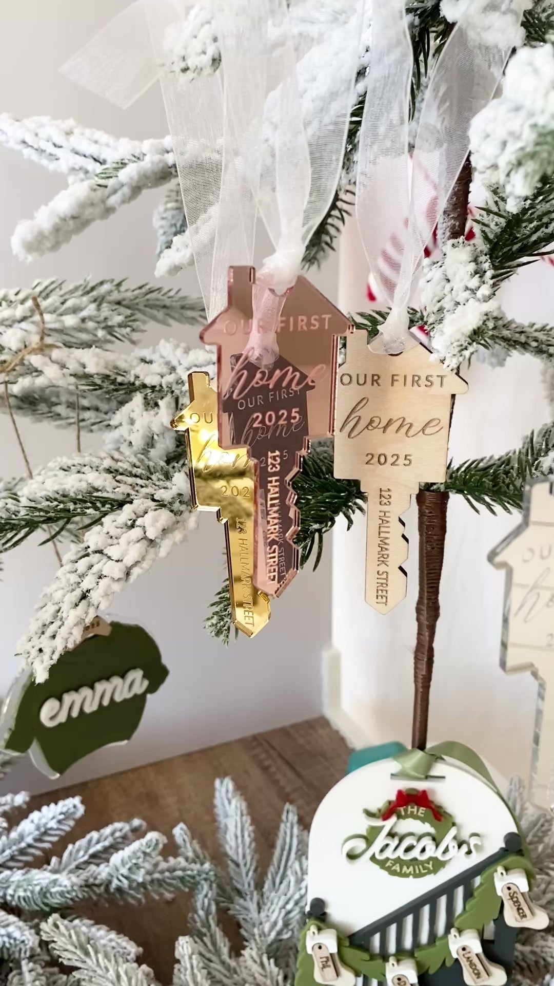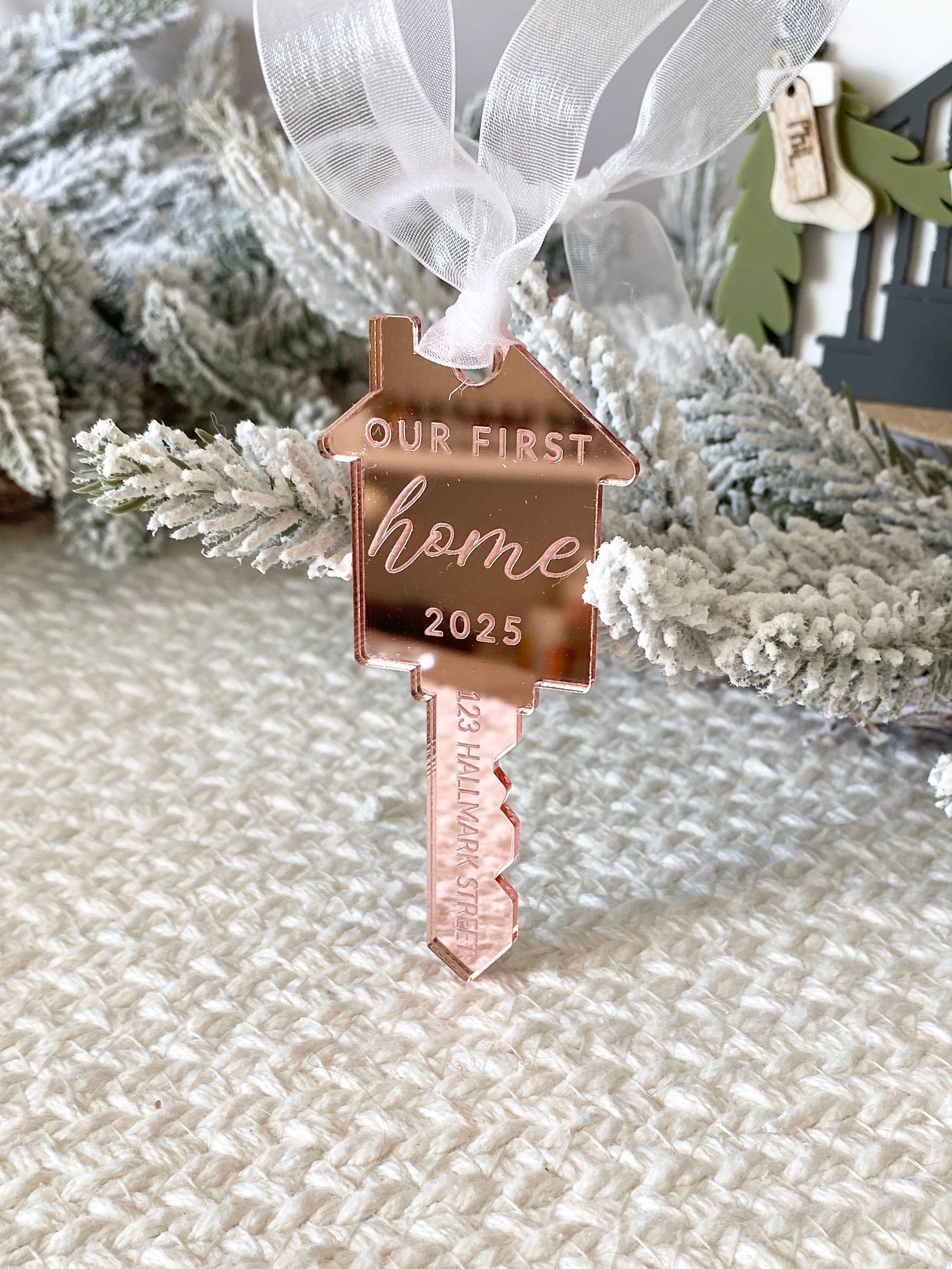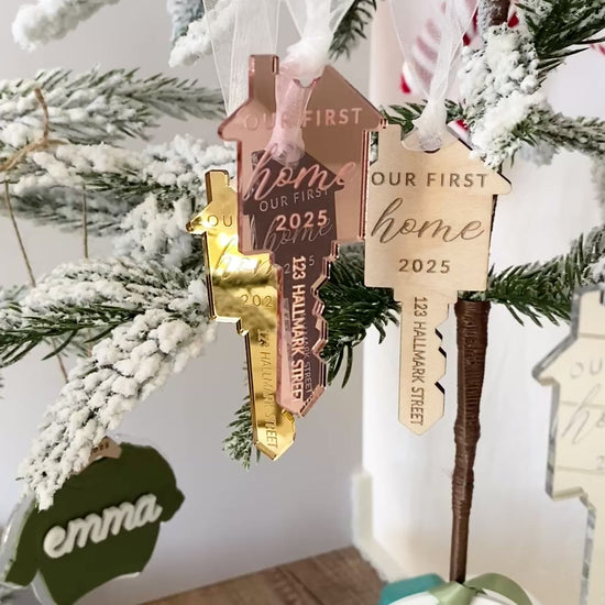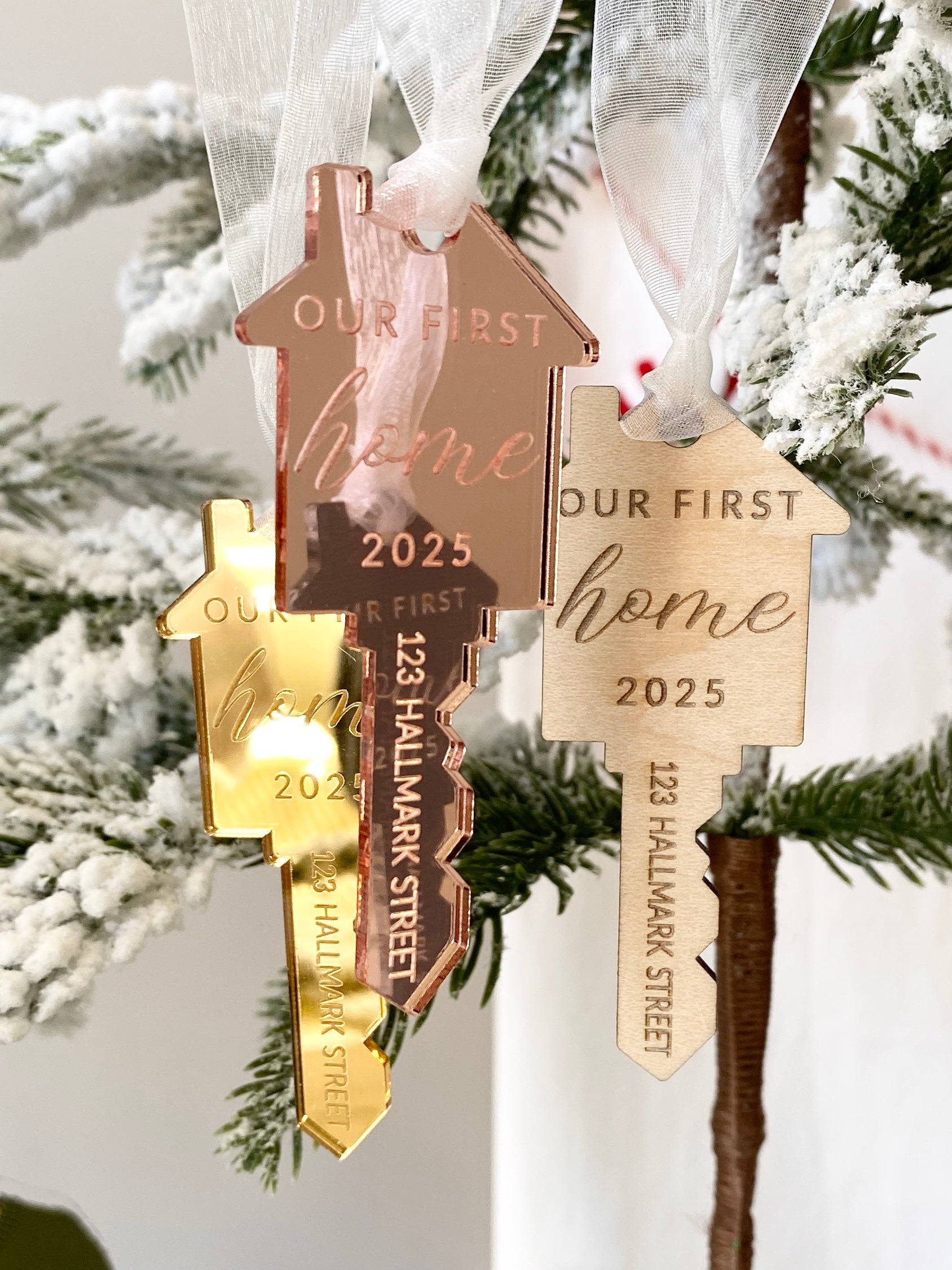 Shaped like a house key, each ornament is engraved with “Our First Home,” the year, and your address — a beautiful reminder of the place where new memories begin. Available in four stunning finishes — natural wood, gold mirror, blush mirror, or silver mirror — and finished with soft white ribbon for hanging.