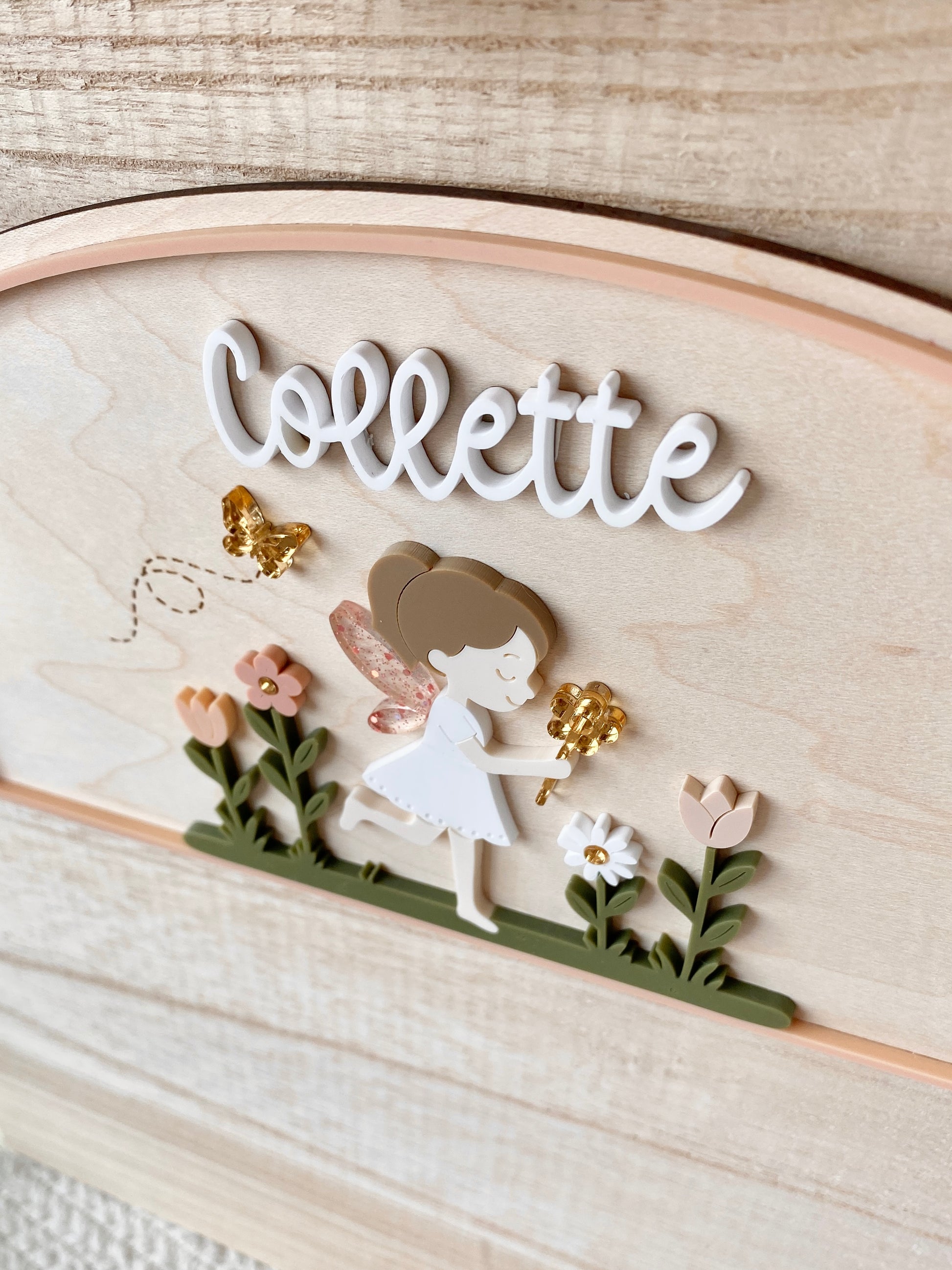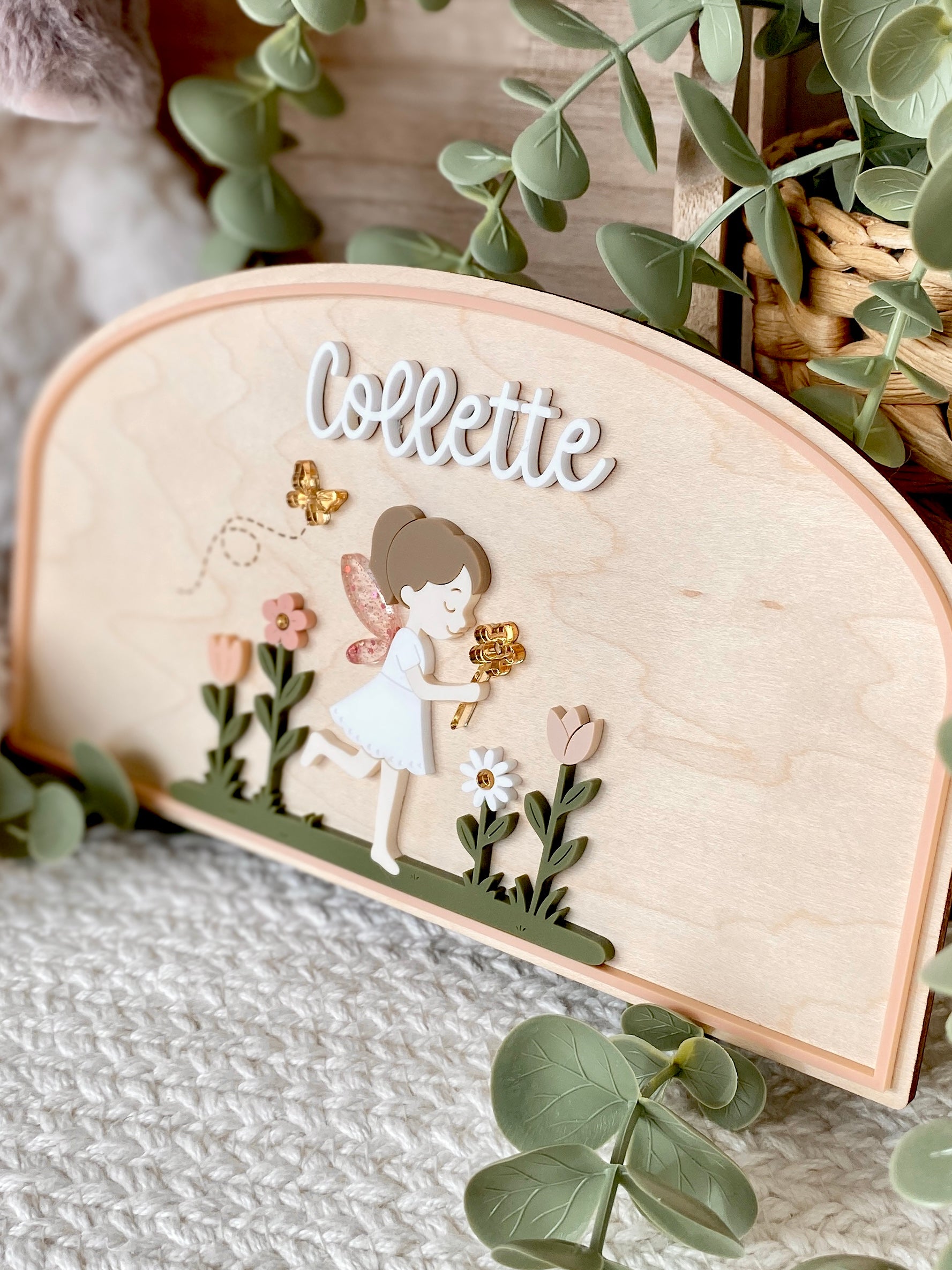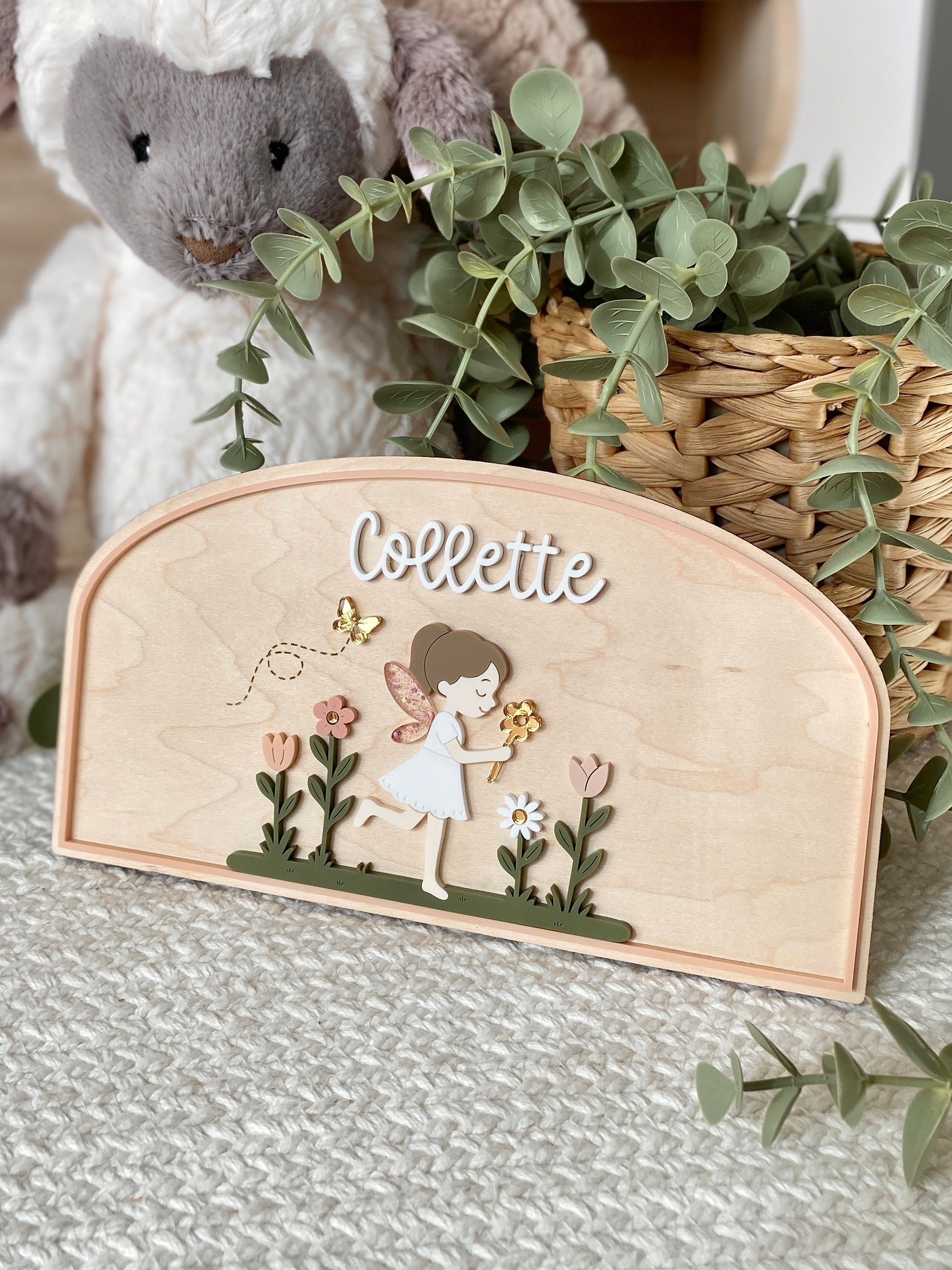 This Personalized Garden Fairy Name Plaque features a delicate layered design with soft, storybook-inspired details. Crafted from wood and acrylic, each piece is precision cut and carefully assembled to create a beautifully dimensional finish that feels both playful and refined.