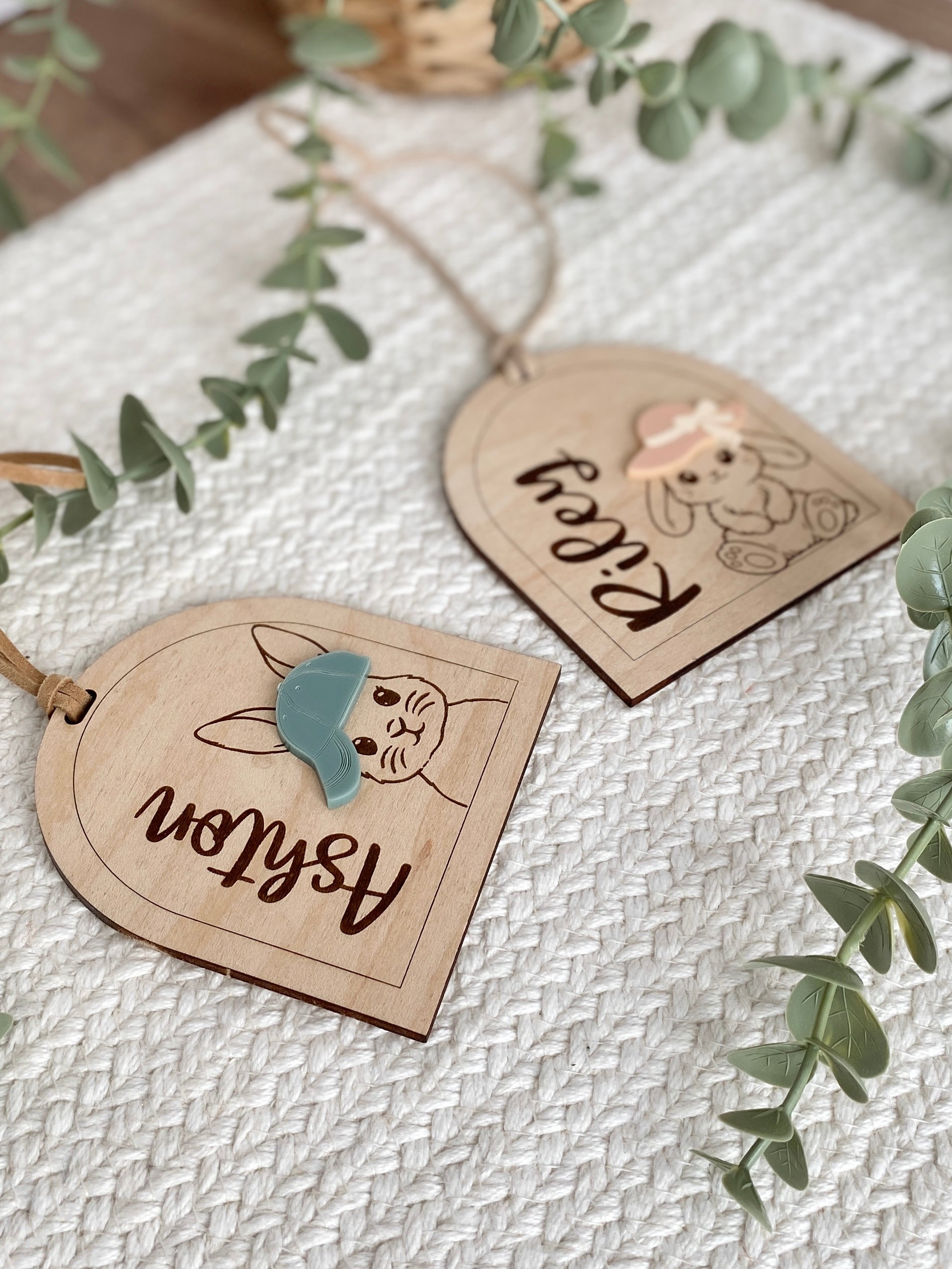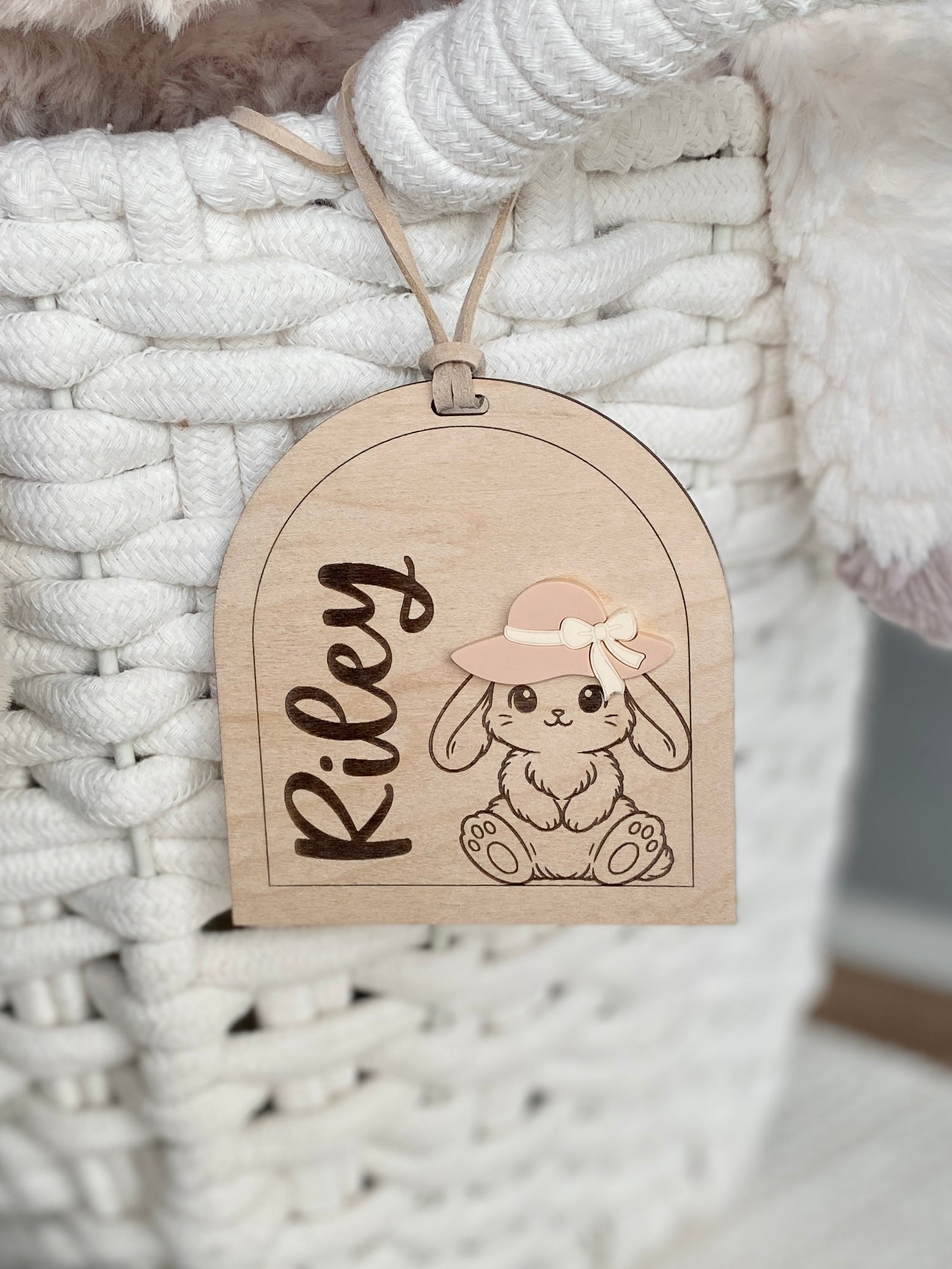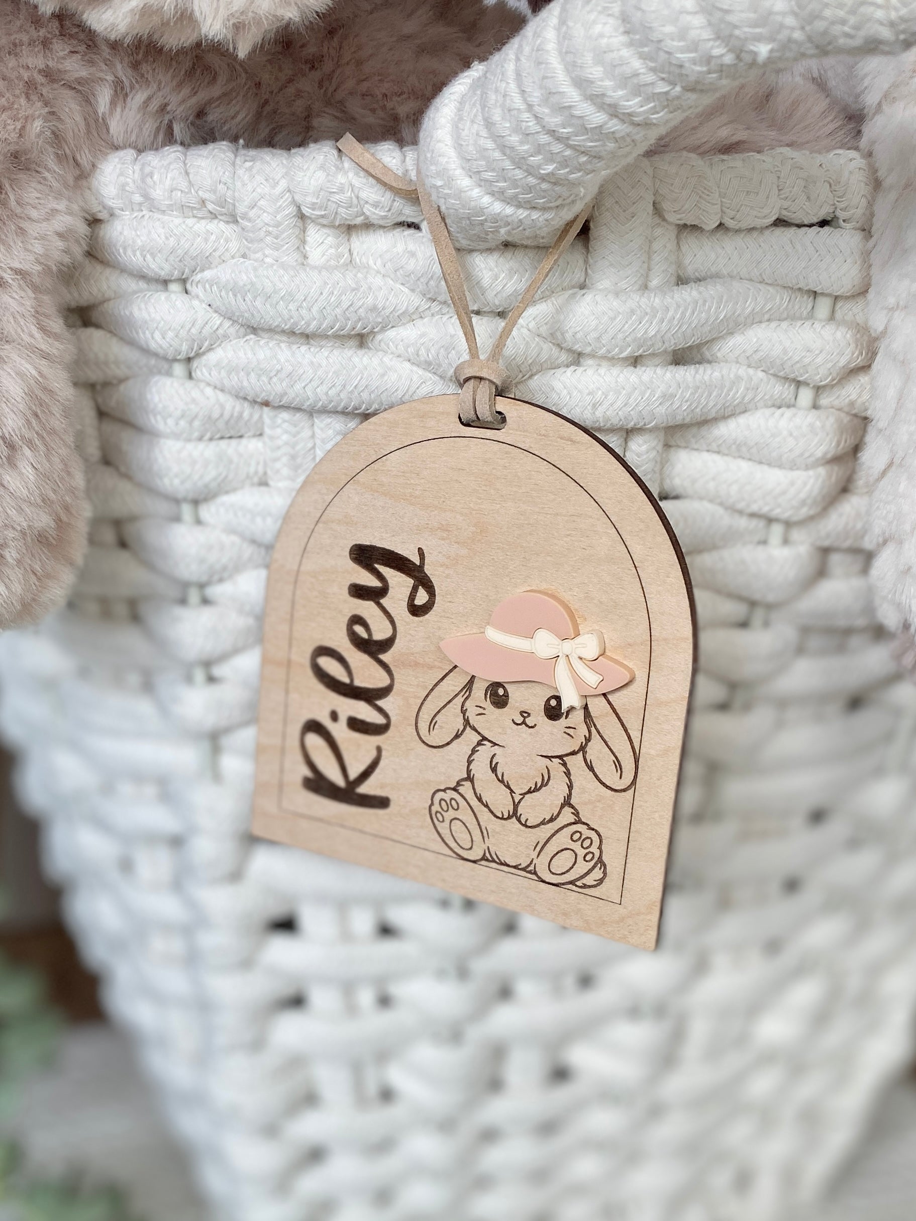 Featuring an engraved bunny illustration and layered acrylic hat detail, this design brings a modern, playful feel to traditional Easter baskets. Each tag is personalized with one name and finished with a soft faux suede hanging cord.