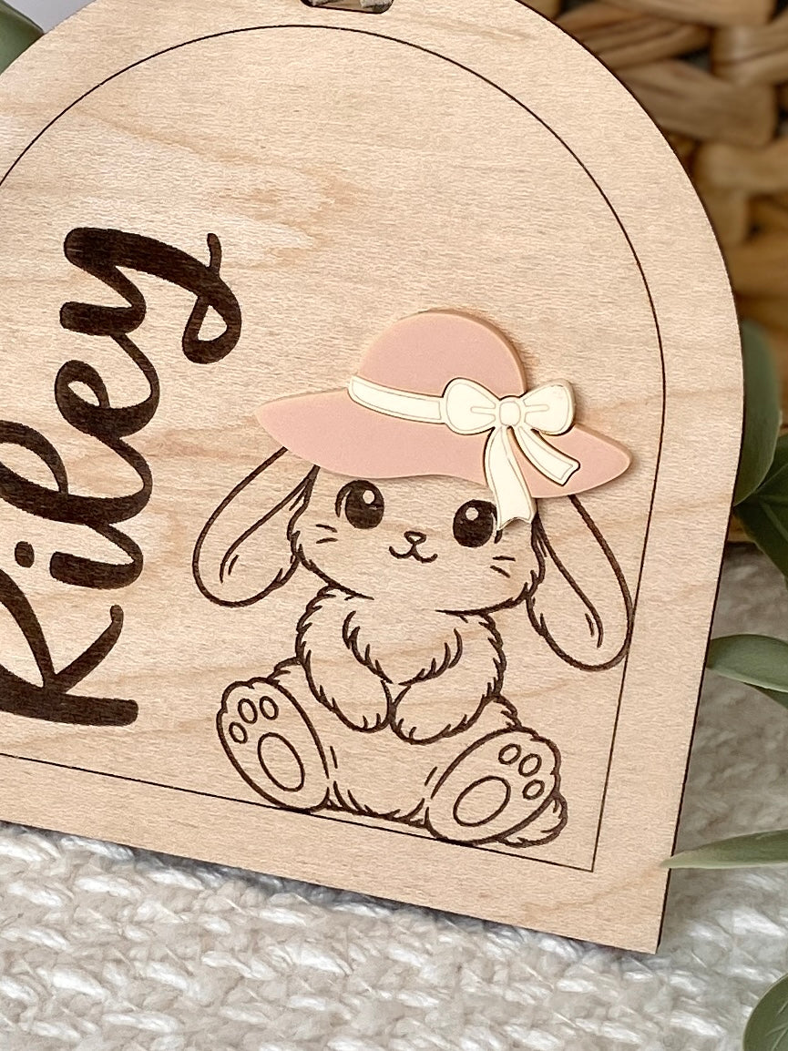 Add a fun and personalized touch to Easter morning with this custom hat bunny name tag.