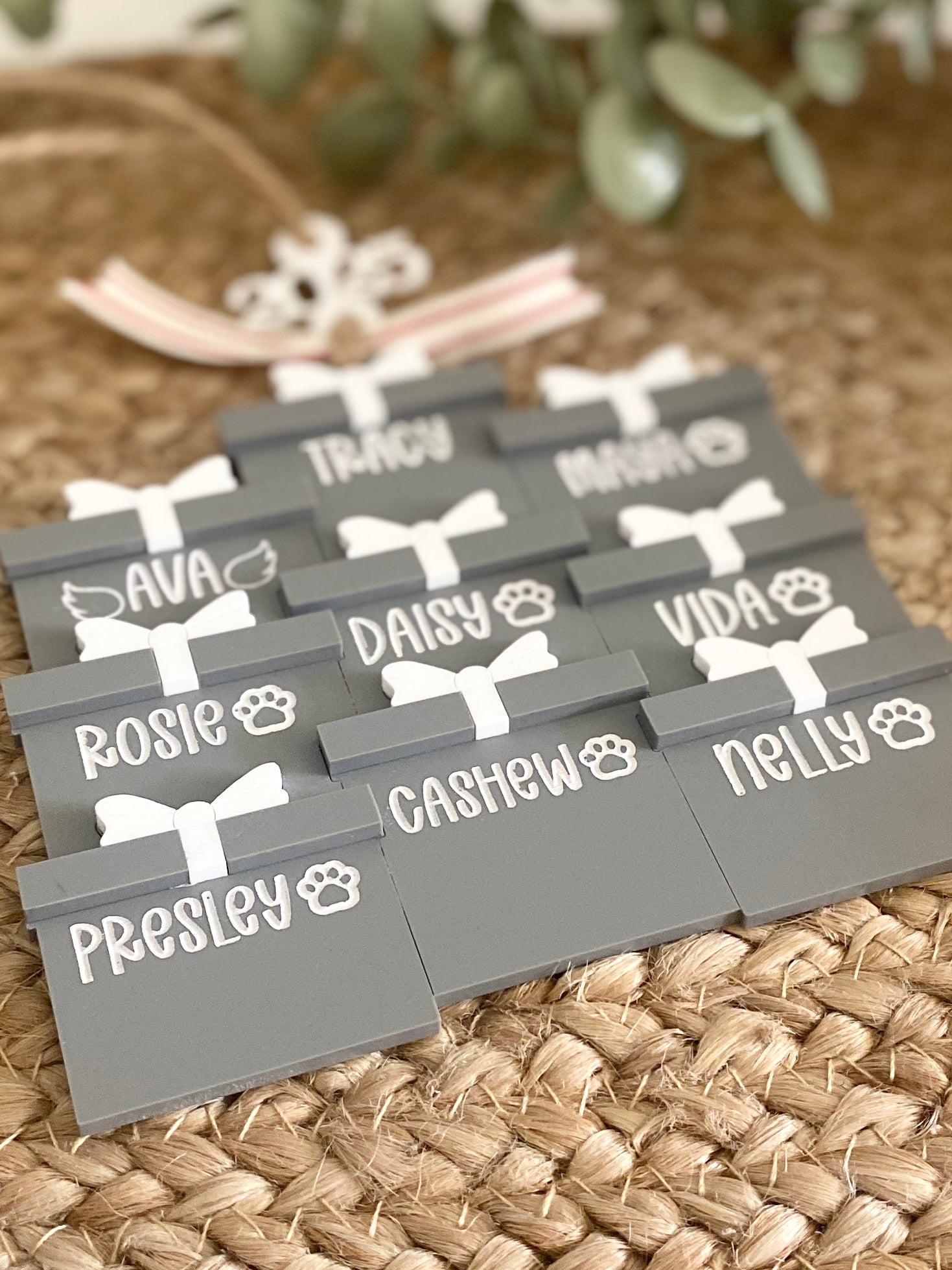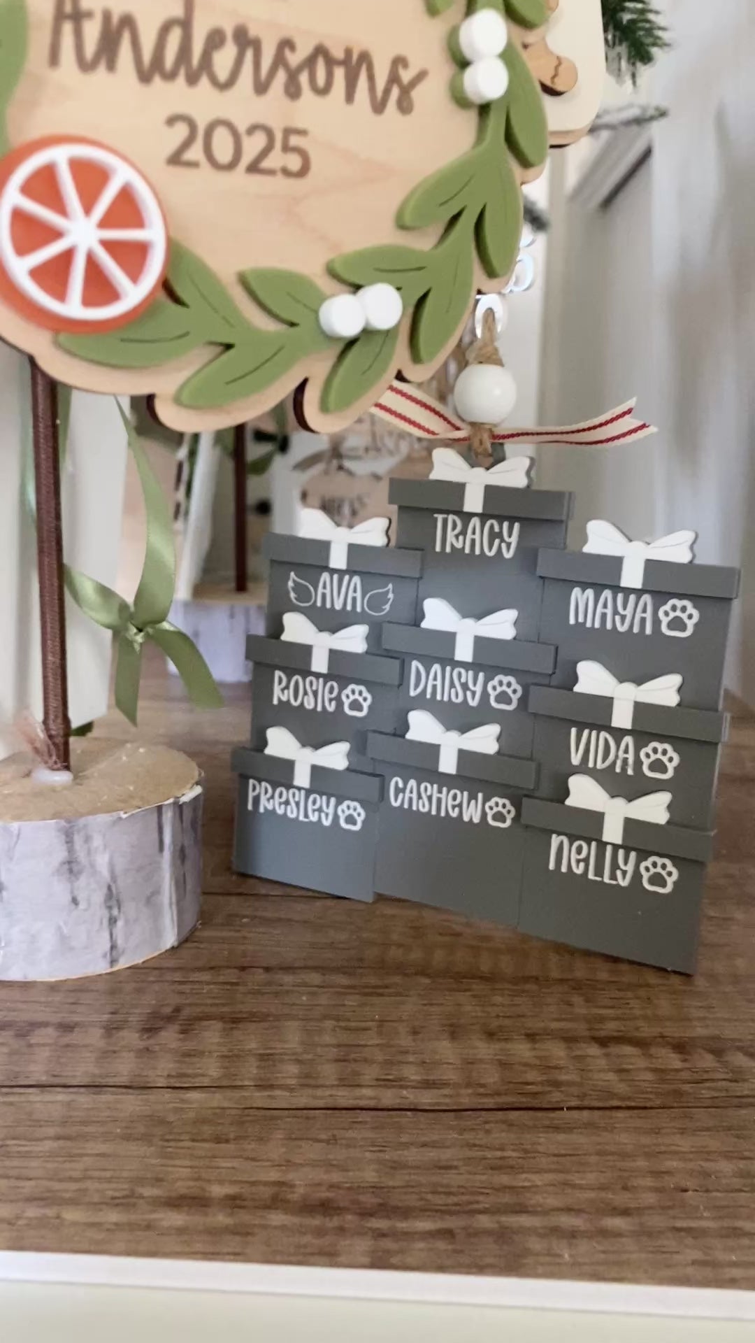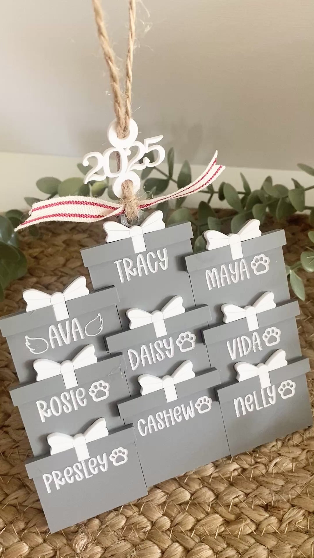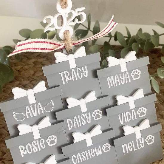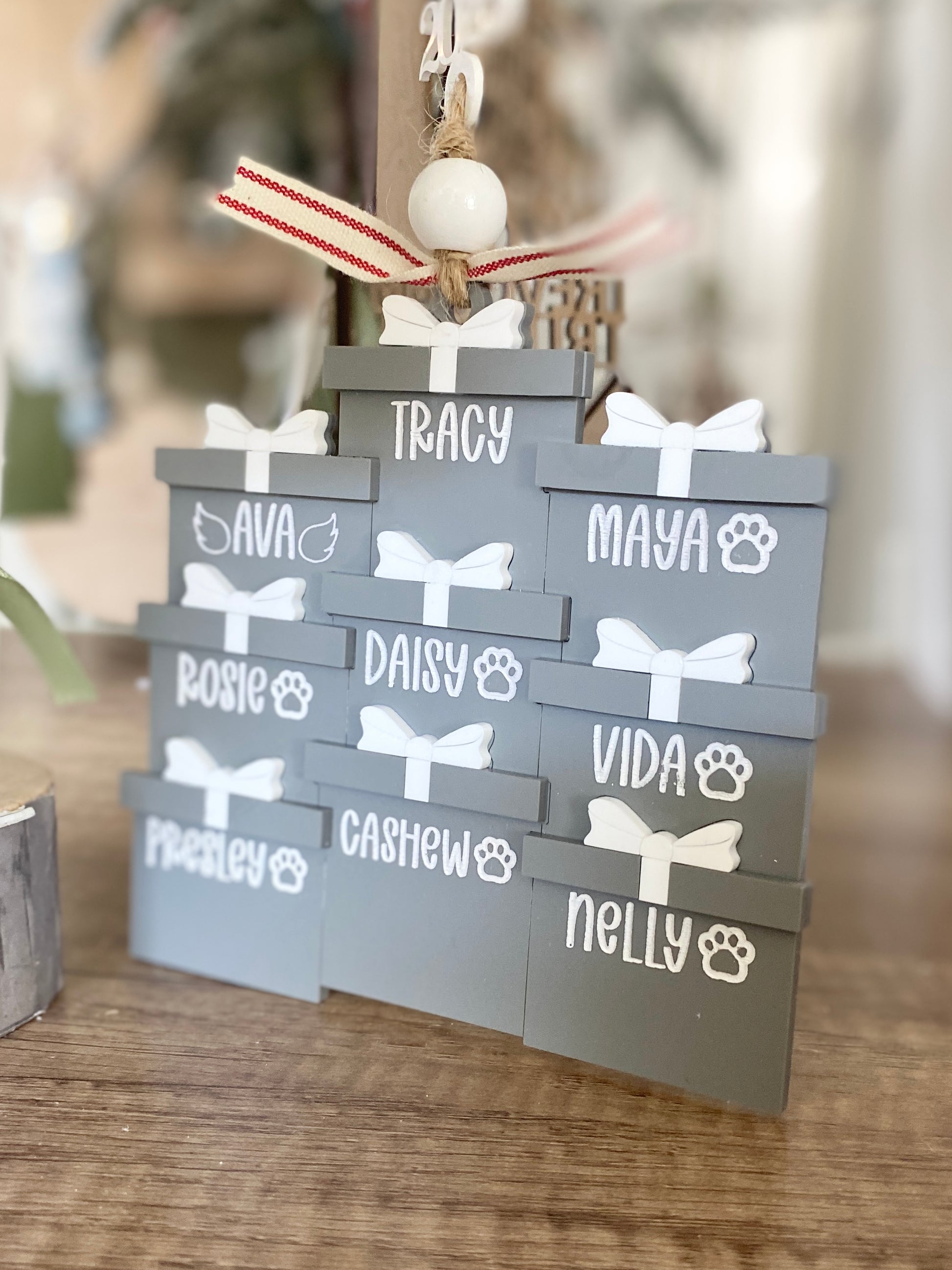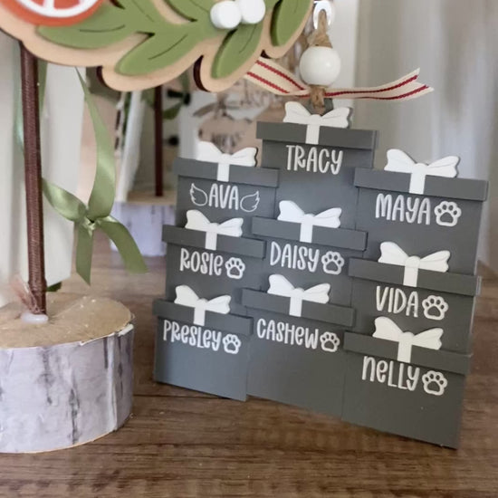 Each “gift” is crafted from acrylic and engraved with a family member’s name, then paint-filled by hand for a crisp, lasting finish. Your family’s “gift pile” can include up to 10 presents, making this ornament perfect for both small and large families. The year is added at the very top and tied to the stack like the final bow on a Christmas package. You can even add paw prints or angel wings to honor beloved pets or family members who’ve passed.