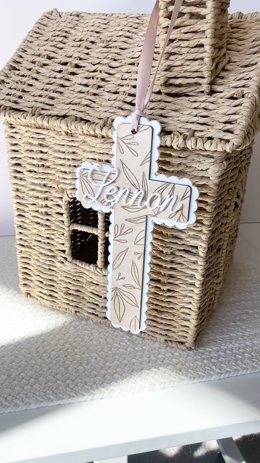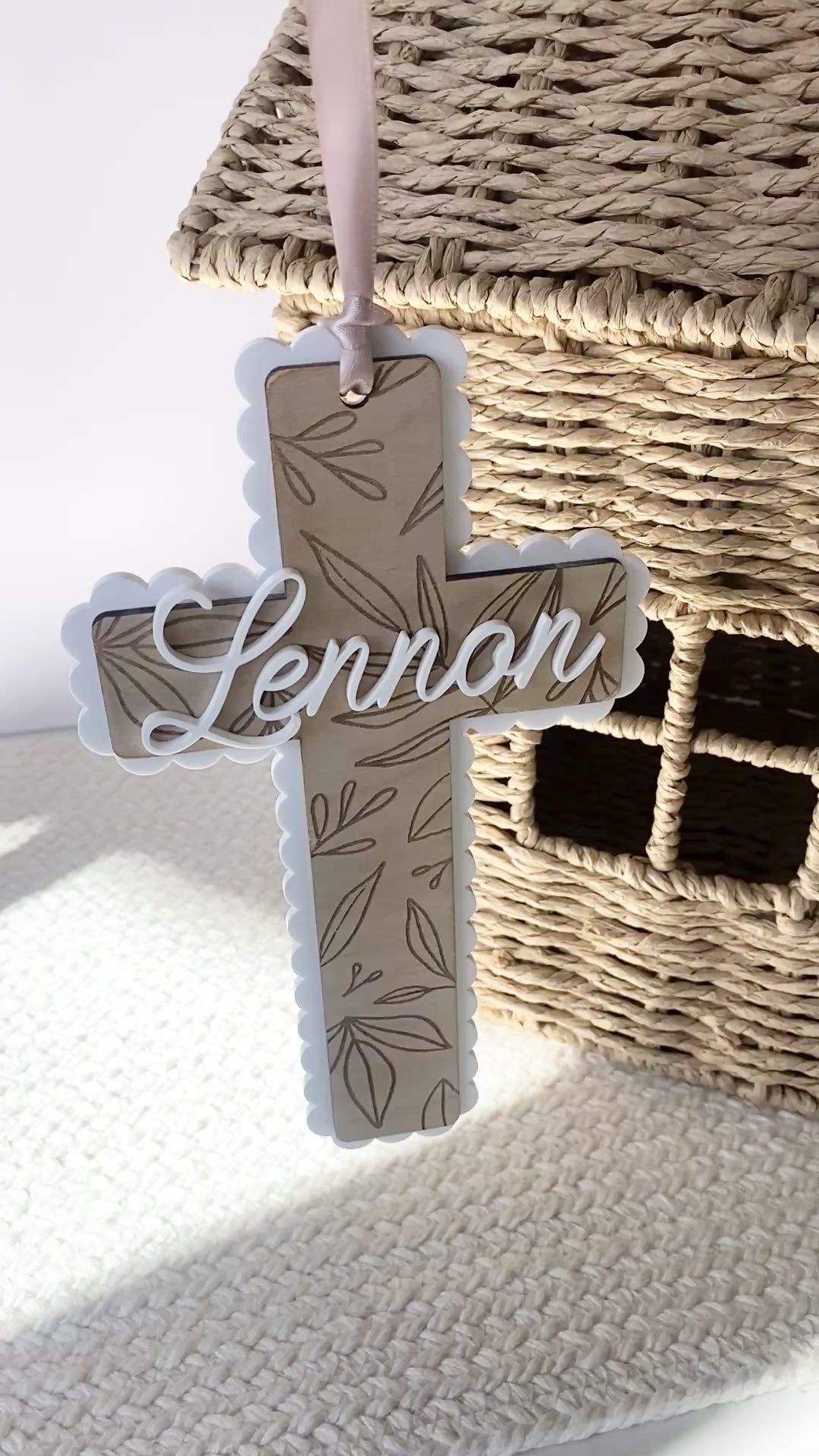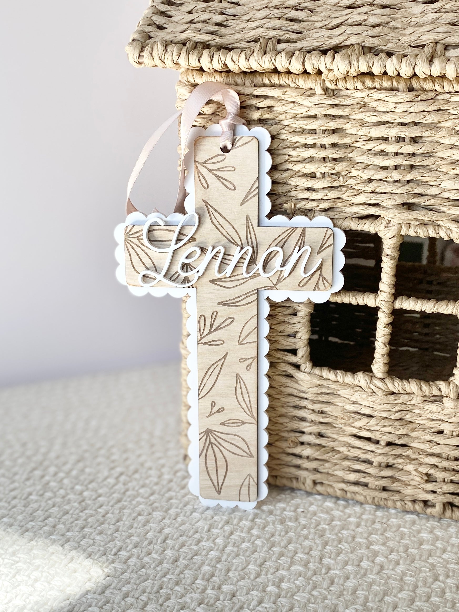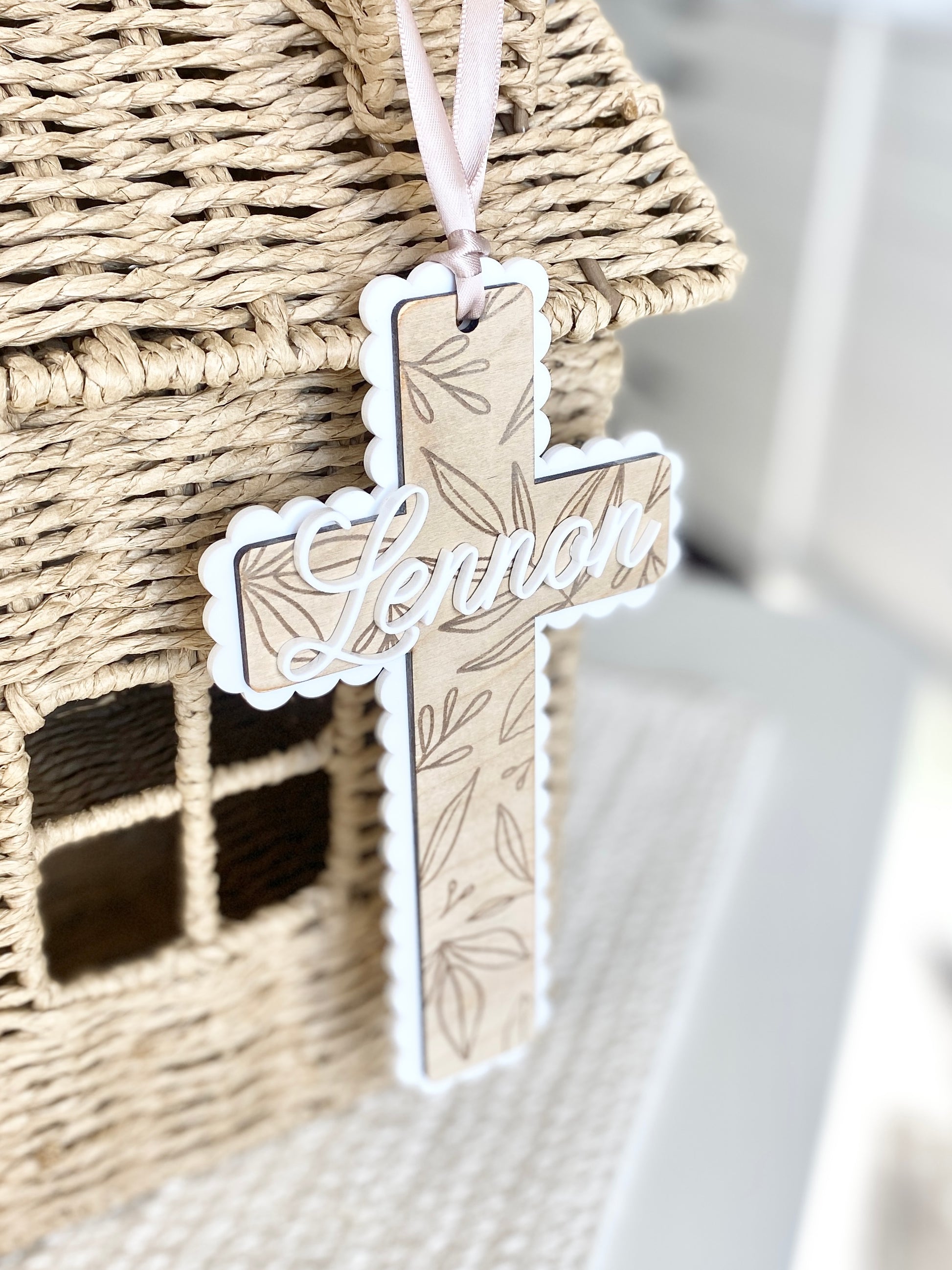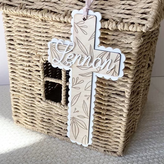 Bring warmth, faith, and beauty into any space with this handmade wooden cross, delicately engraved with leafy details and framed by a white acrylic scalloped border. A personalized name sits in the center, adding a heartfelt touch that makes each piece one-of-a-kind.