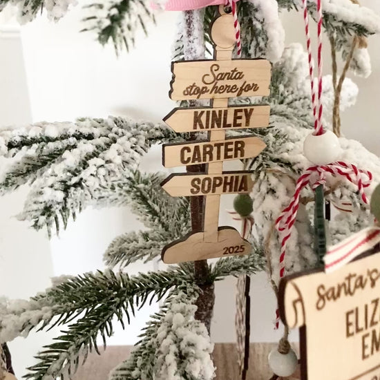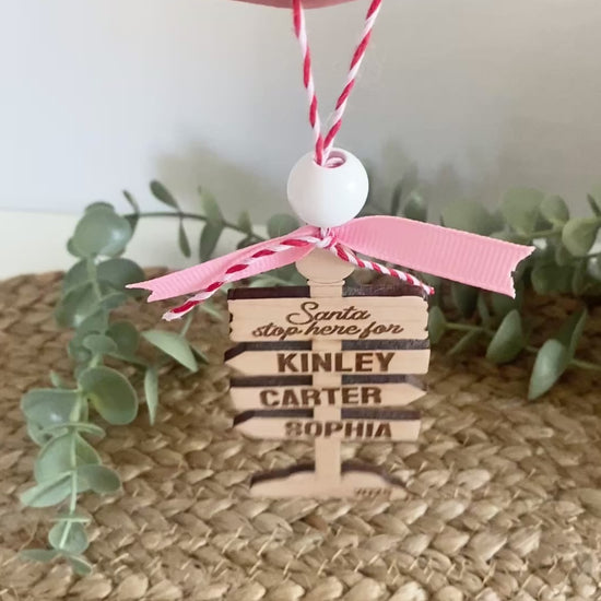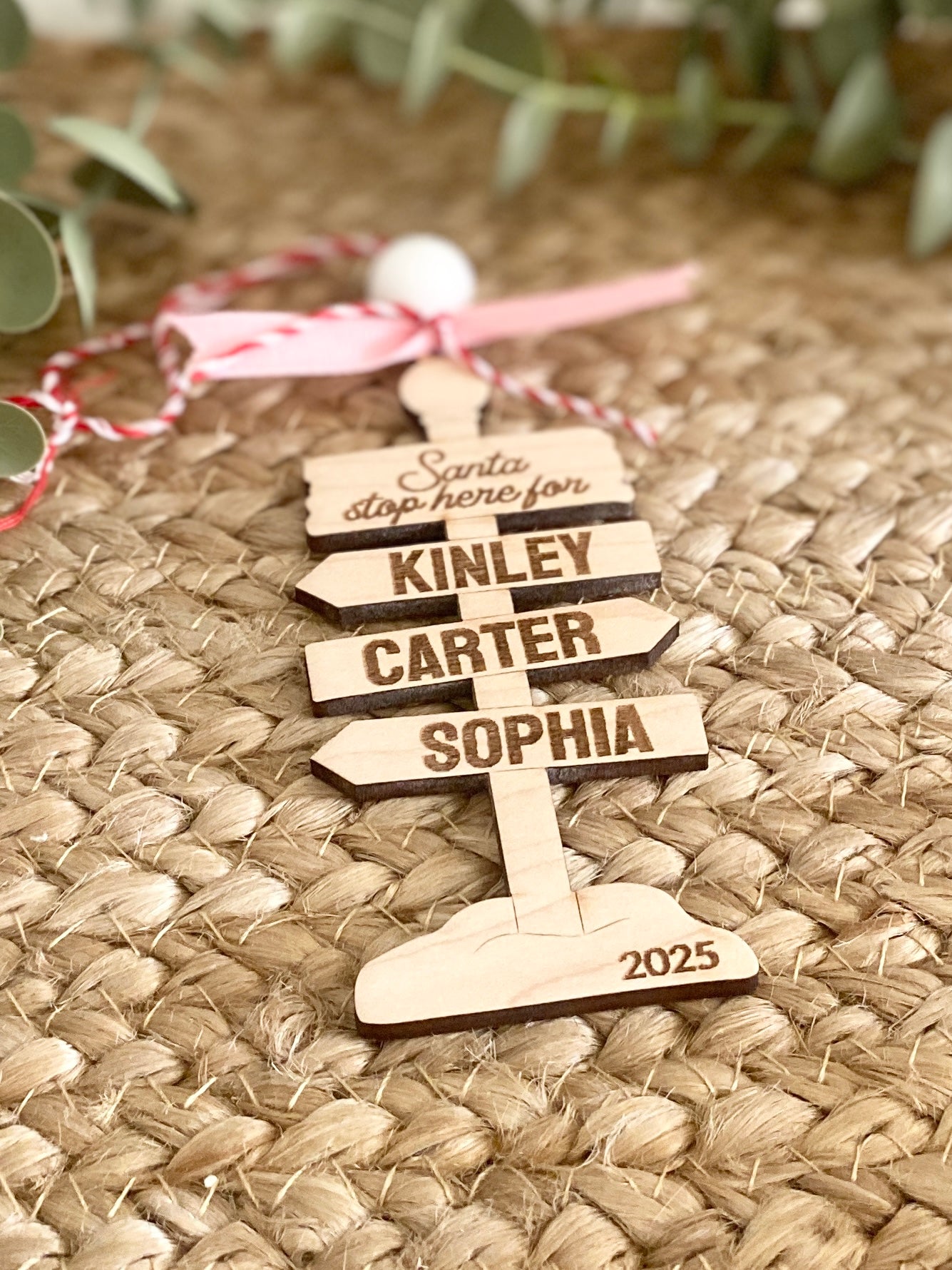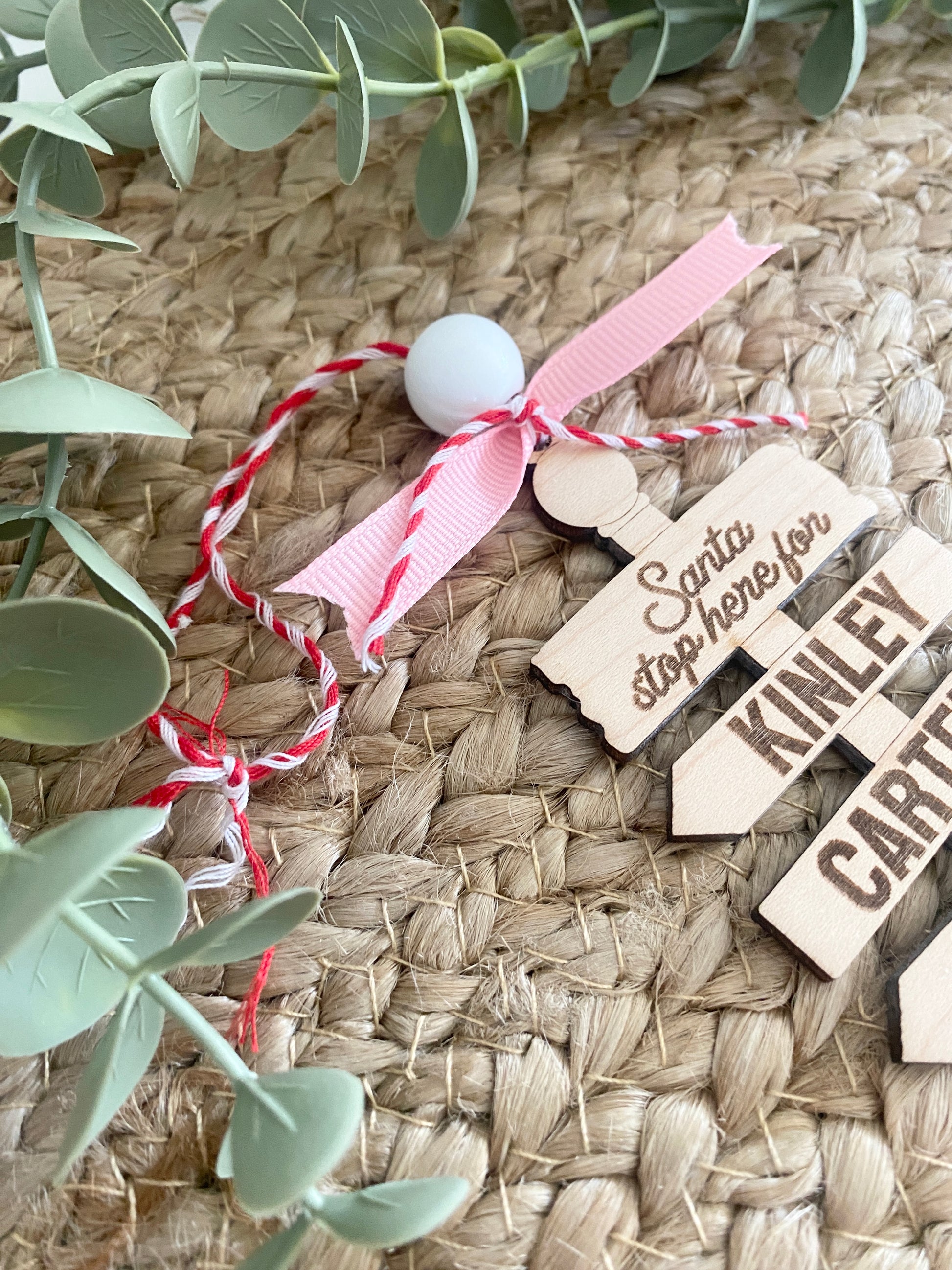 Make your holiday tree extra magical with this Personalized Santa Stop Here Ornament. Shaped like a festive wooden signpost, this unique ornament features engraved arrows pointing in different directions ~ each one personalized with the name of a child. At the top, a special sign reads “Santa Stop Here for”, while the year is engraved at the base for a keepsake that lasts a lifetime.