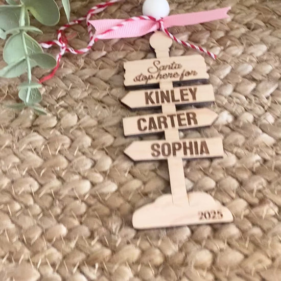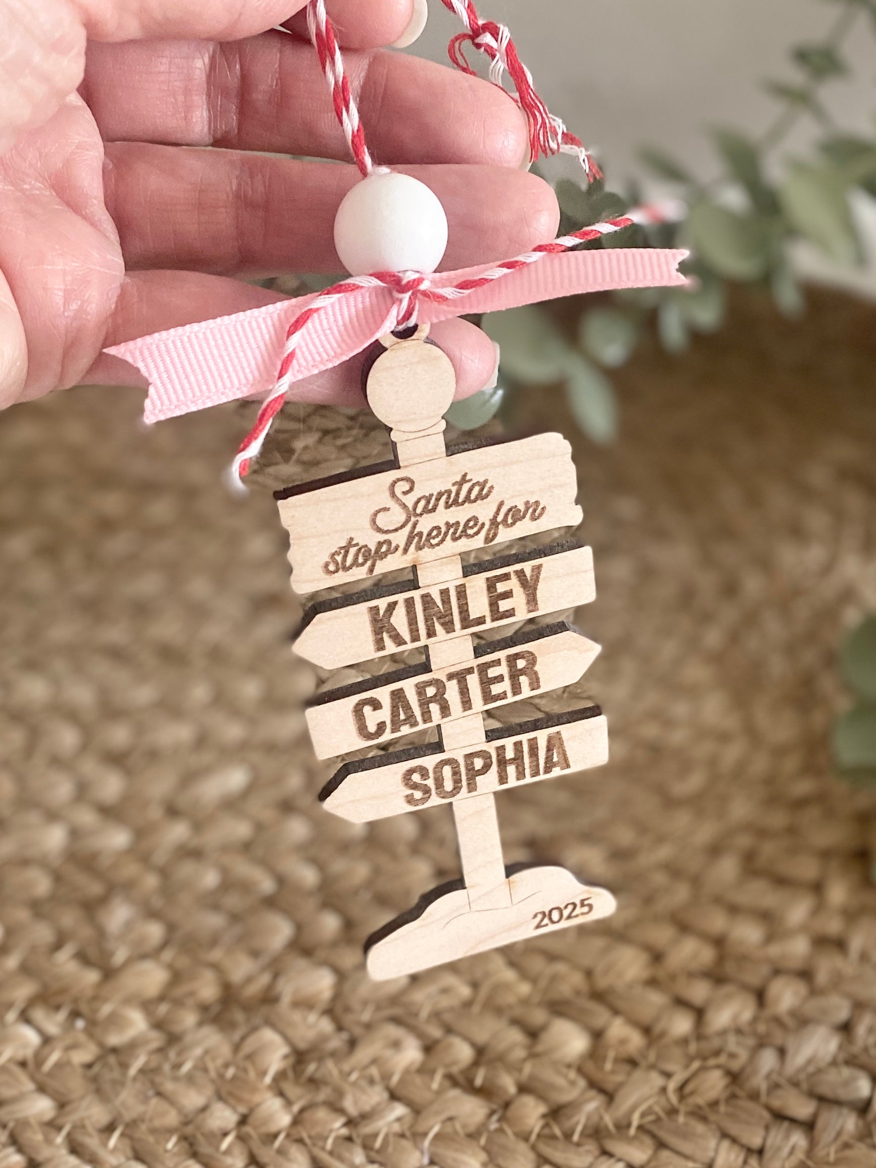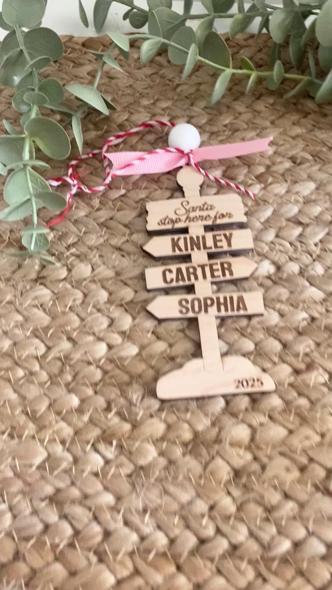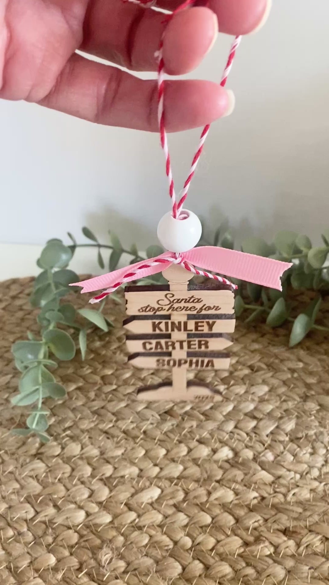 Handmade from natural wood and sanded for a smooth finish, it is tied with red & white baker’s twine, a pink or green ribbon, and a white bead, this ornament blends rustic charm with playful Christmas spirit. It can be customized with up to an unlimited number of names, making it perfect for families of all sizes.