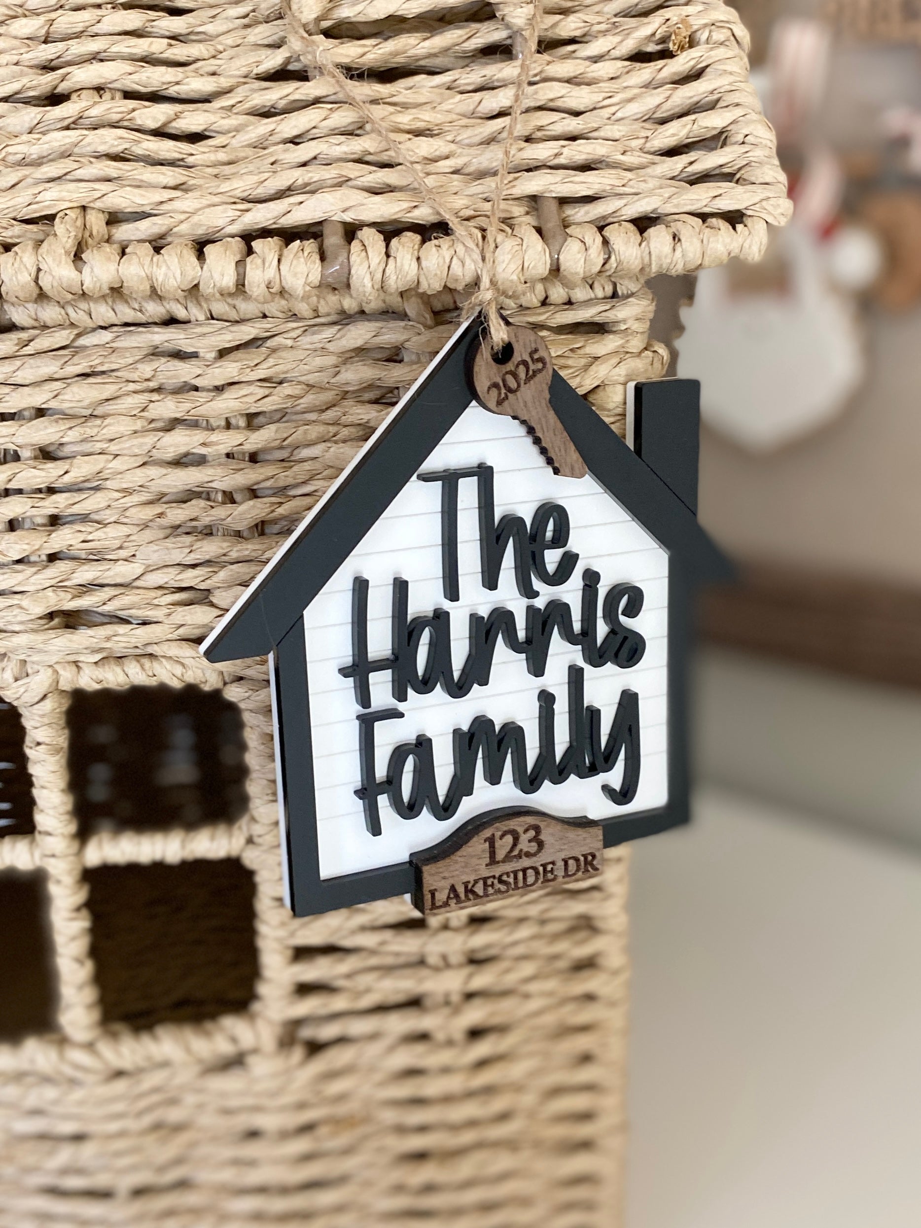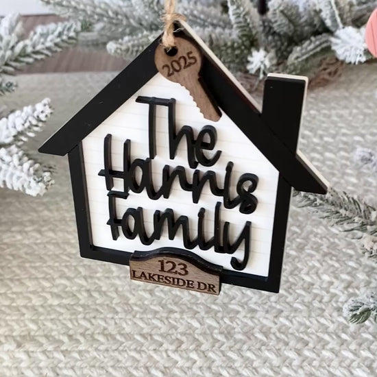 Shaped like a cozy house, this ornament is crafted from matte white acrylic with a black acrylic frame for a modern yet classic look. Each piece is personalized with your family name in raised acrylic lettering and your engraved address on a wooden plaque at the base. A mini wooden key engraved with the year sits at the top ~ a symbolic detail that celebrates the moment you found the place you now call home.