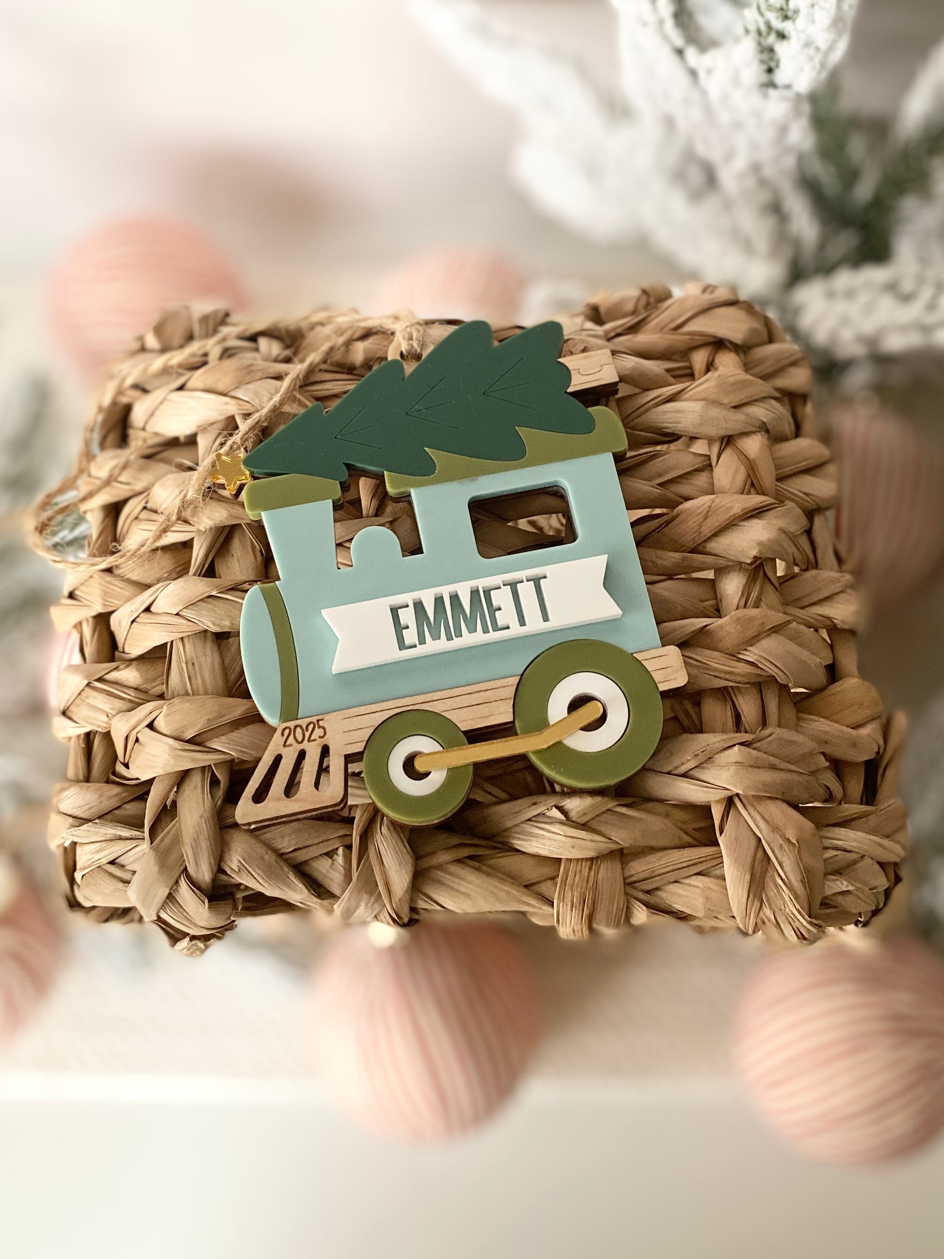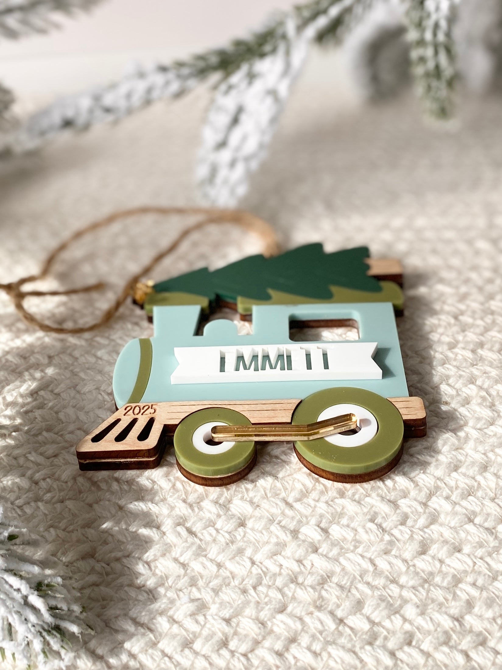 Make this holiday season unforgettable with our All Aboard Christmas Express Train Ornament! 🚂✨ Crafted from natural wood and matte acrylic, this sweet ornament features a festive train carrying a Christmas tree on top. The child’s name is cut from acrylic for a bold, playful touch, while the year is engraved in wood to mark this special season. Choose your color, pink or blue, and leave the rest up to us!
